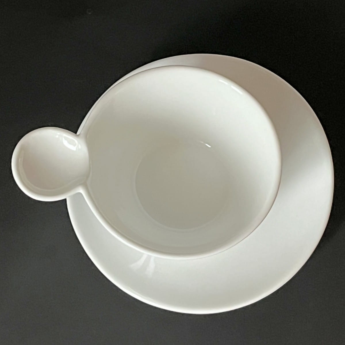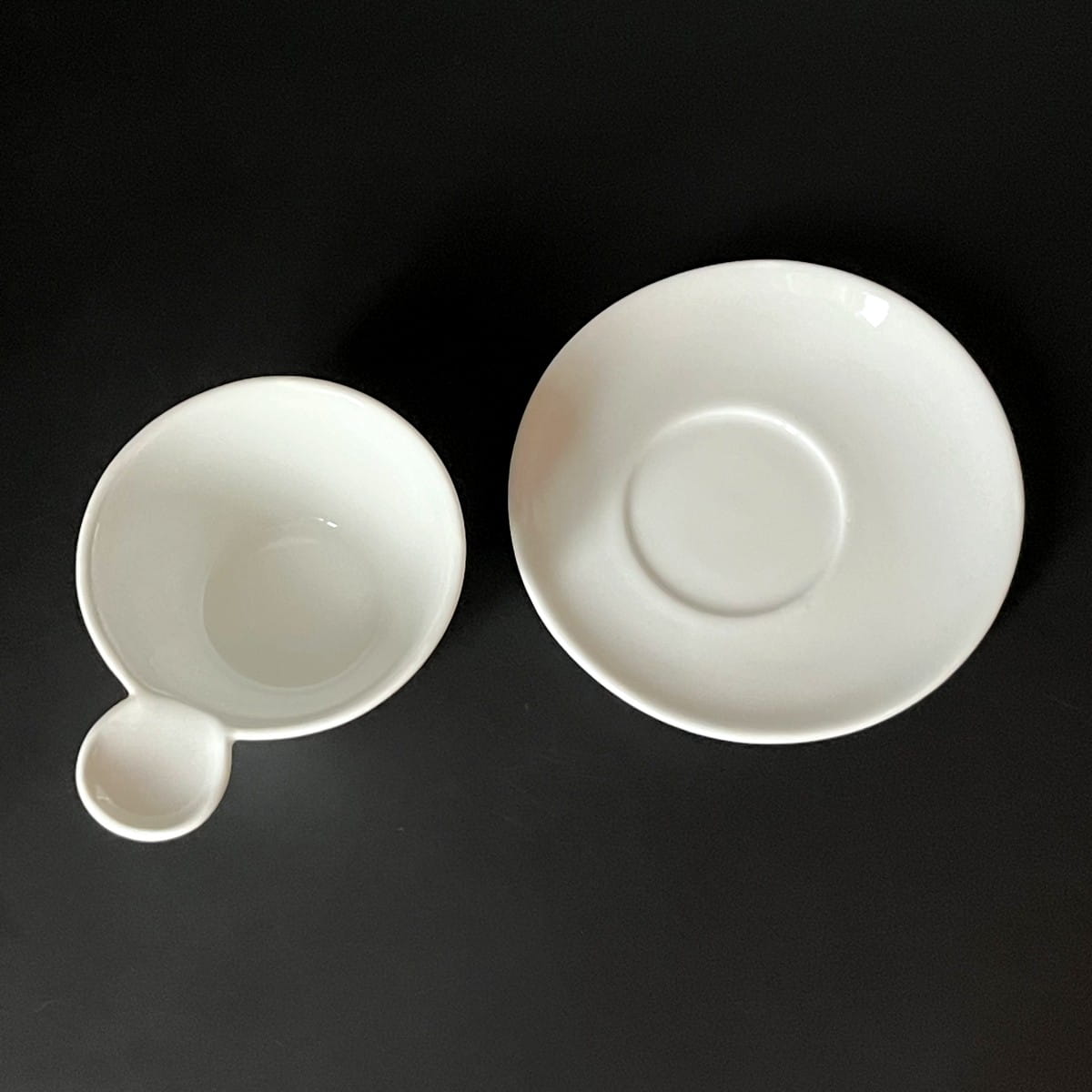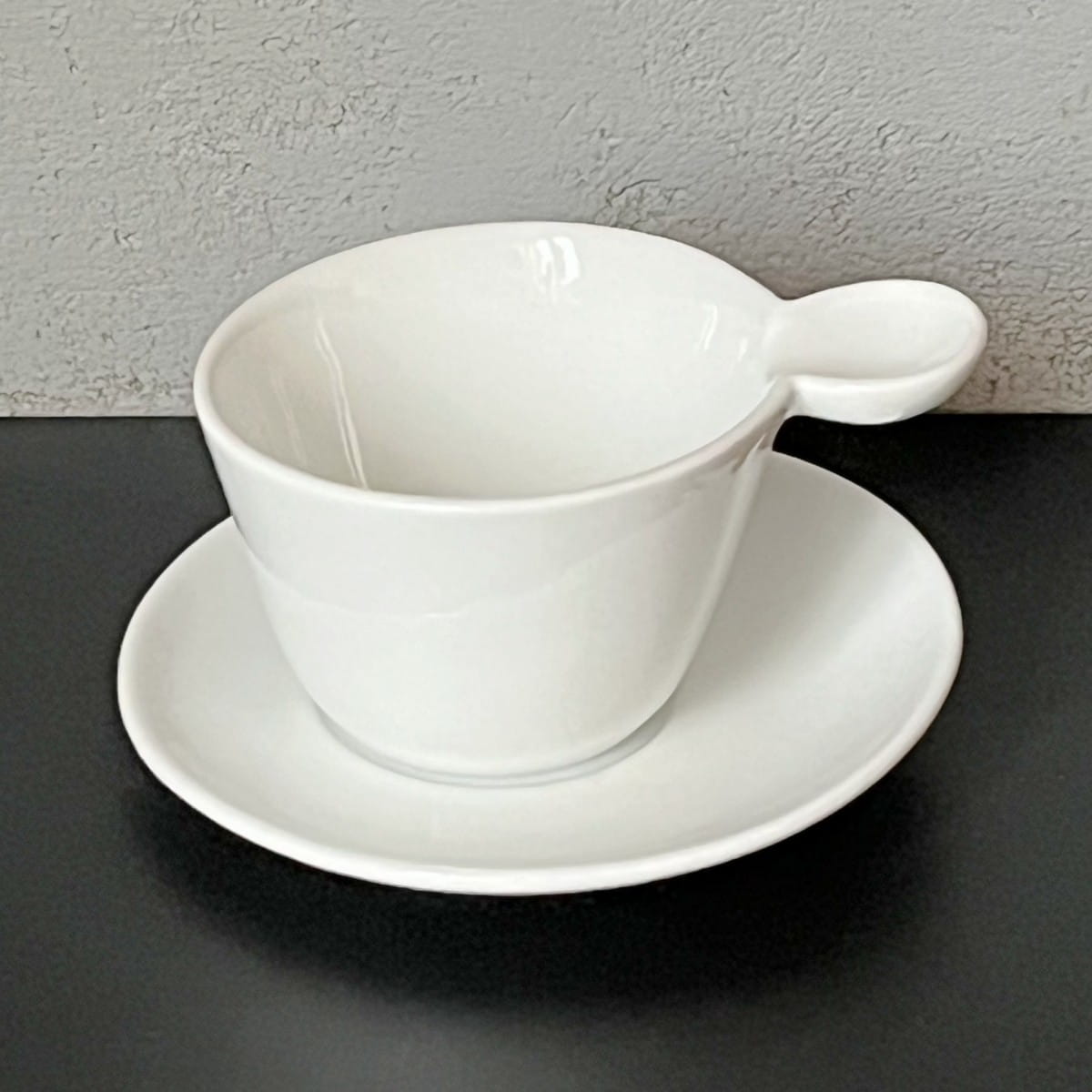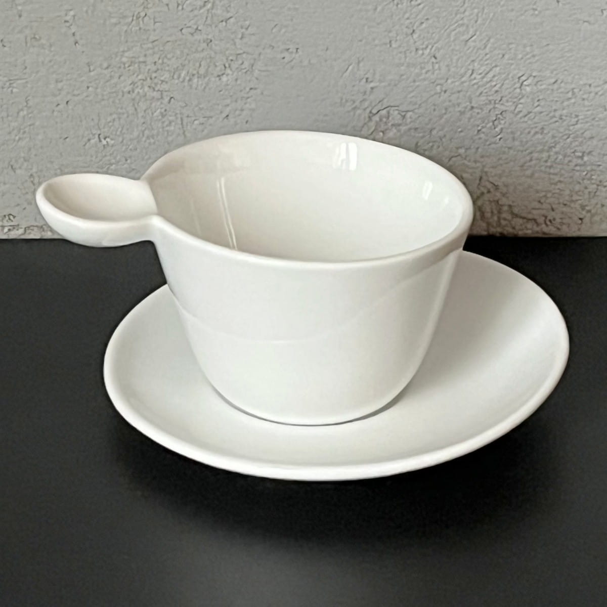 Filiżanka charakteryzuje się niekonwencjonalnym kształtem, klasycznym białym lśniącym szkliwieniem i ponadczasowym dizajnem. Z jednej strony wyżej uniesiony rant filiżanki płynnie przechodzi w wygodne ucho. Filiżanka ustawiona jest na spodku w sposób mimośrodowy. Spodek również unosi się z jednej strony. Ta dynamiczna forma nadaje kompletowi wyjątkowego charakteru. Całość robi zachwycające wrażenie.