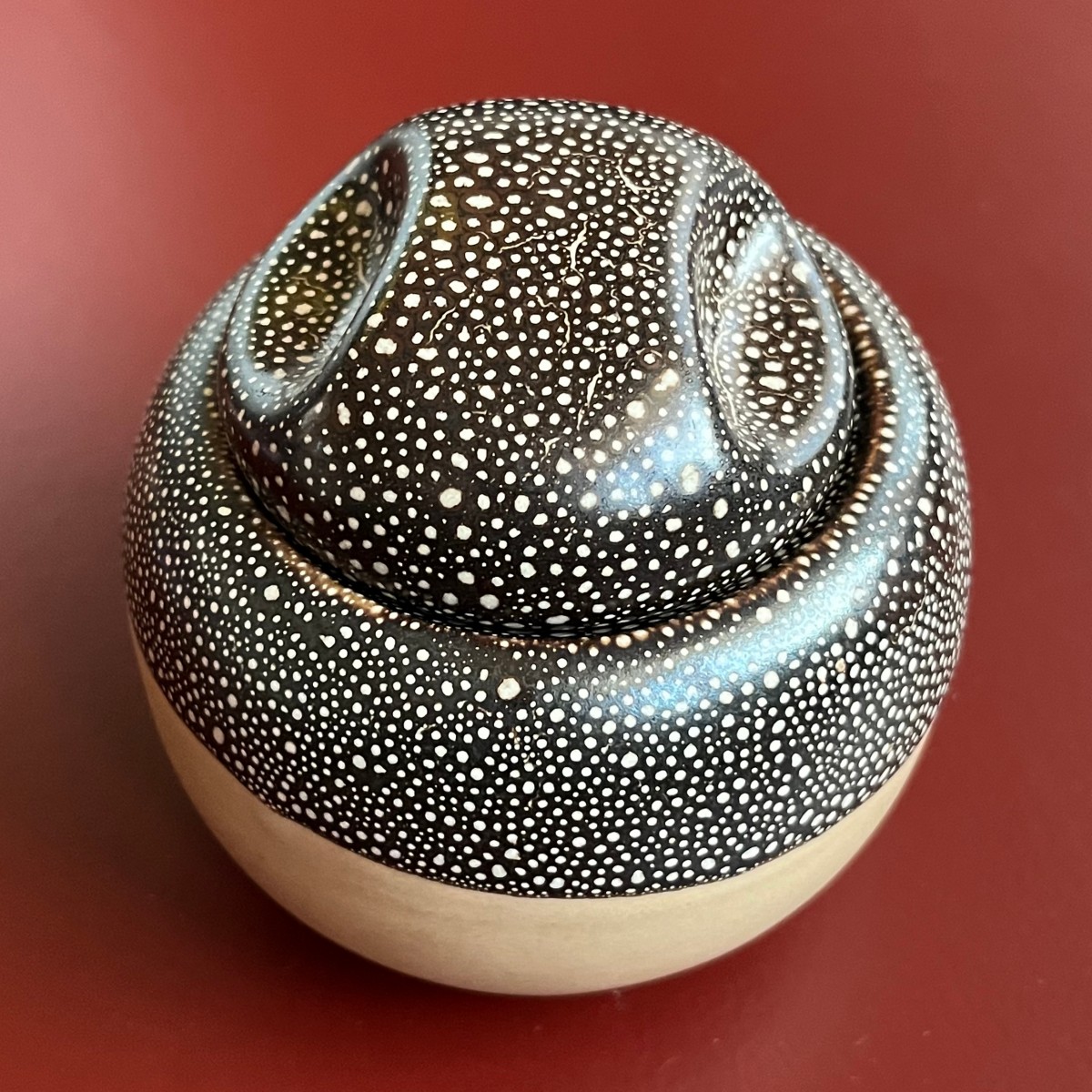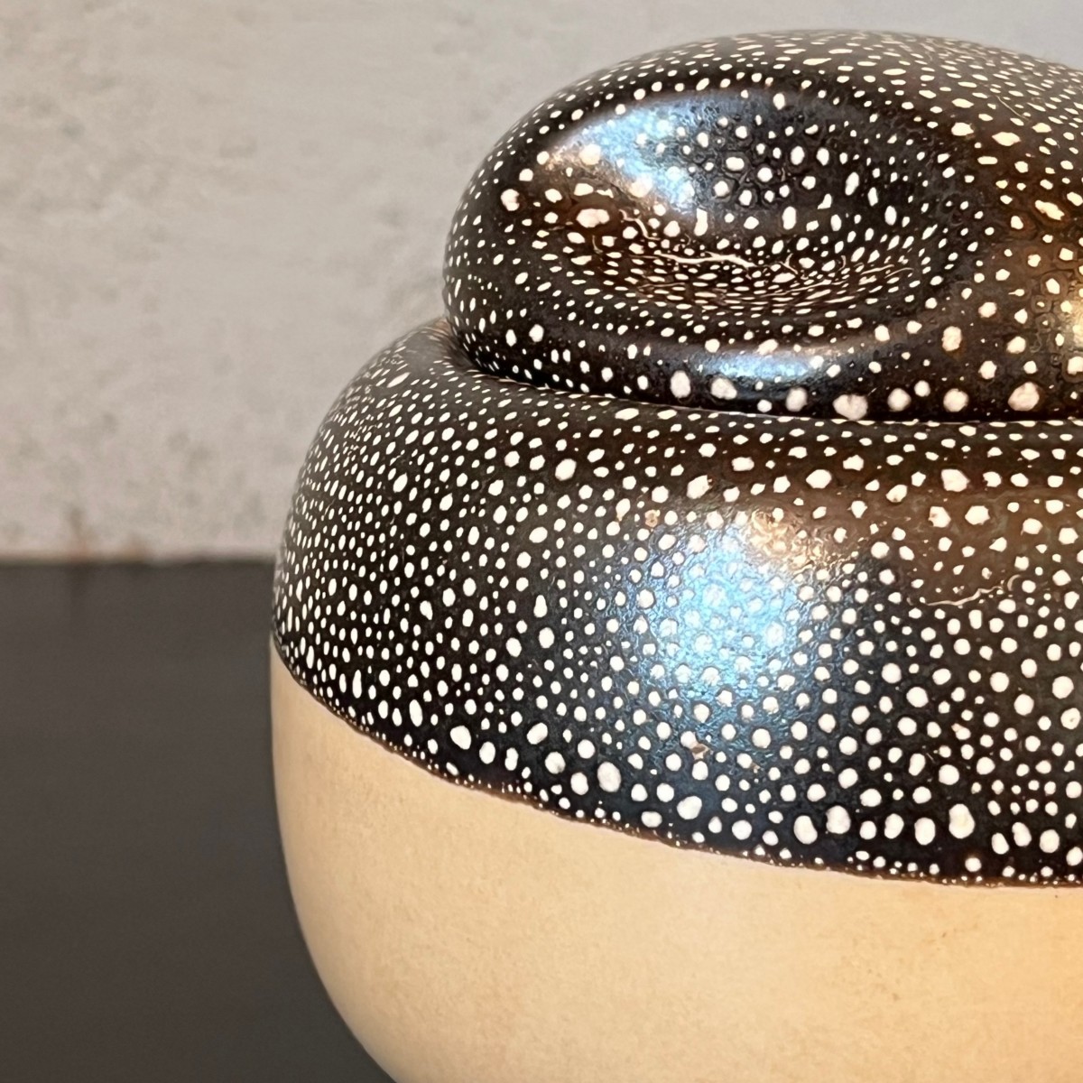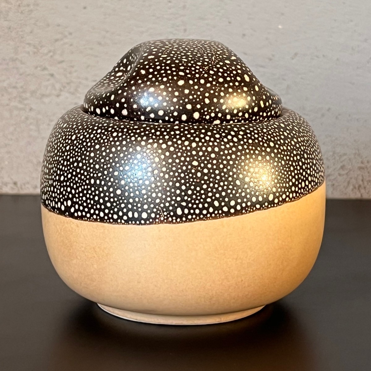 Okrągła ceramiczna wintydżowa cukierniczka.Model z wieczkiem w formie okrągłej kopułki z wgłębieniami ułatwiającymi otwieranie. Wykonana jest z beżowej ceramiki ozdobionej szkliwieniem w kolorze gorzkiej czekolady w jasne kropeczki.