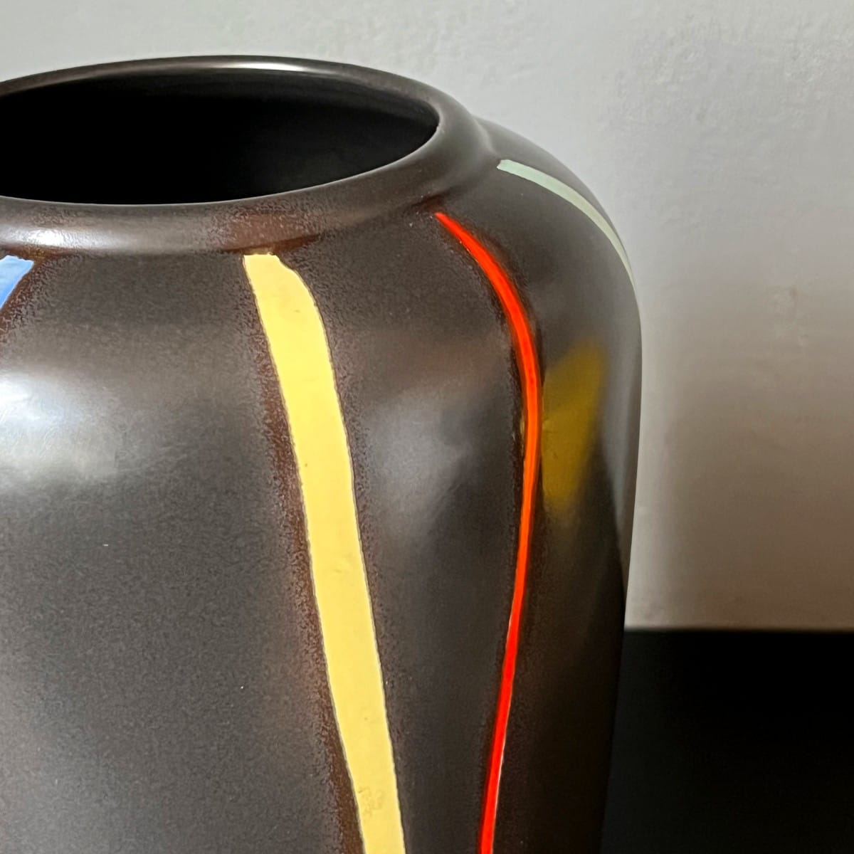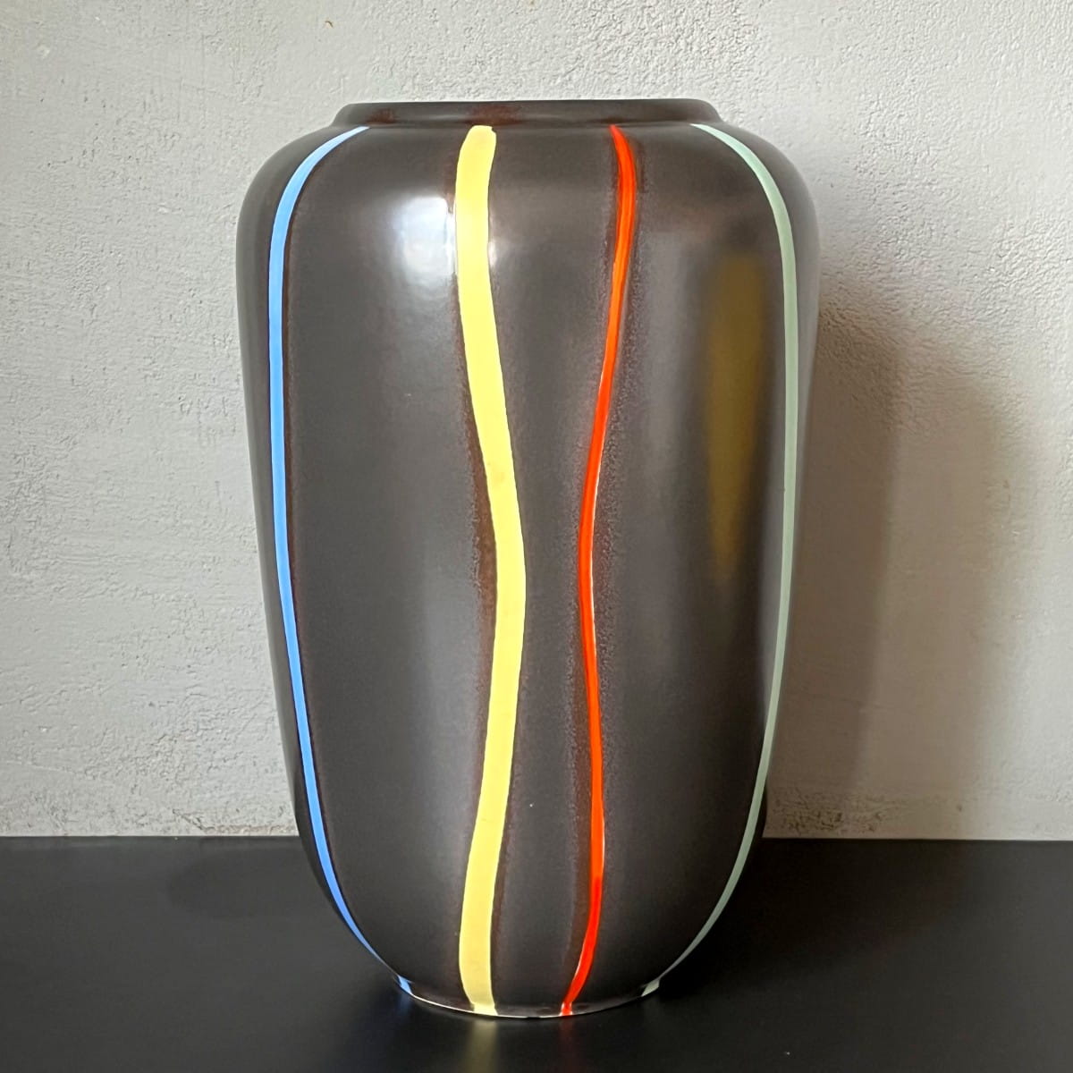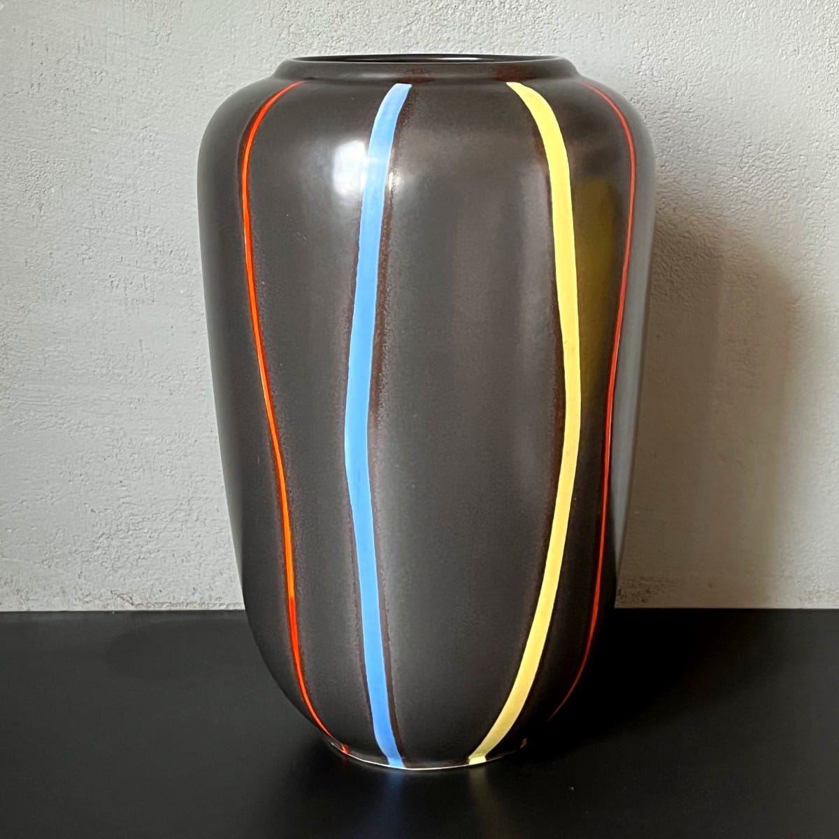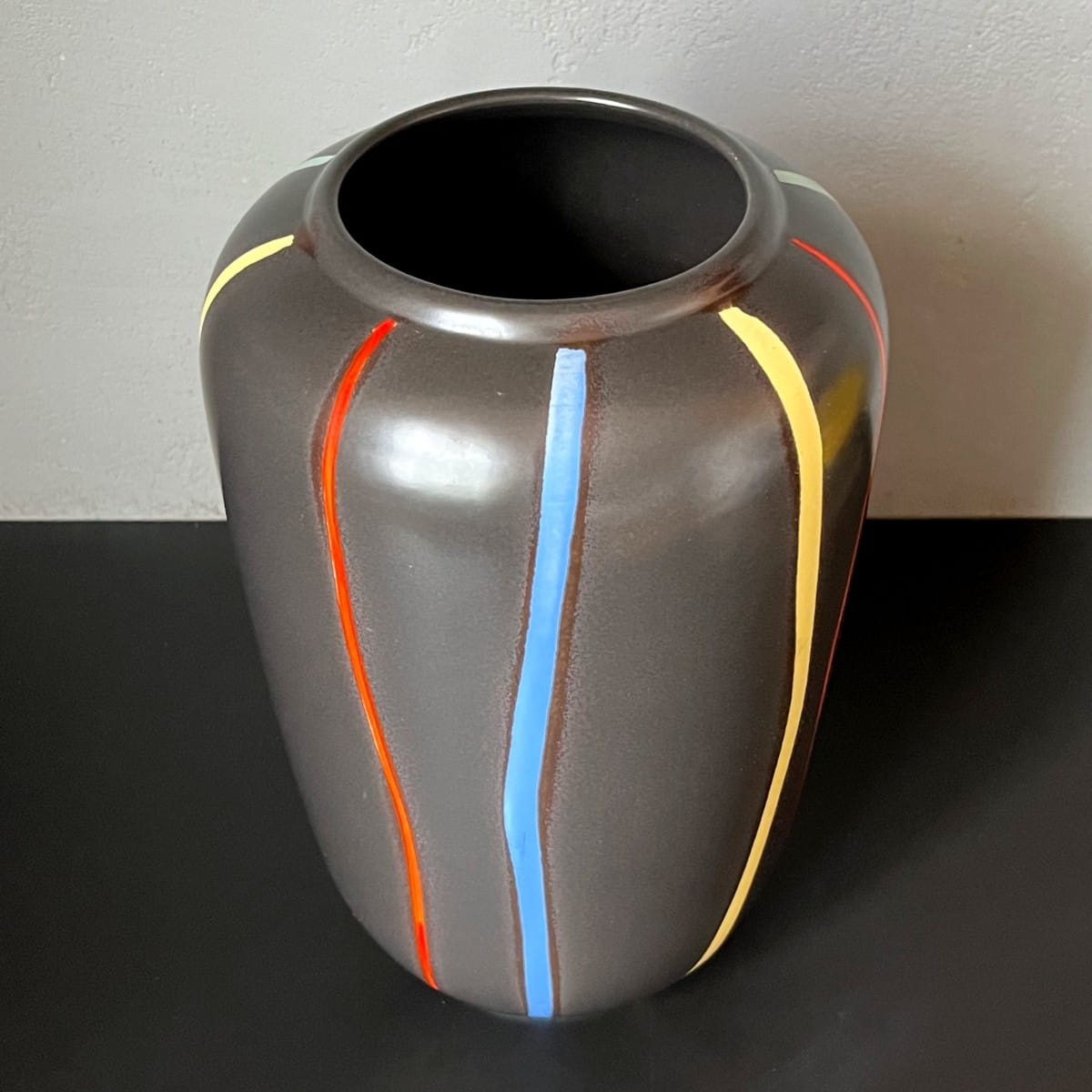 Ten pokaźnych rozmiarów wazon ma klasyczną formę. Pokryty jest matowym czarnym szkliwieniem. Ozdobiony pionowymi liniami w czterech kolorach: czerwonym, niebieskim, zielonym i żółtym. Utrzymany w pięknej tonacji. Wnętrze jednolite w kolorze czarnym.