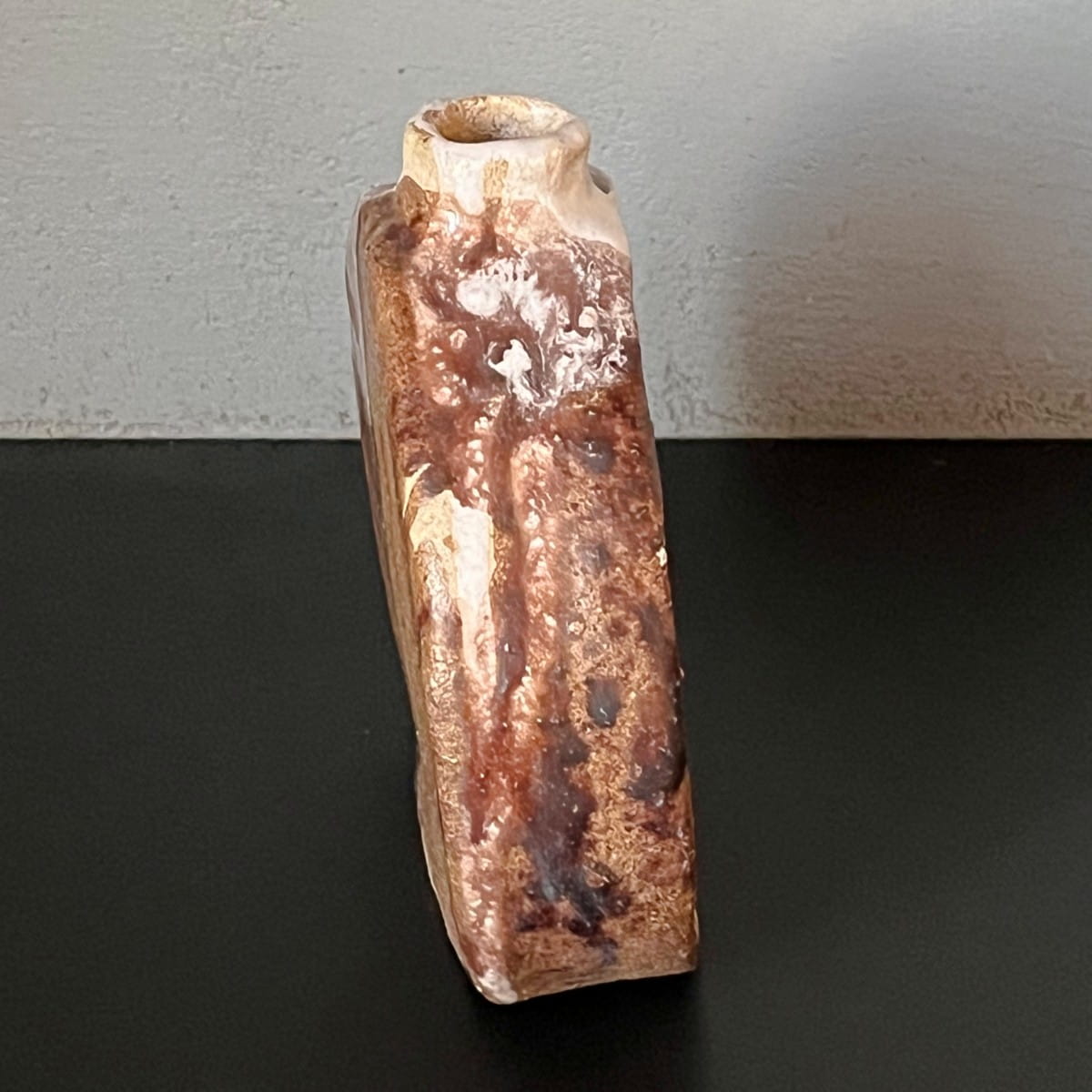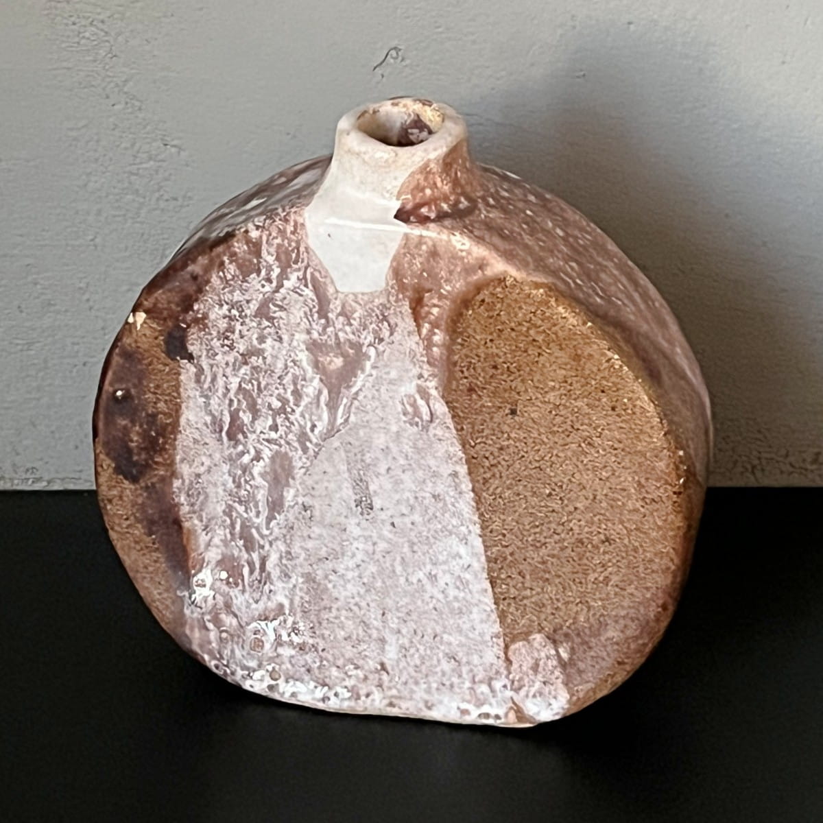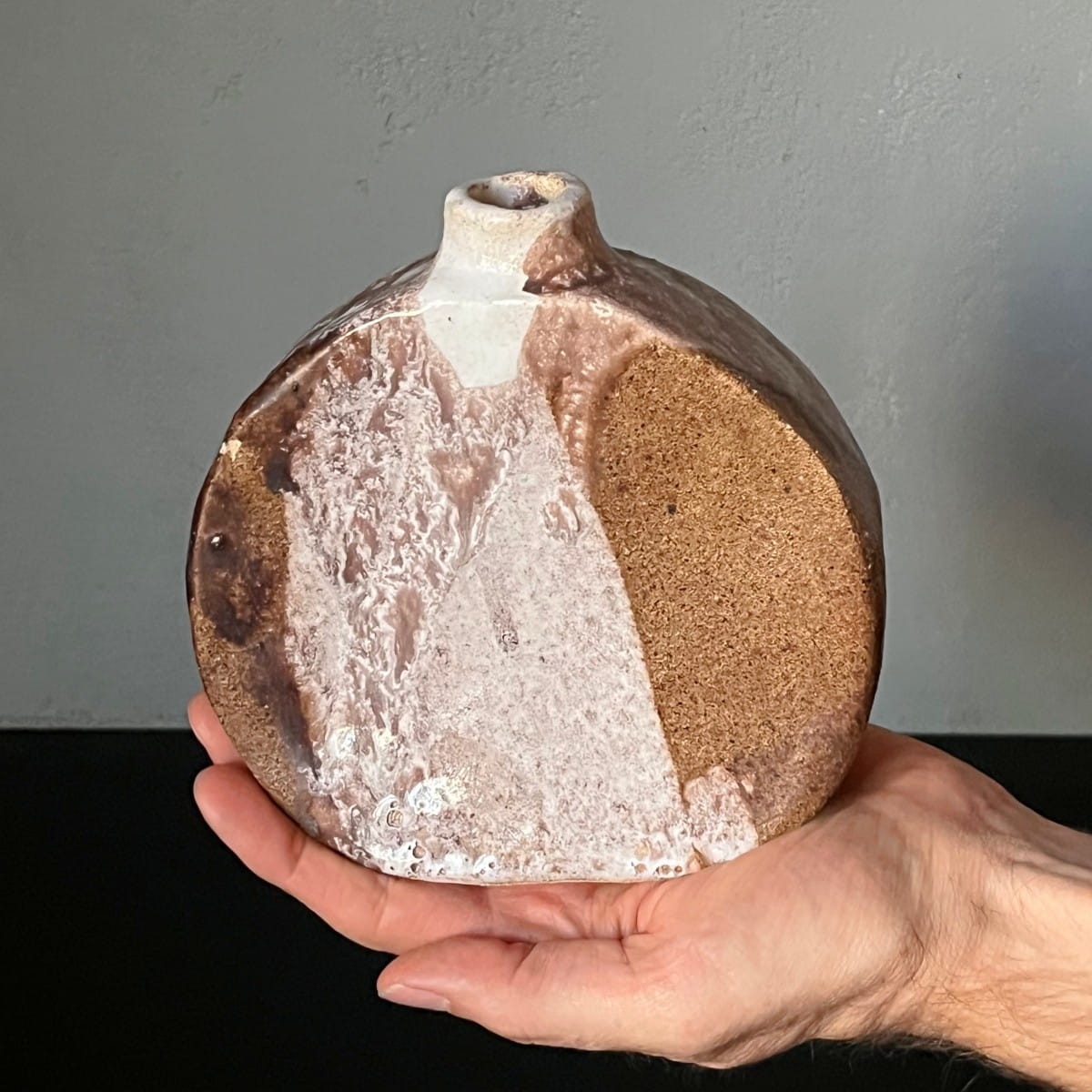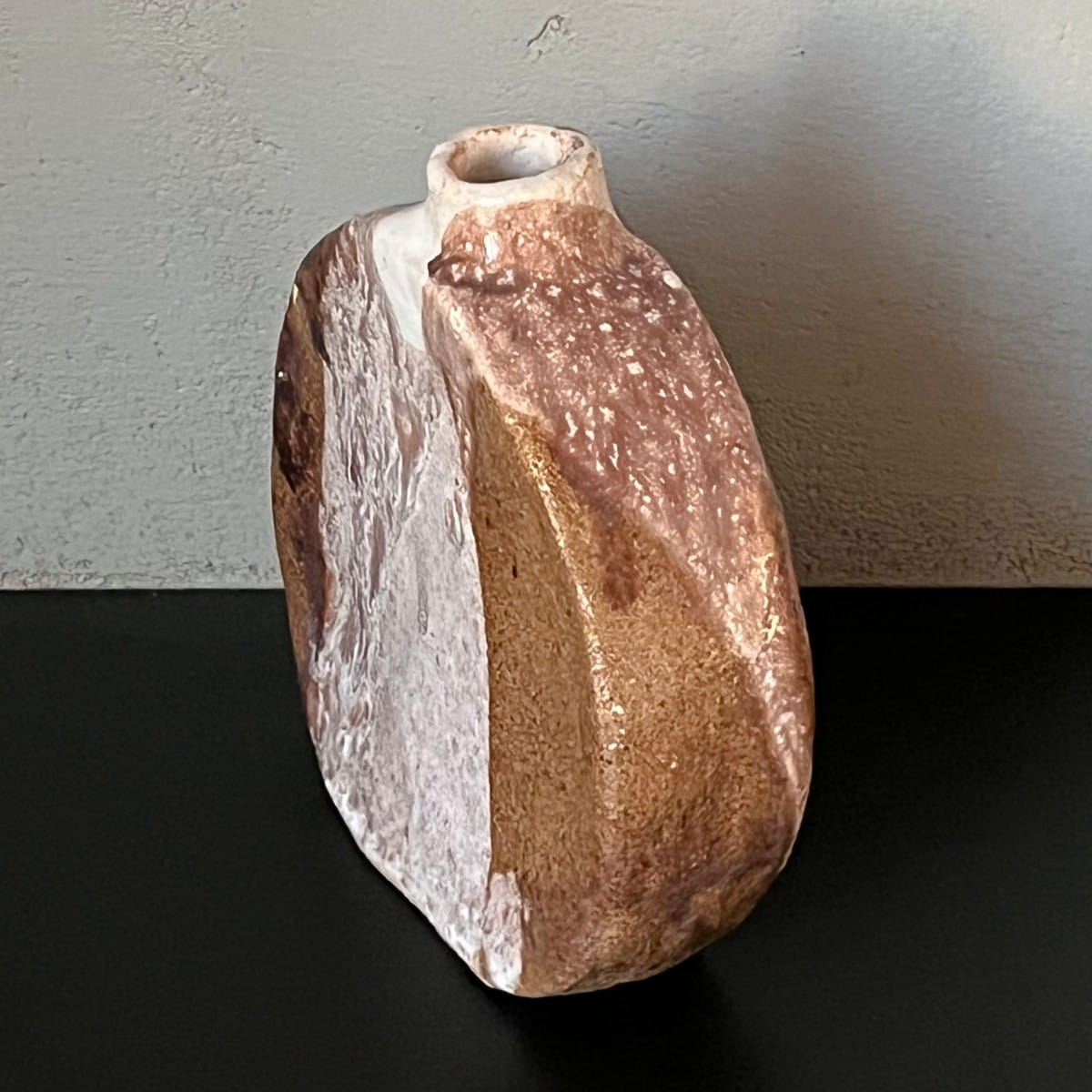 Niewielki, ręcznie wykonany wazon ceramiczny. Wazonik ma bardzo ciekawą okrągłą formę o nieregularnym kształcie. Jest pokryty niejednorodnym szkliwieniem. Miejscami chropowaty przypominający strukturę kamienia, miejscami gładki. Wnętrze jednolite w jasnym kolorze.