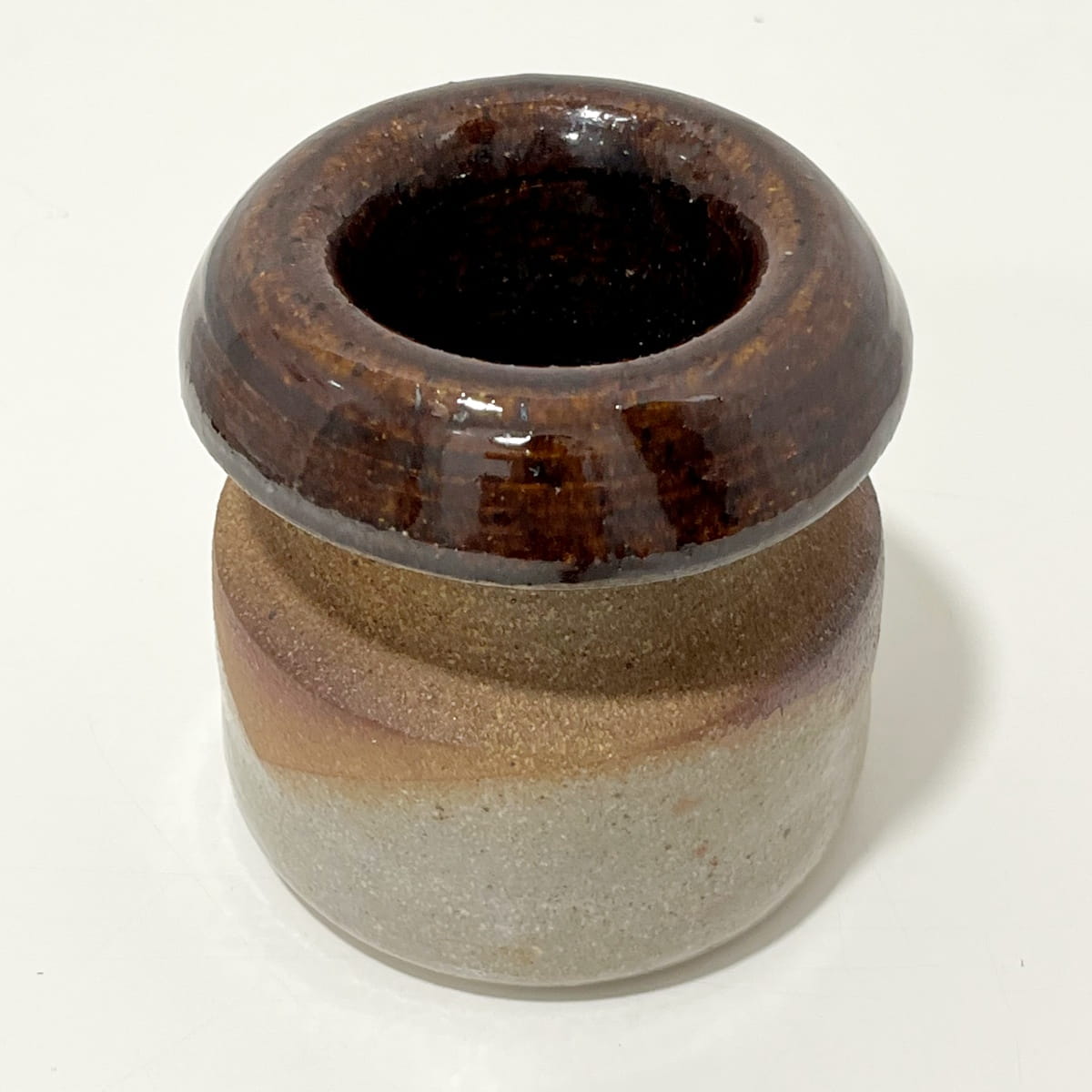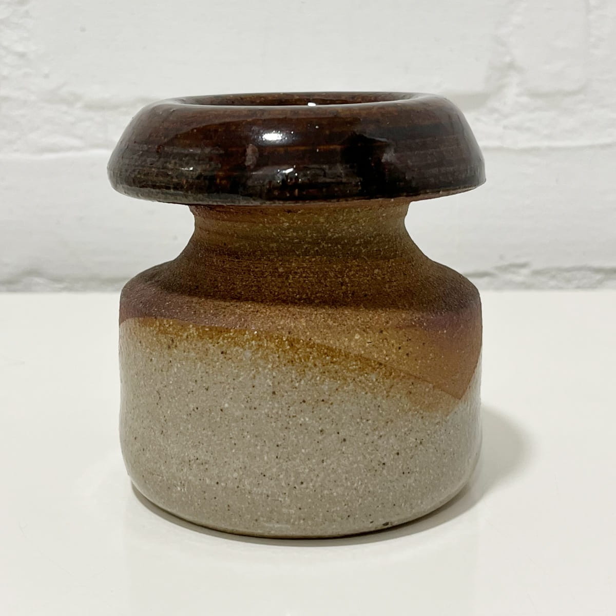 Niewielki, ręcznie wykonany wazon ceramiczny. Wazonik ma bardzo ciekawą formę o kształcie przypominającym grzybka. Jest pokryty niejednorodnym szkliwieniem. Wnętrze wazonika i wywinięta kołnierz-kapelusz są lśniące i gładkie, ciemnobrązowe. Natomiast na zewnątrz wazon ma powierzchnię szorstką i surową, w dotyku przypominającą naturalny kamień.