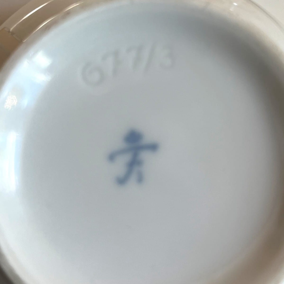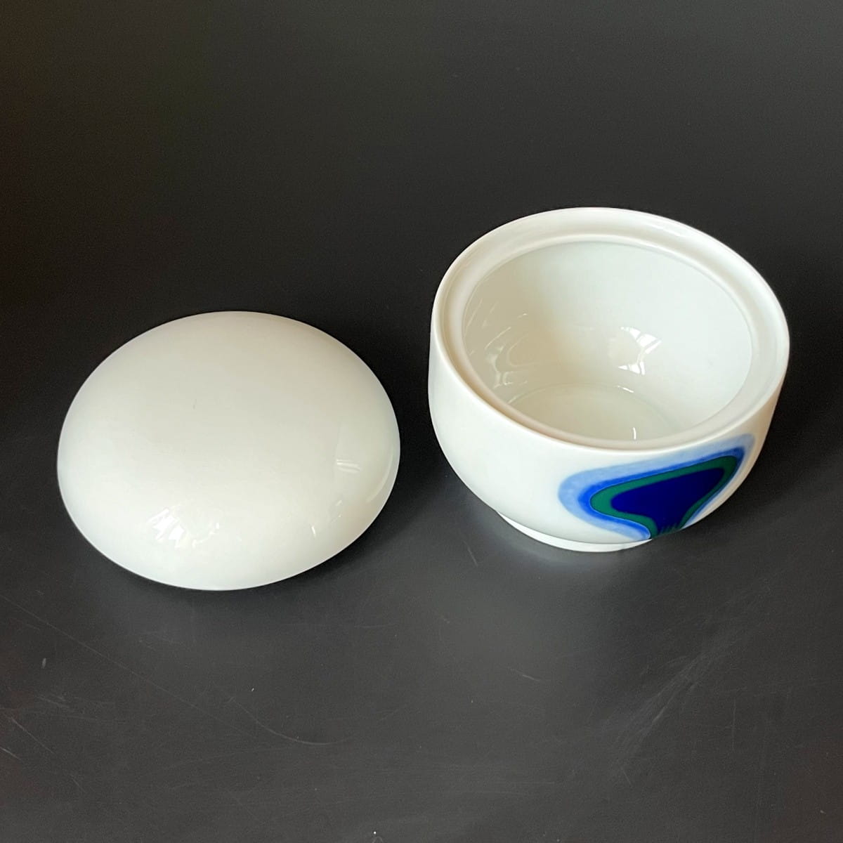 Porcelanowa cukierniczka z lat 70. pochodząca z niemieckiej manufaktury Fürstenberg, specjalizującej się w produkcji porcelany od 1747 roku. Seria Form F ze zdobieniem POP ART 1367 w formie niebieskiego kleksa przypominającego meduzę.