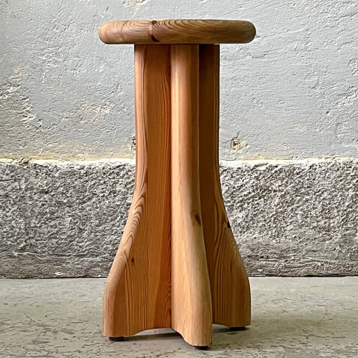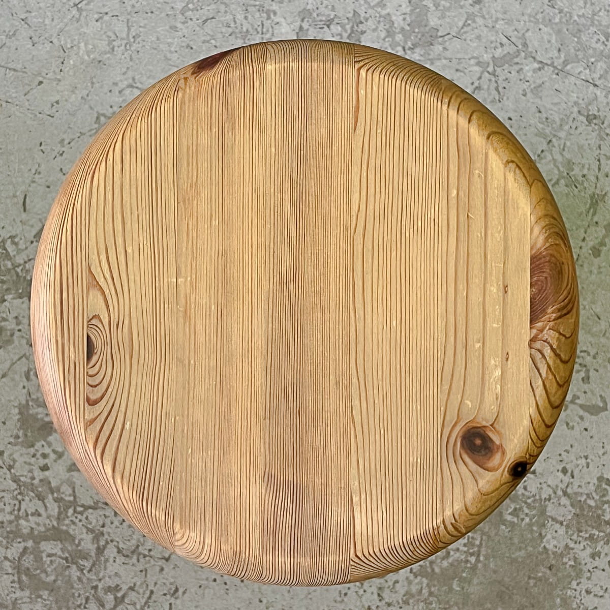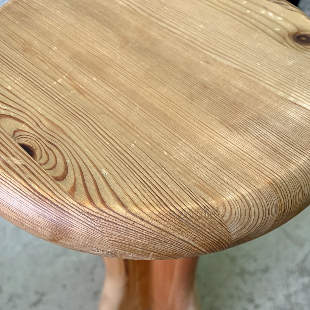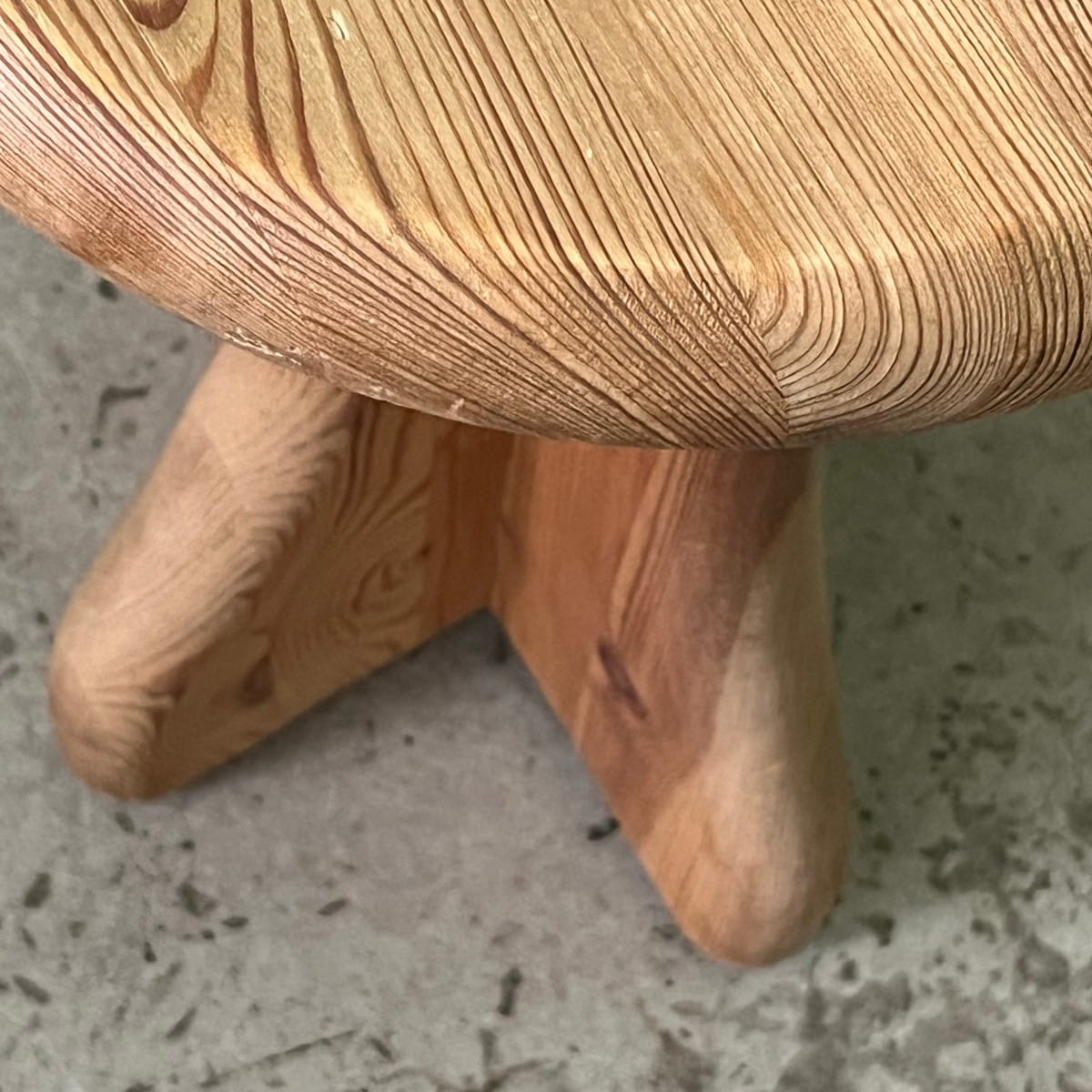 Stołek ma gładkie okrągłe siedzisko, osadzone na podstawie o przekroju krzyża. Ta krzyżakowa podstawa rozszerza u dołu, tworząc coś w rodzaju lotek. co zapewnia stabilność konstrukcji. Całość wykonana jest z kawałków drewna jednakowej grubości, co sprawia, że ten niewielki rozmiarowo przedmiot to naprawdę solidny mebel. Prawdopodobnie do jego wykonania zastosowano drewno sosnowe, które charakteryzuje się jasną barwą i widocznymi słojami. Ich wyraźny rysunek solidności i podkreśla naturalne piękno drewna i naturalny charakter stołka.