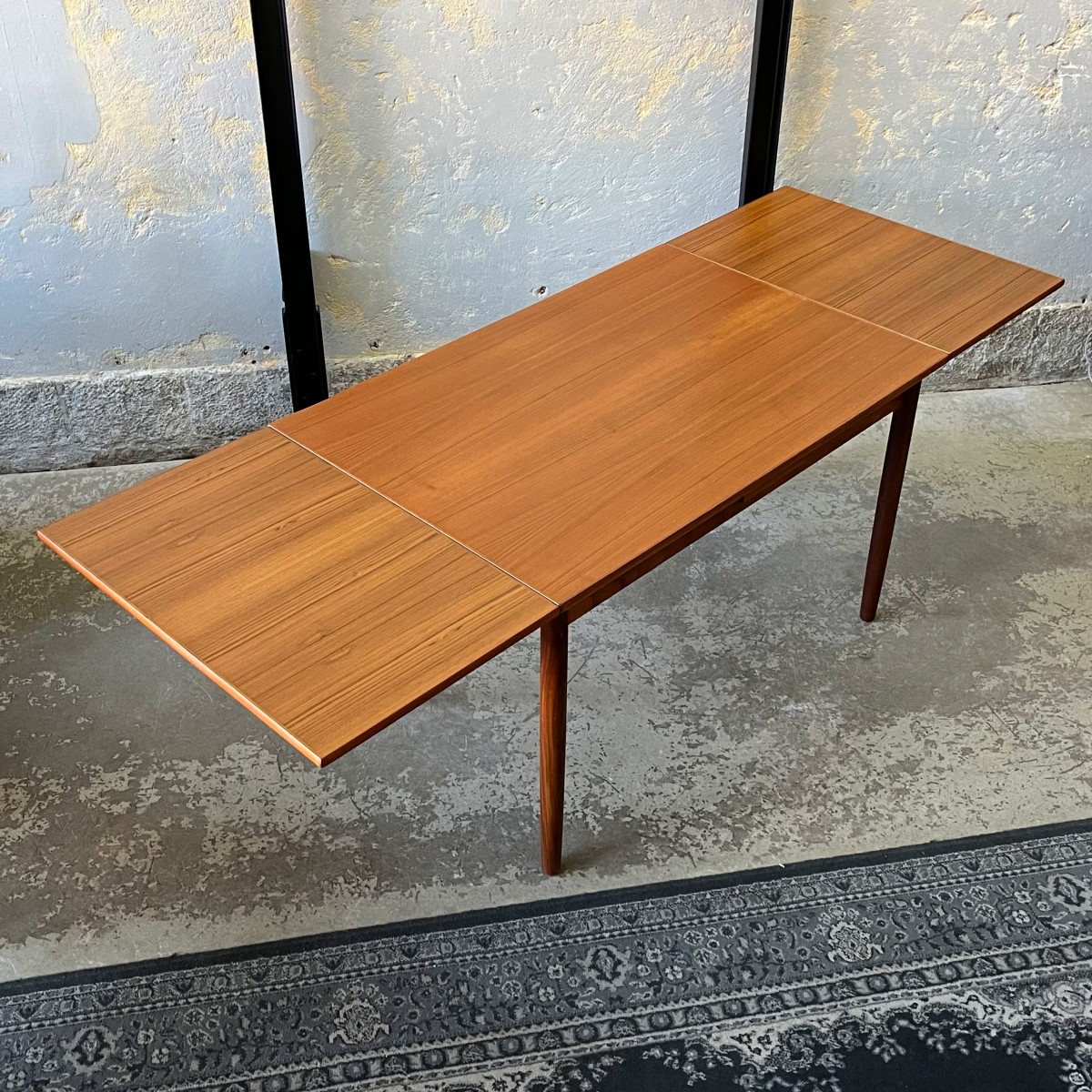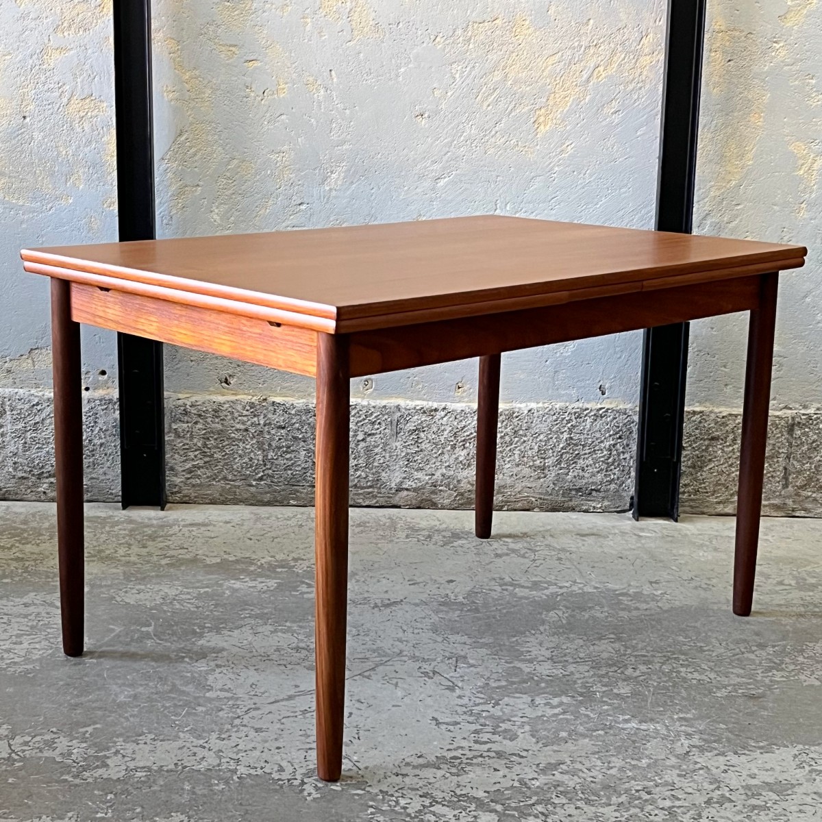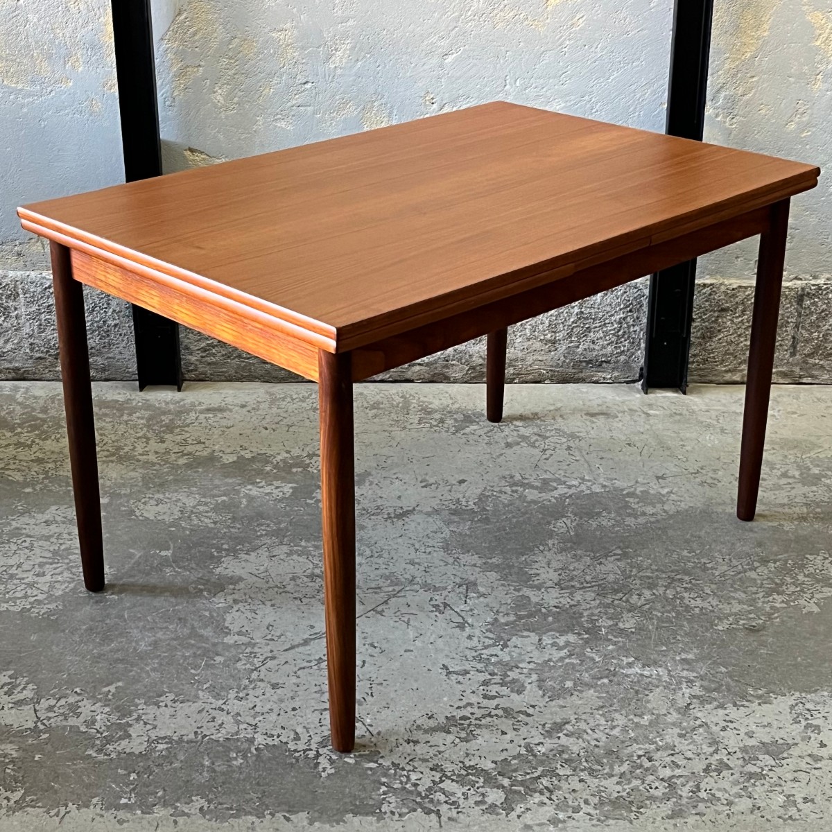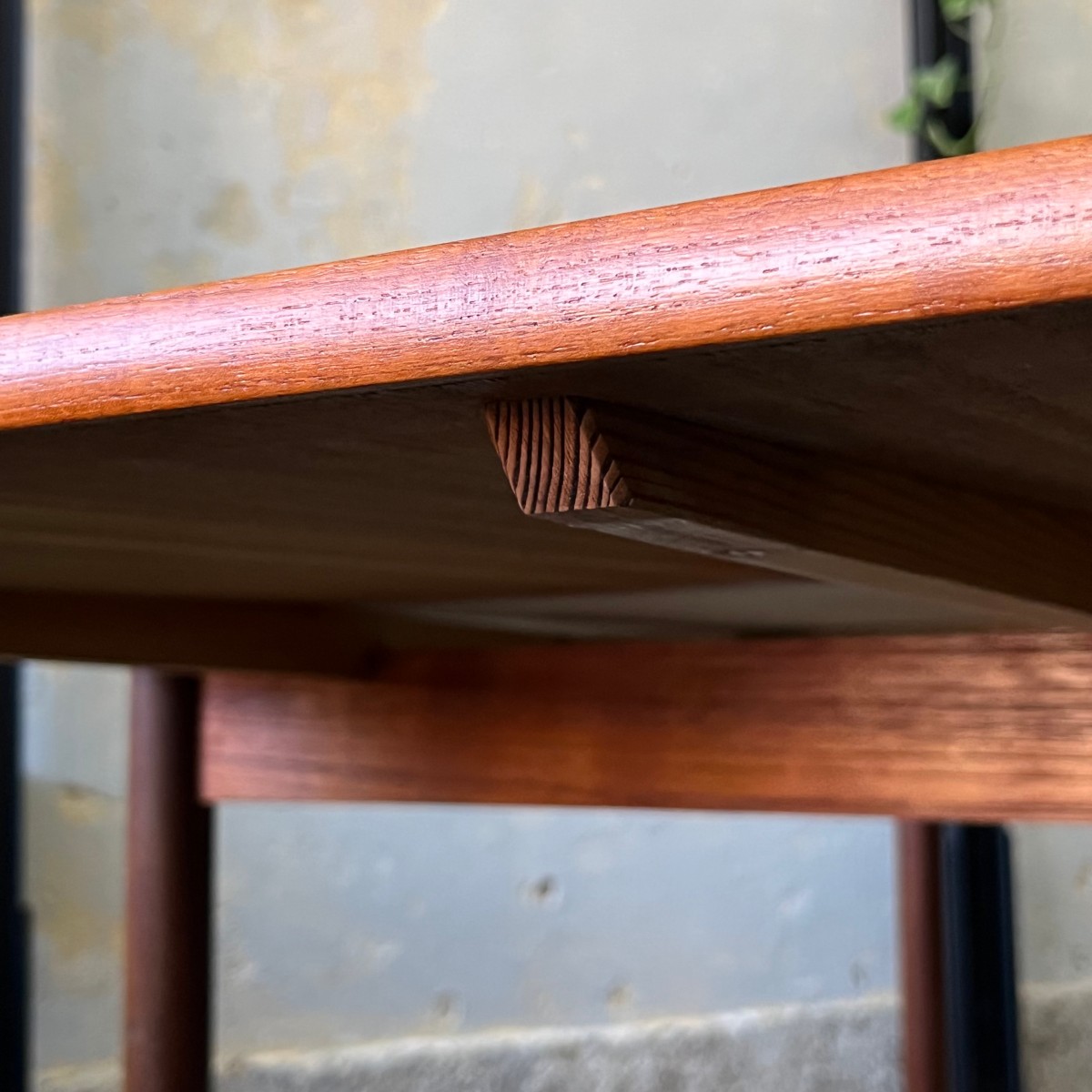 Duży klasyczny tekowy stół jadalniany z opcją rozkładania. Wyprodukowany w Danii latach 60. lub 70. dwudziestego wieku. Blat i konstrukcja pokryte są fornirem z drewna tekowego, natomiast nogi wykonane są z litego drewna. Do produkcji stołu użyto drewna tekowego w ciepłym miodowym odcieniu z ładnym usłojeniem.