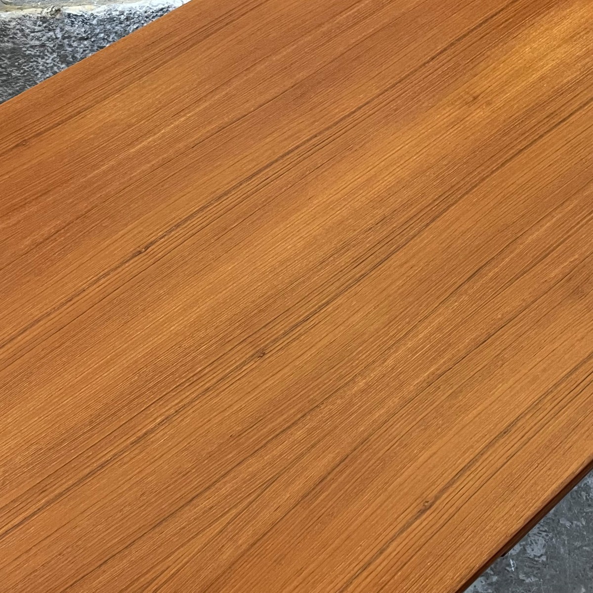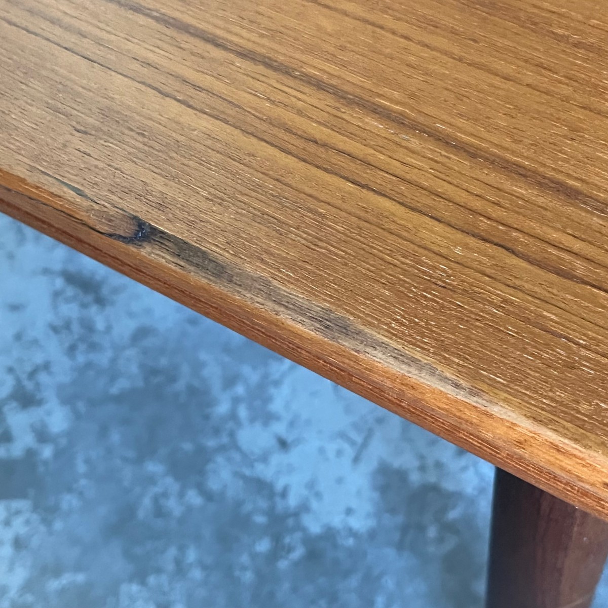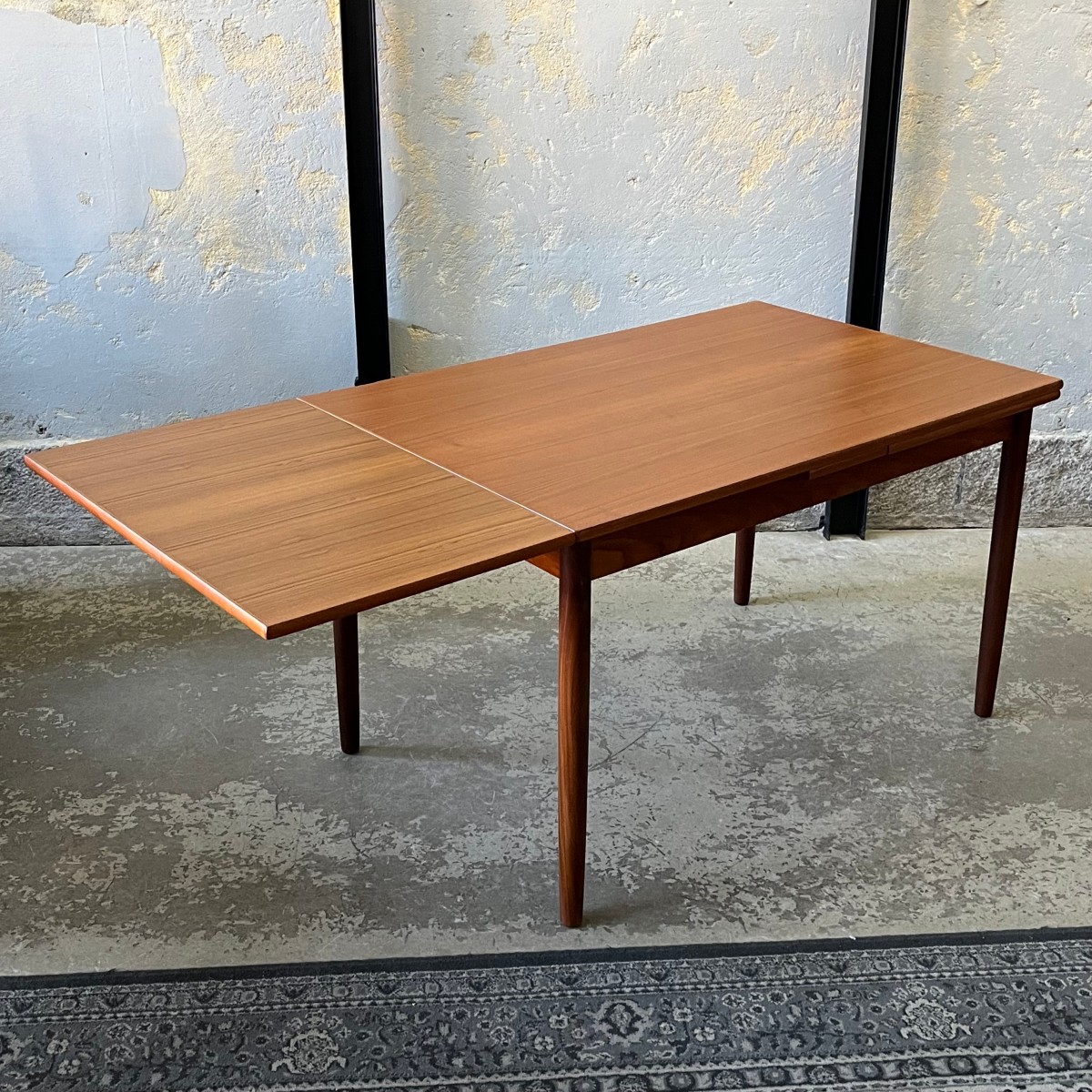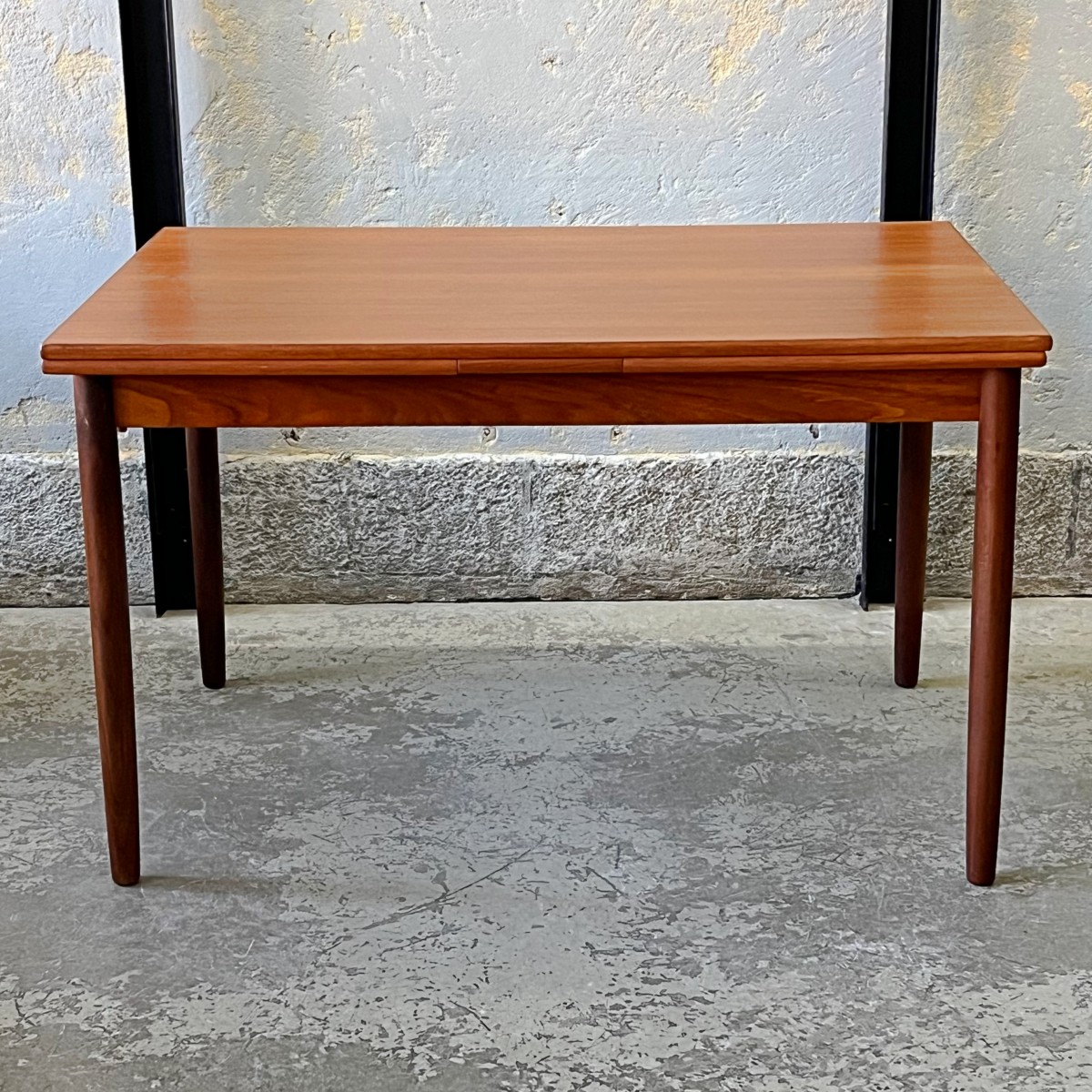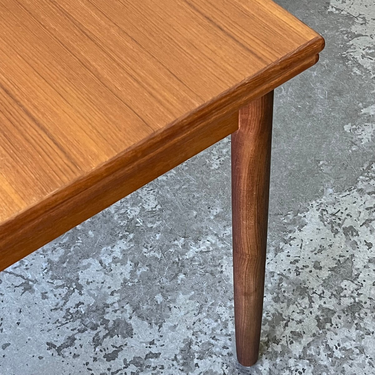 Duży klasyczny tekowy stół jadalniany z opcją rozkładania. Wyprodukowany w Danii latach 60. lub 70. dwudziestego wieku. Blat i konstrukcja pokryte są fornirem z drewna tekowego, natomiast nogi wykonane są z litego drewna. Do produkcji stołu użyto drewna tekowego w ciepłym miodowym odcieniu z ładnym usłojeniem.