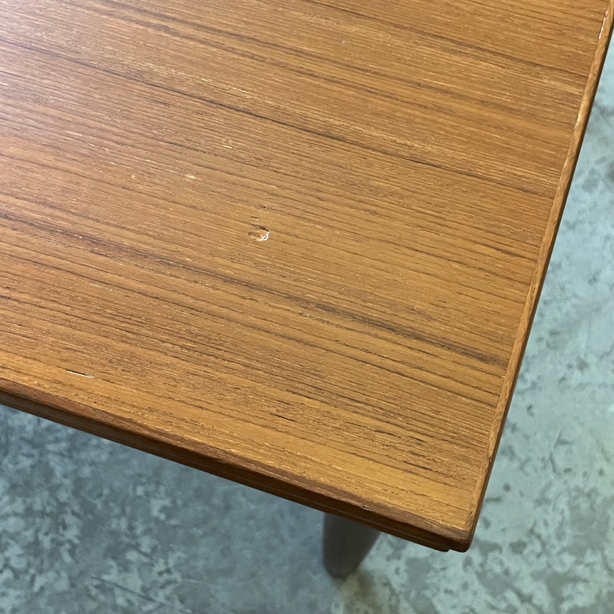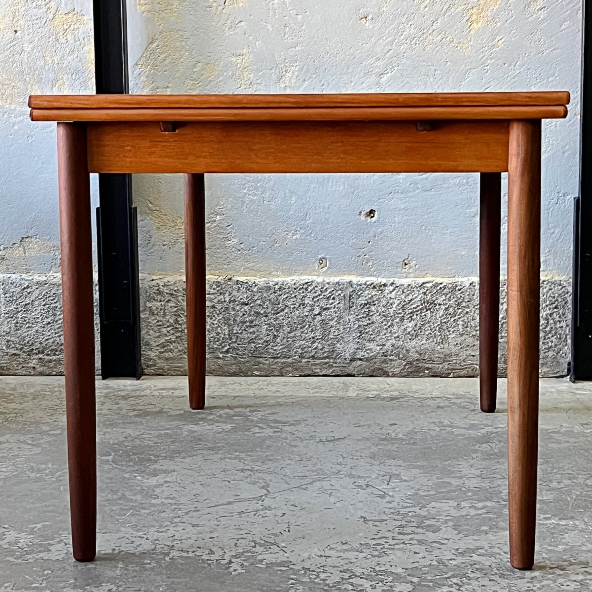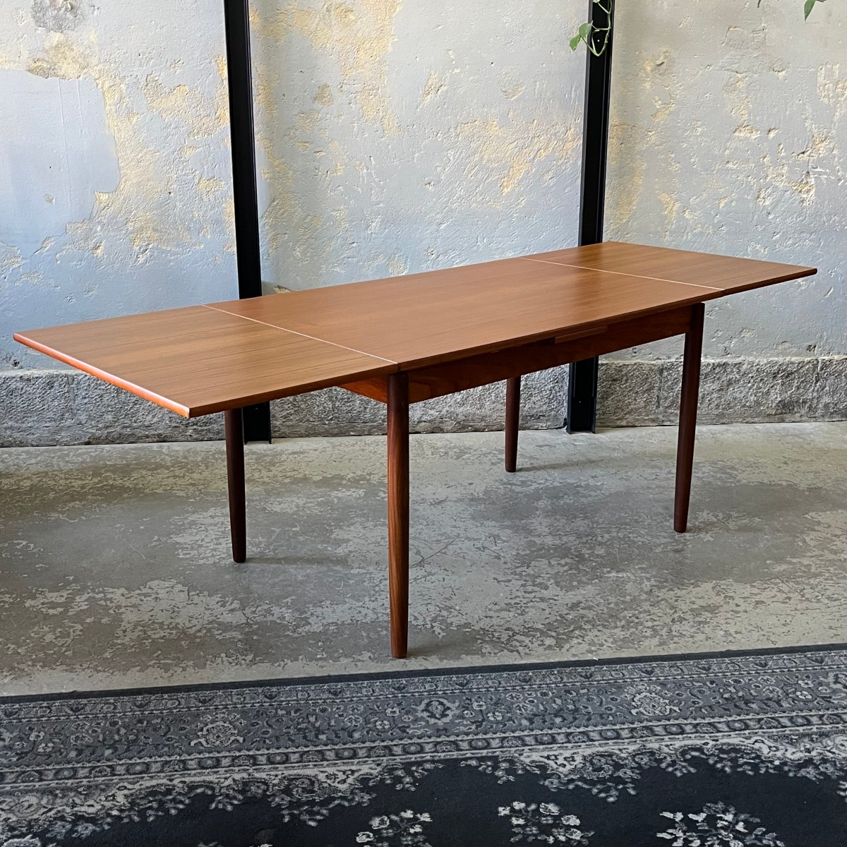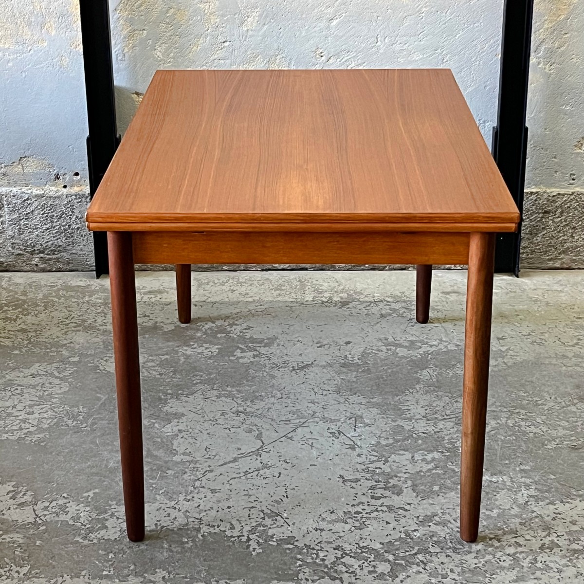 Duży klasyczny tekowy stół jadalniany z opcją rozkładania. Wyprodukowany w Danii latach 60. lub 70. dwudziestego wieku. Blat i konstrukcja pokryte są fornirem z drewna tekowego, natomiast nogi wykonane są z litego drewna. Do produkcji stołu użyto drewna tekowego w ciepłym miodowym odcieniu z ładnym usłojeniem.