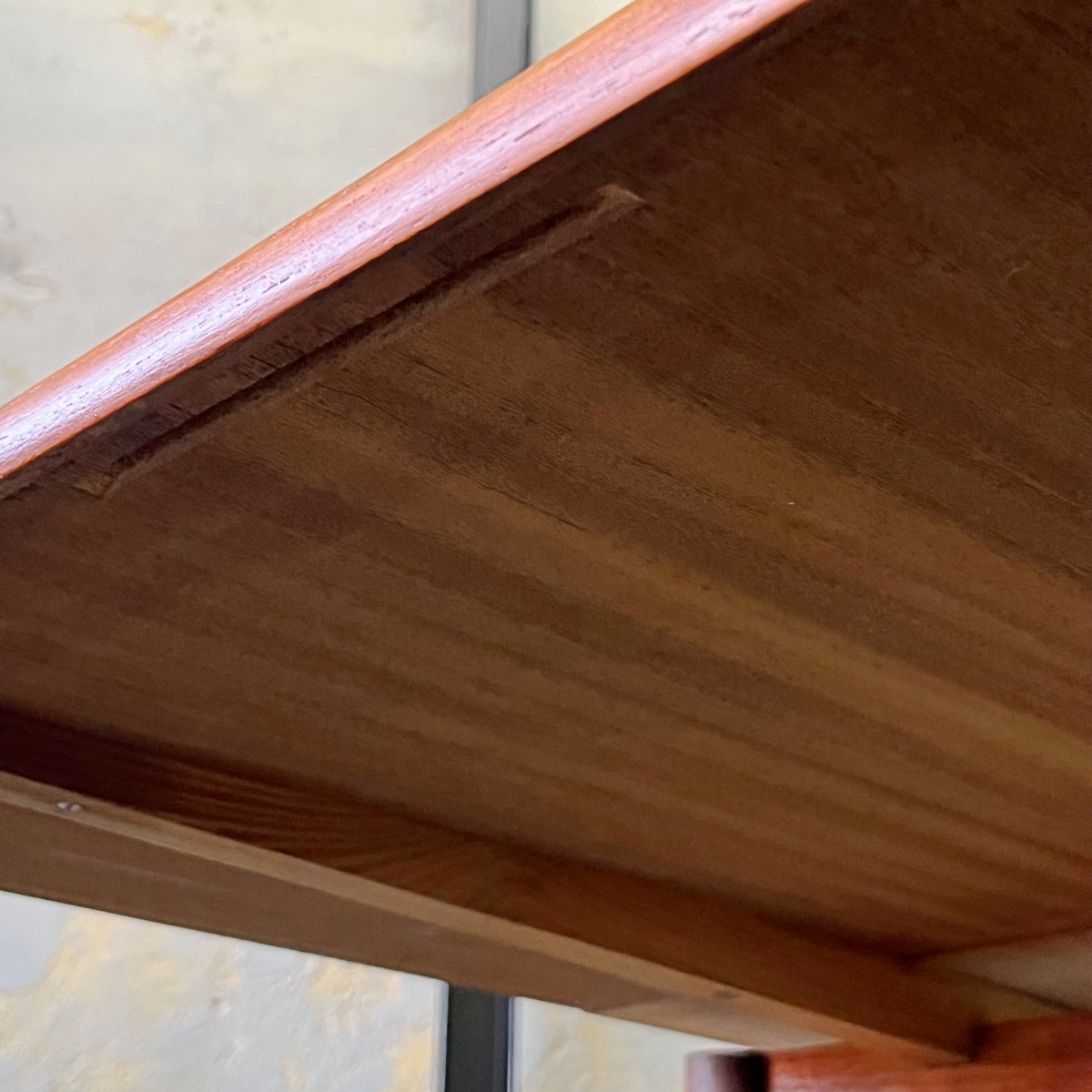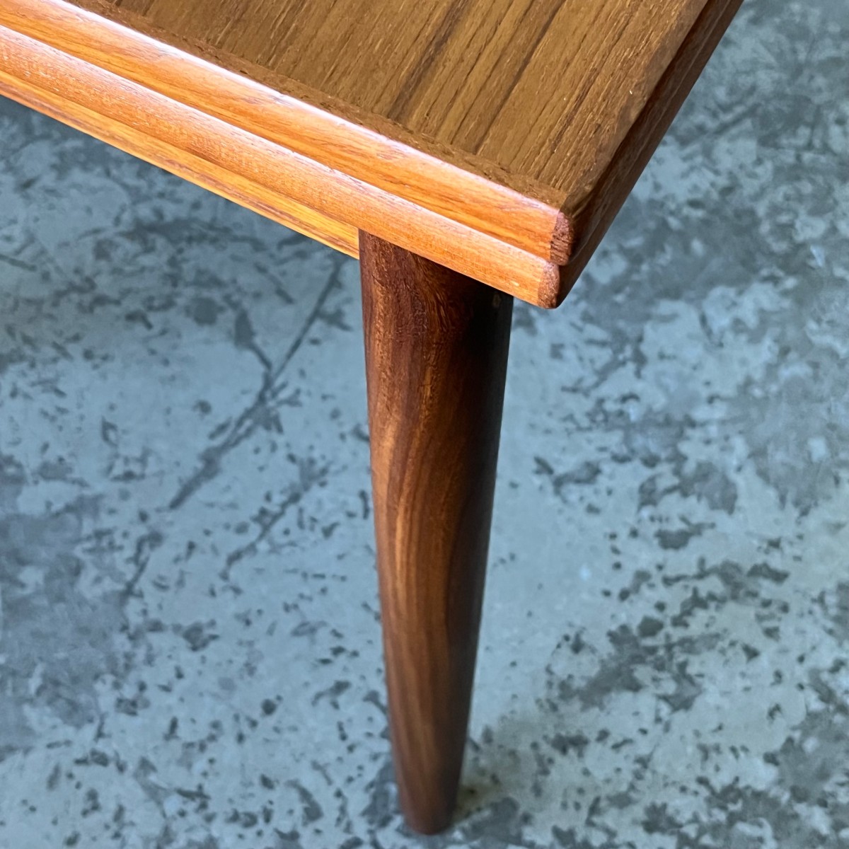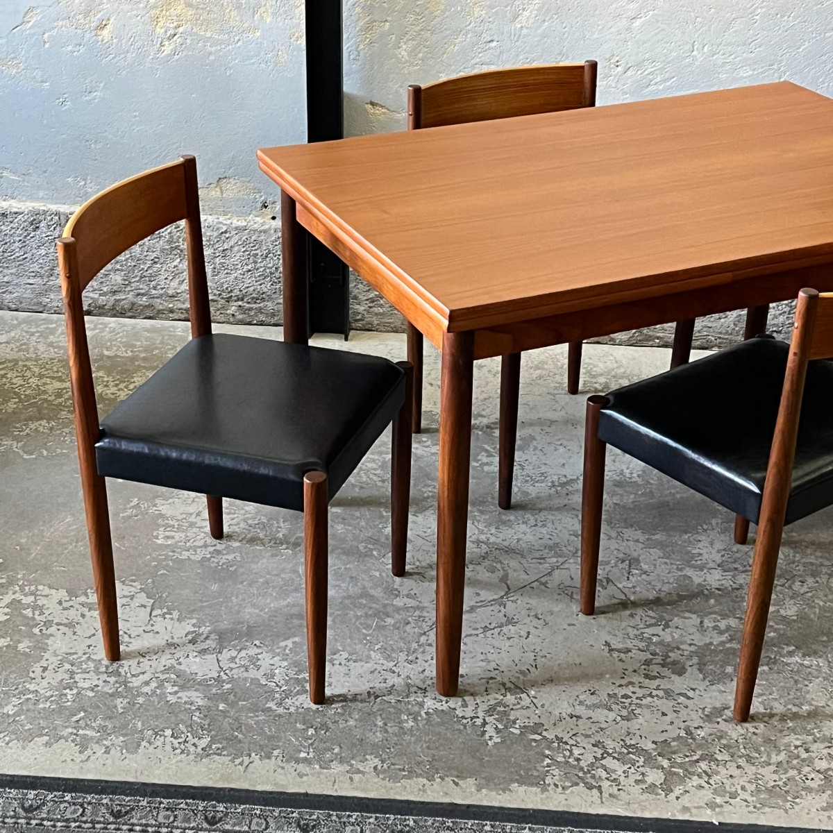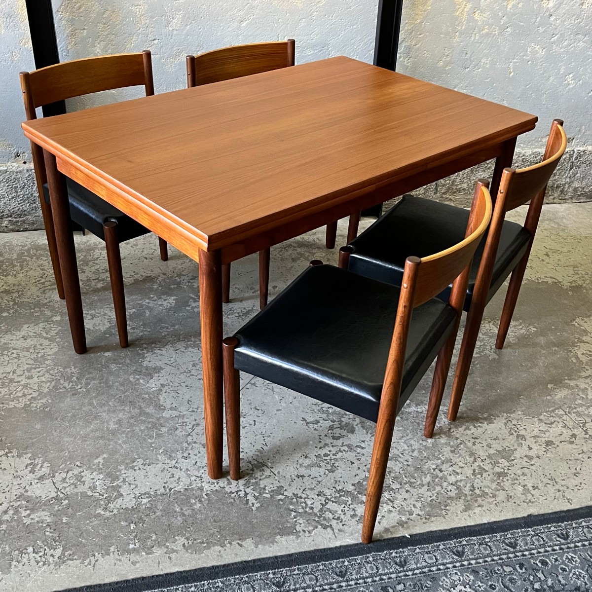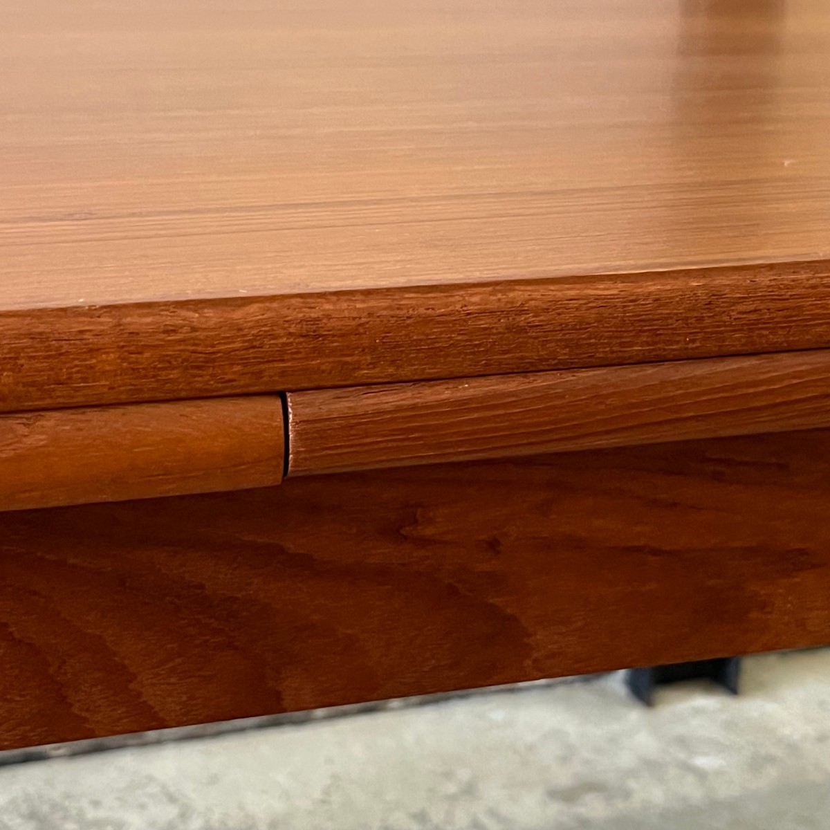 Duży klasyczny tekowy stół jadalniany z opcją rozkładania. Wyprodukowany w Danii latach 60. lub 70. dwudziestego wieku. Blat i konstrukcja pokryte są fornirem z drewna tekowego, natomiast nogi wykonane są z litego drewna. Do produkcji stołu użyto drewna tekowego w ciepłym miodowym odcieniu z ładnym usłojeniem.