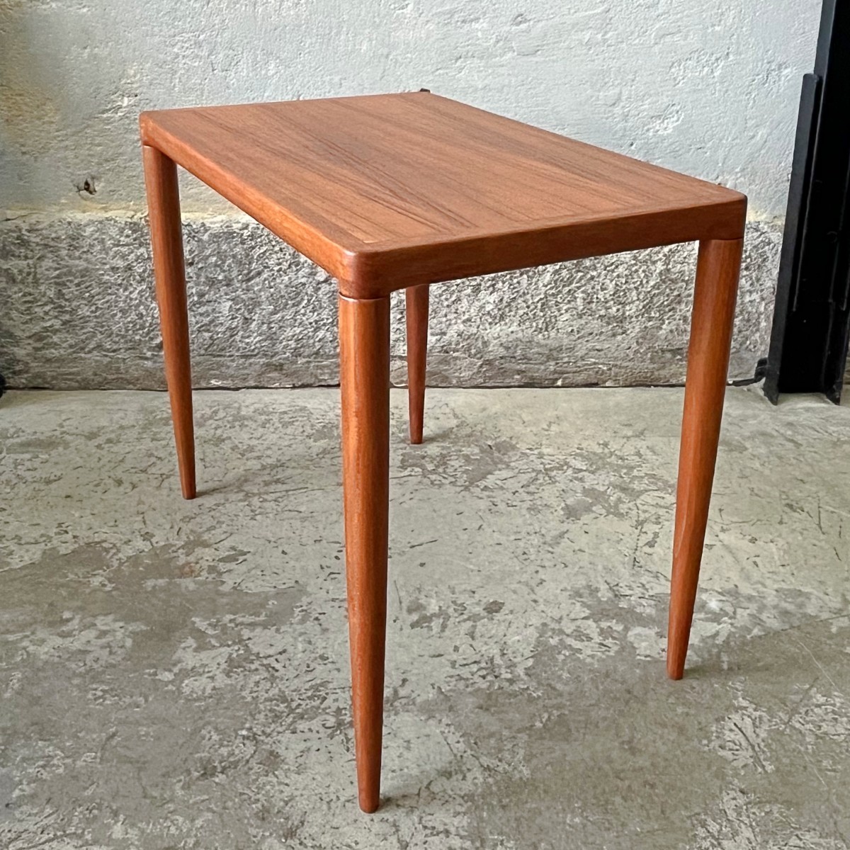 Duński tekowy stolik kawowy, za którego projekt odpowiada Henry W. Klein dla wytwórni Bramin. Lata 60. Mały zgrabny mebel o pięknie wyprofilowanych krawędziach blatu łagodnie przechodzących w okrągłe zwężające się ku dołowi nogi. Piękny dodatek w stylu mid-century modern.