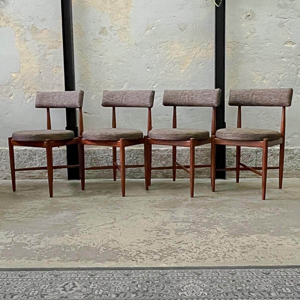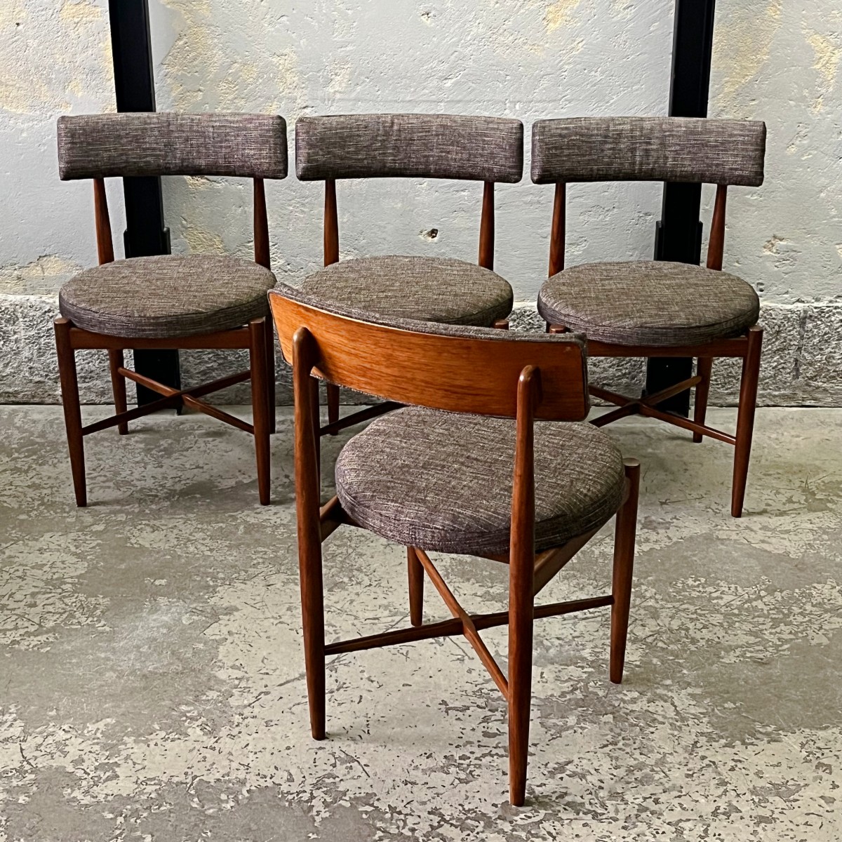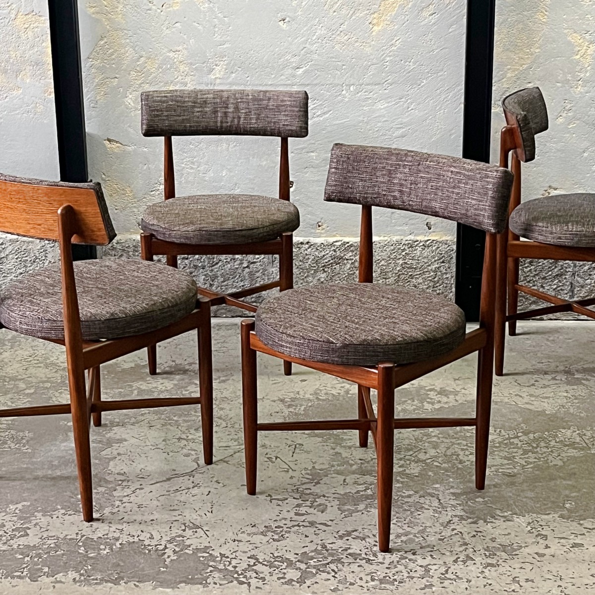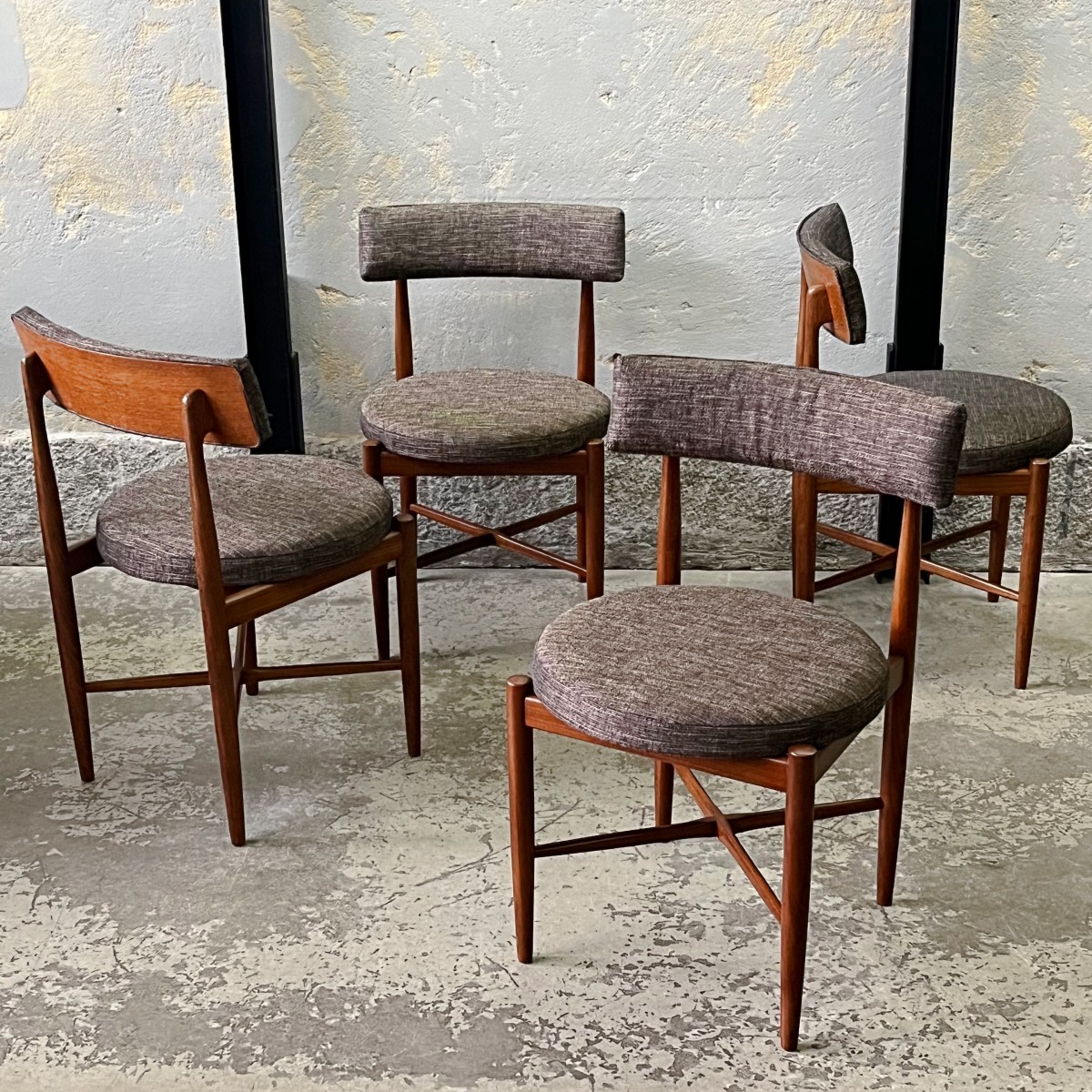 Komplet czterech rzadkich modernistycznych krzeseł zaprojektowanych przez duńskiego projektanta Iba Kofoda-Larsena w latach 60. dla brytyjskiej manufaktury G-Plan. Krzesła nr 3570.