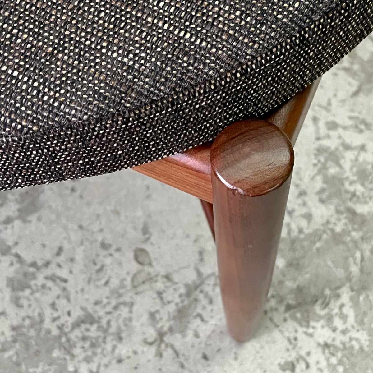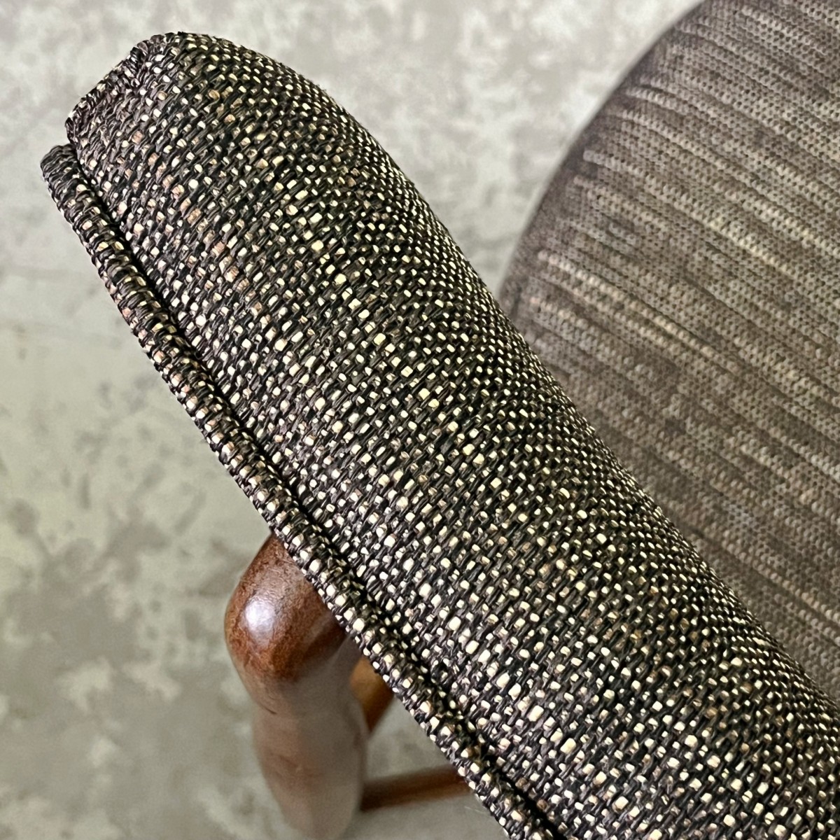 Stelaż krzeseł wykonany jest z lekkiego drewna teakowego o ładnym rysunku słoi. Piękne płynne linie i okrągłe toczone nóżki. Niezwykle wygodne okrągłe siedzisko i dobrze wyprofilowane oparcie zapewniają wygodę podczas użytkowania. Krzesła tapicerowane nowoczesną tkaniną meblową, poliestrową, niejednorodną kolorystycznie. Widzimy tutaj kilka odcieni beżu i brązu, ciepłych niczym czekolada z orzechami. Tkanina w dotyku i wyglądzie przypomina zgrzebne płótno naturalne.