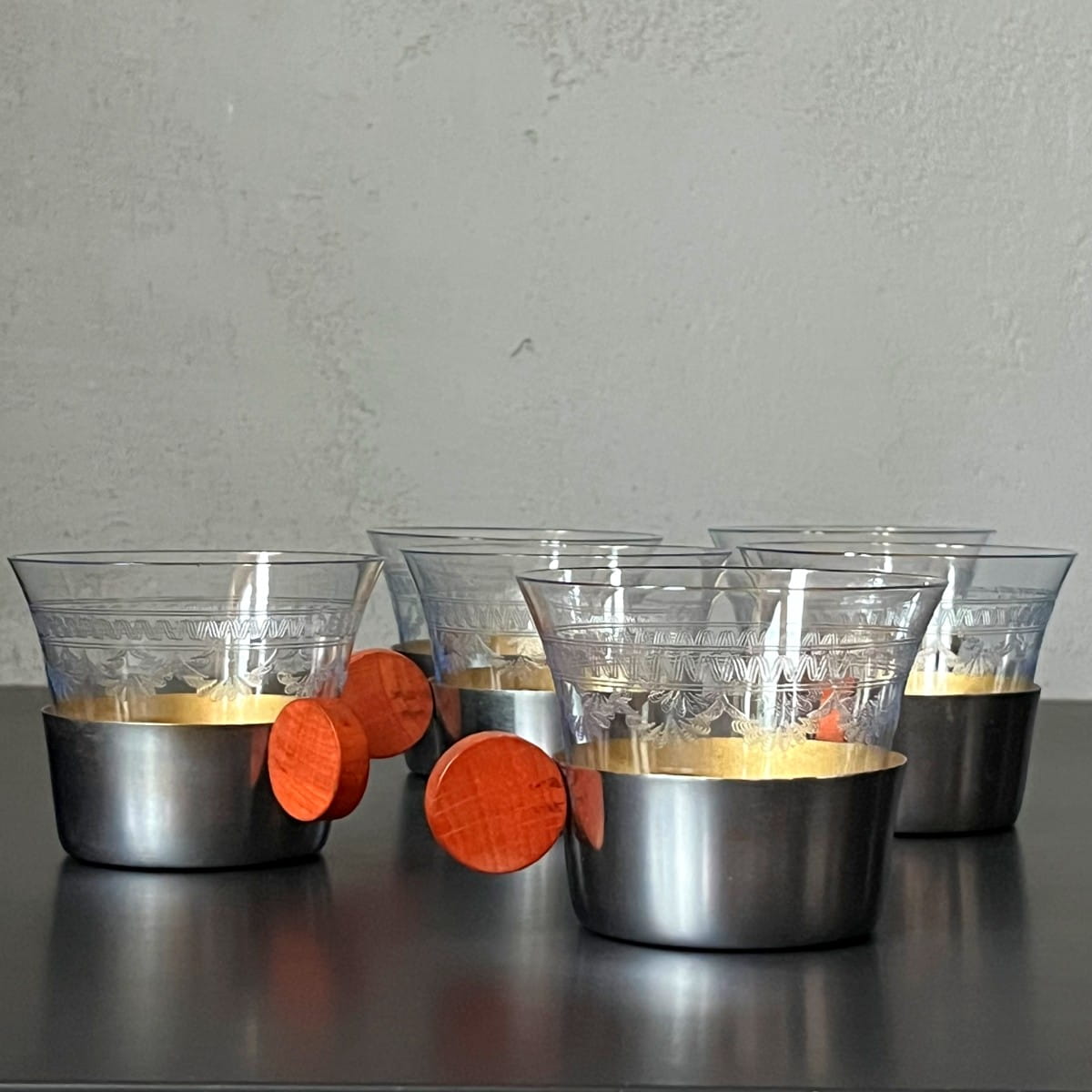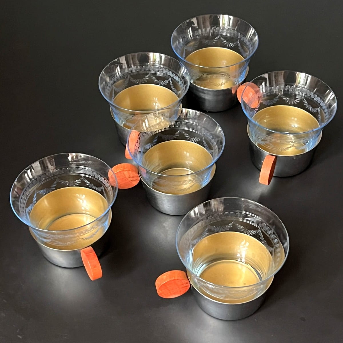 Komplet sześciu szklanych filiżanek w metalowych koszyczkach