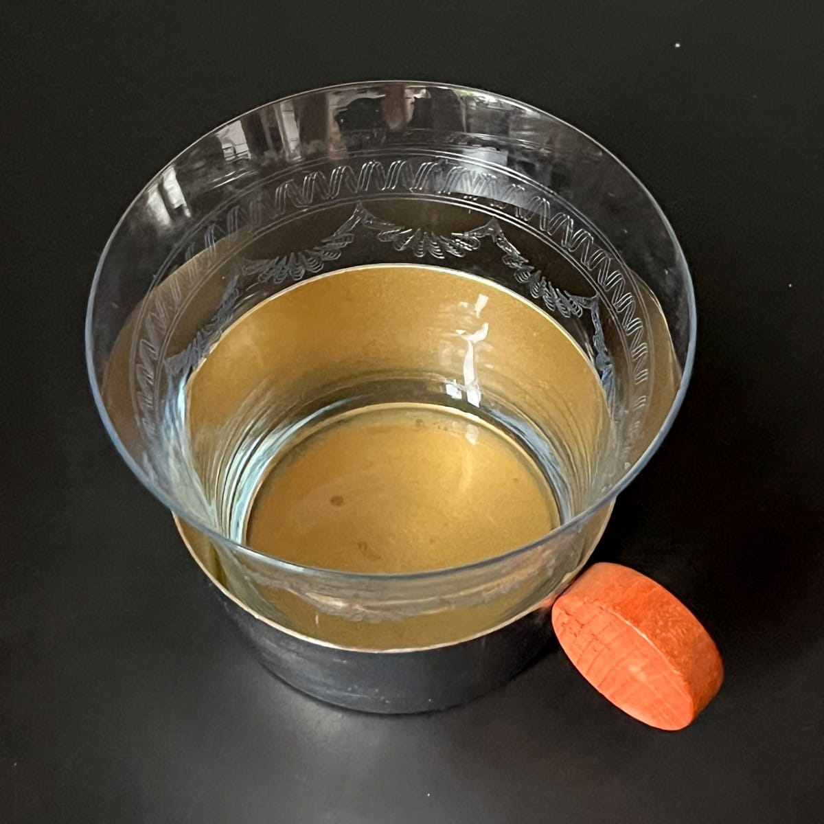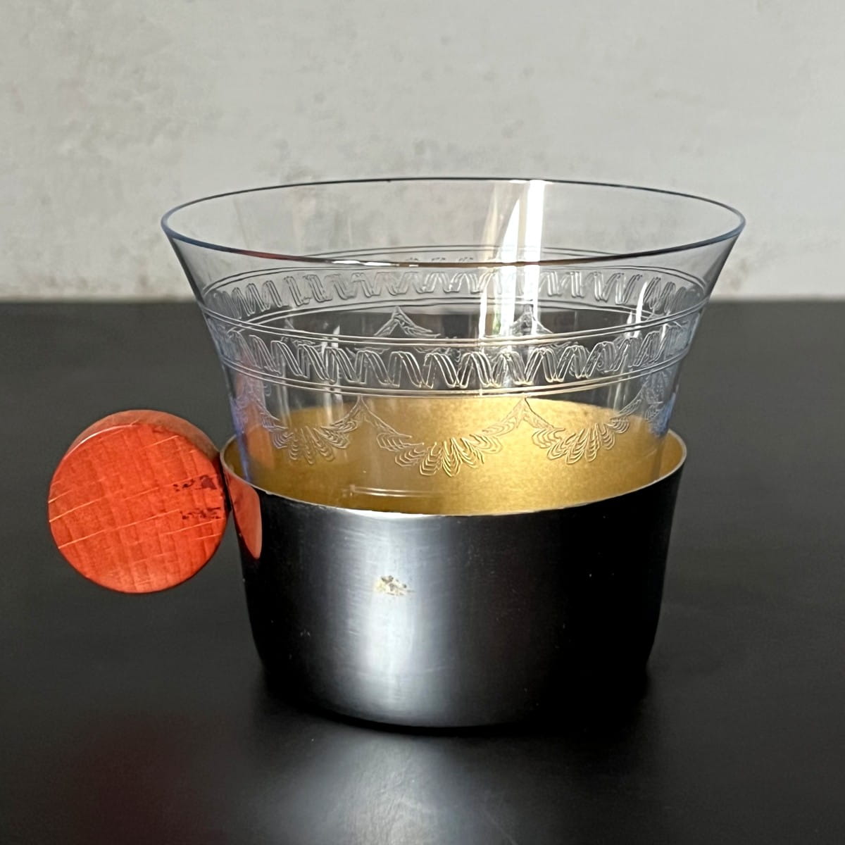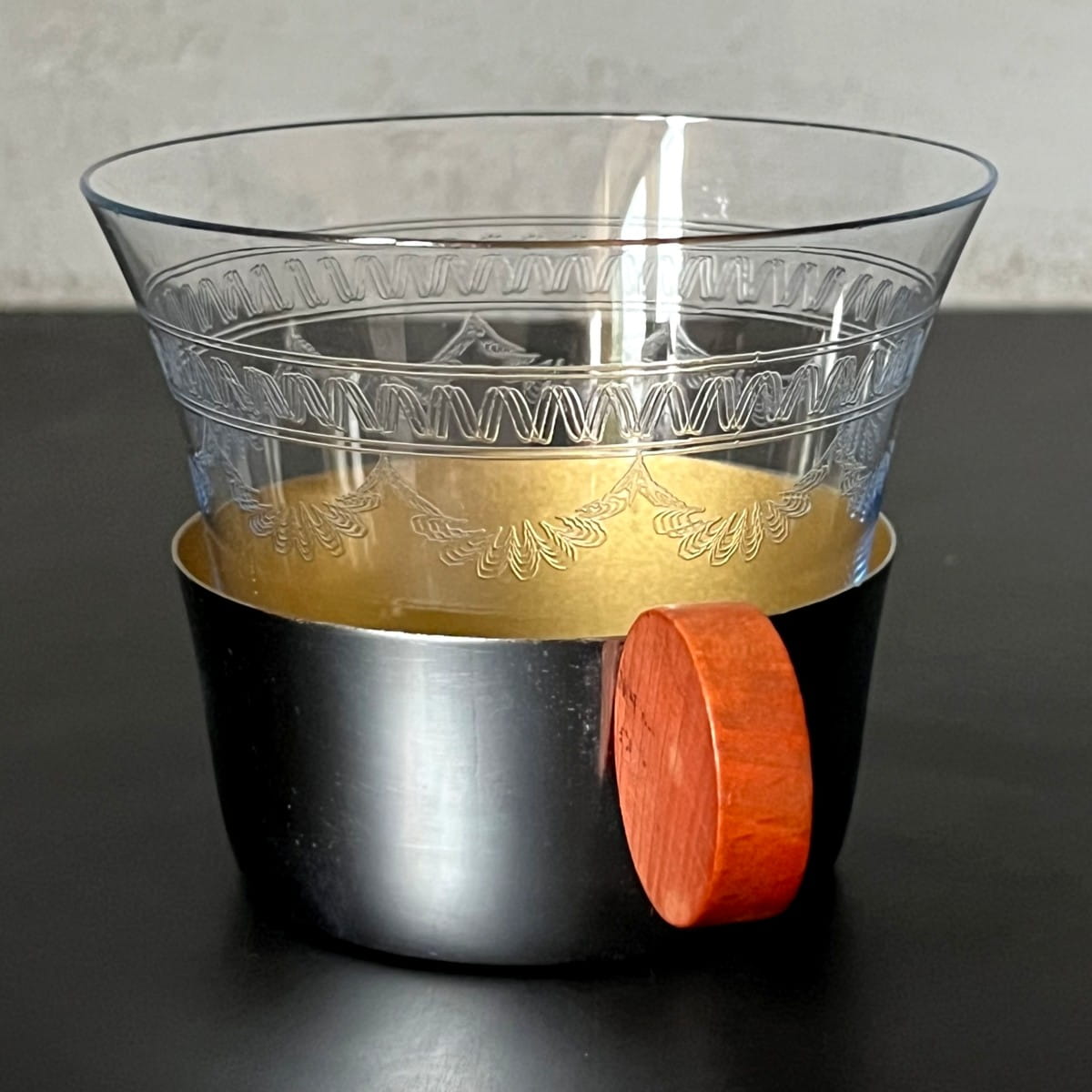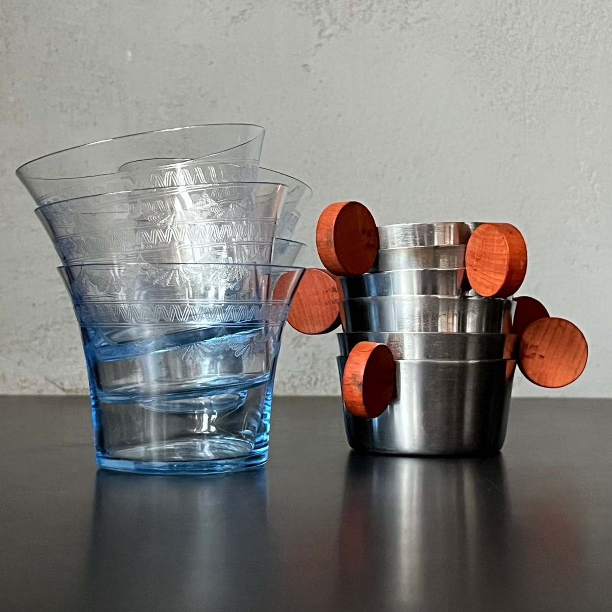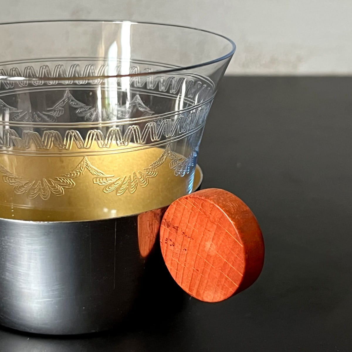 Prezentowany zestaw szklaneczek to przedmiot vintage z wieloletnią historią. Zachowany jest w bardzo dobrym stanie vintage. Posiada ślady czasu w postaci rysek i przebarwień i miejscowej patyny na metalowej powierzchni koszyczków. Te ślady nadają im indywidualnego charakteru. Szkło w świetnym stanie, podobnie jak drewniane elementy zestawu. Na rancie jednej szklaneczki uszczerbek ok 1 mm.