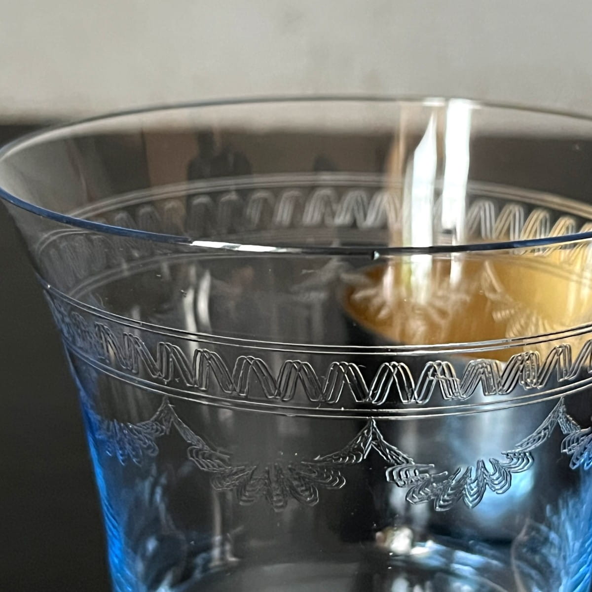 Komplet sześciu szklanych filiżanek w metalowych koszyczkach z drewnianym okrągłym uszkiem. Koszyczki wewnątrz w kolorze złotym. Wyprodukowane prawdopodobnie w latach 60. Kraj pochodzenia nie jest nam znany. Piękna szklana forma w stylu art deco o pojemności 150 ml. Szkło w odcieniu niebieskim z grawerowanym wzorem. Drewniane dodatki dodają im sznytu.