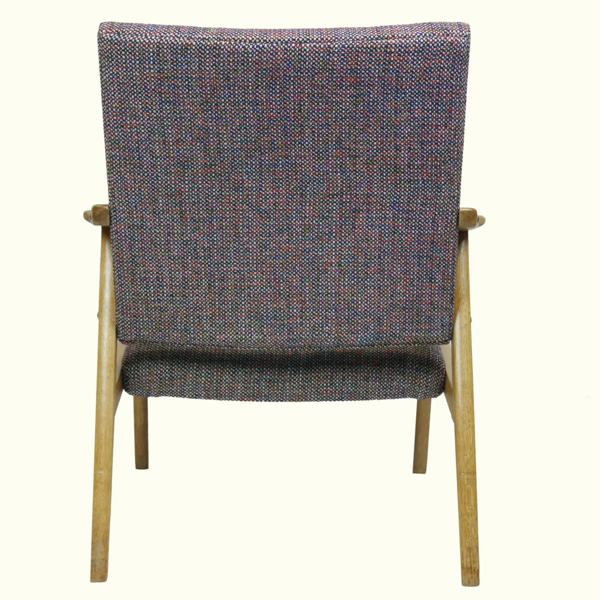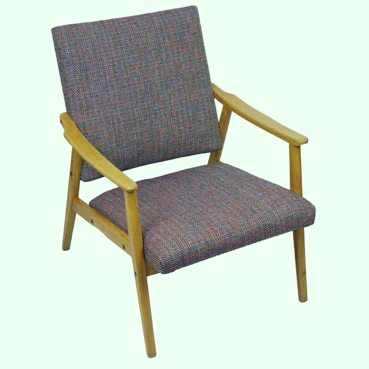Fotel przeszedł renowację tapicerską i stolarską. Drewno zostało oczyszczone ze starych powłok i pokryte satynowym lakierem bezbarwnym. Tkanina tapicerska wysokiej jakości, nowoczesna, kolorowa. Wzór tkany, nie drukowany.