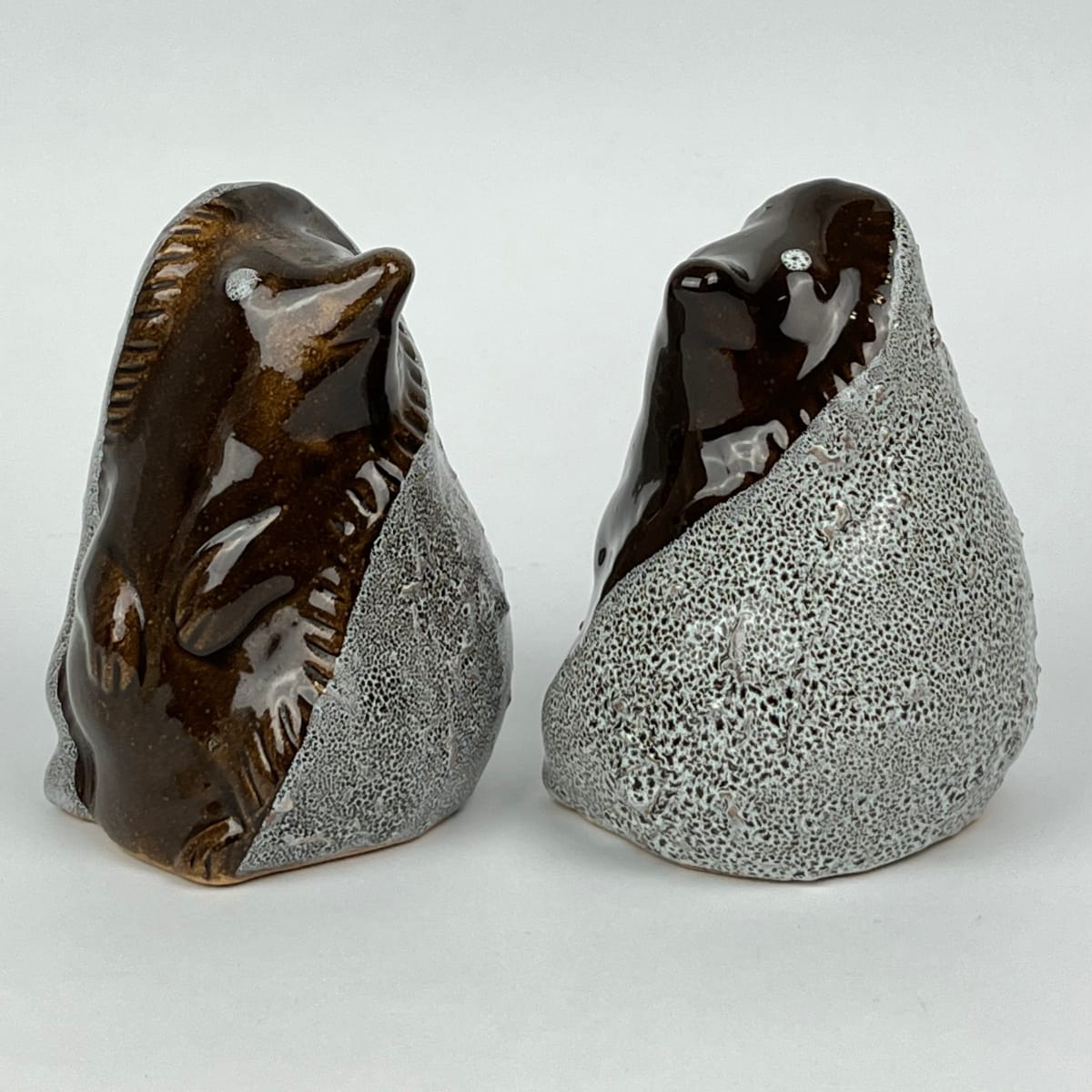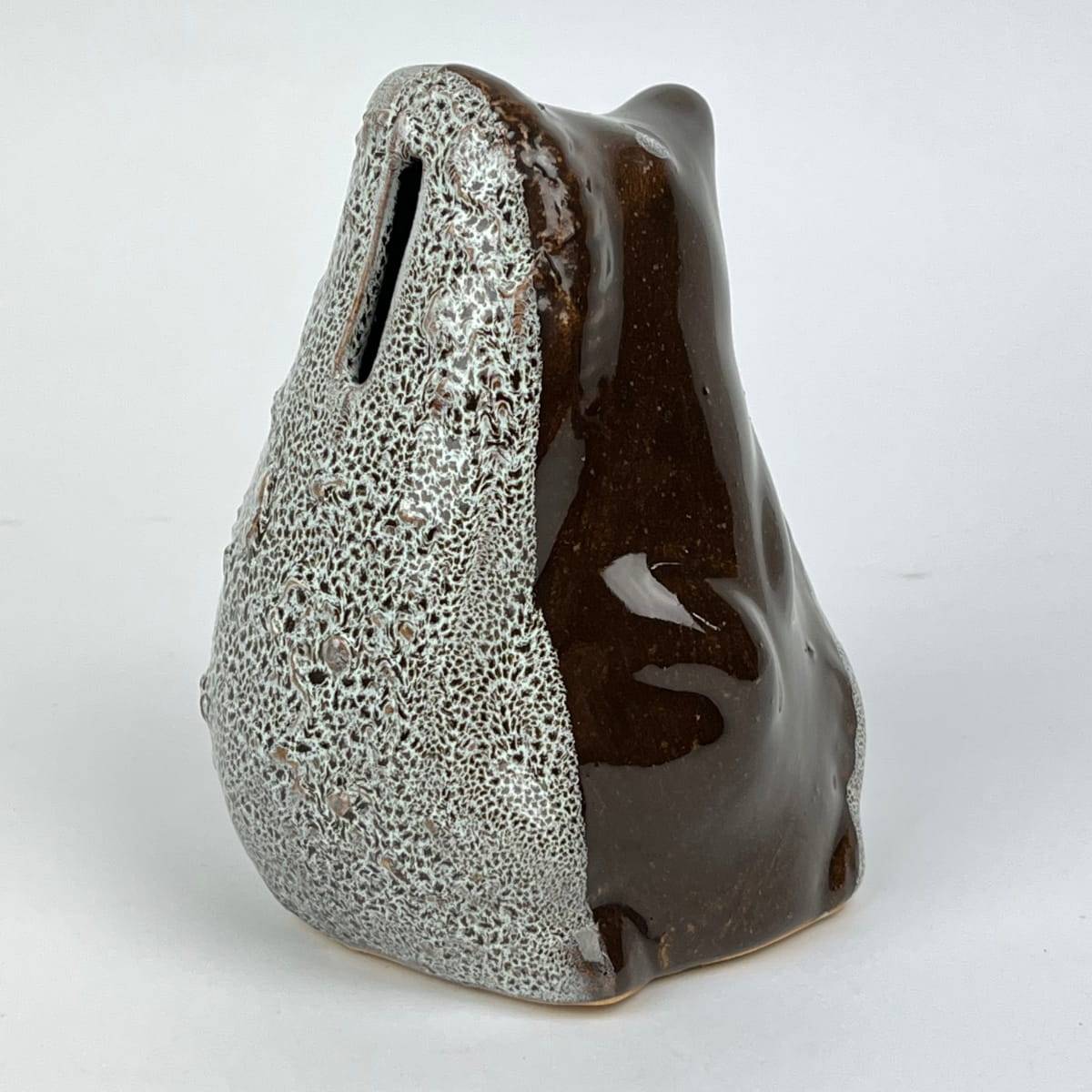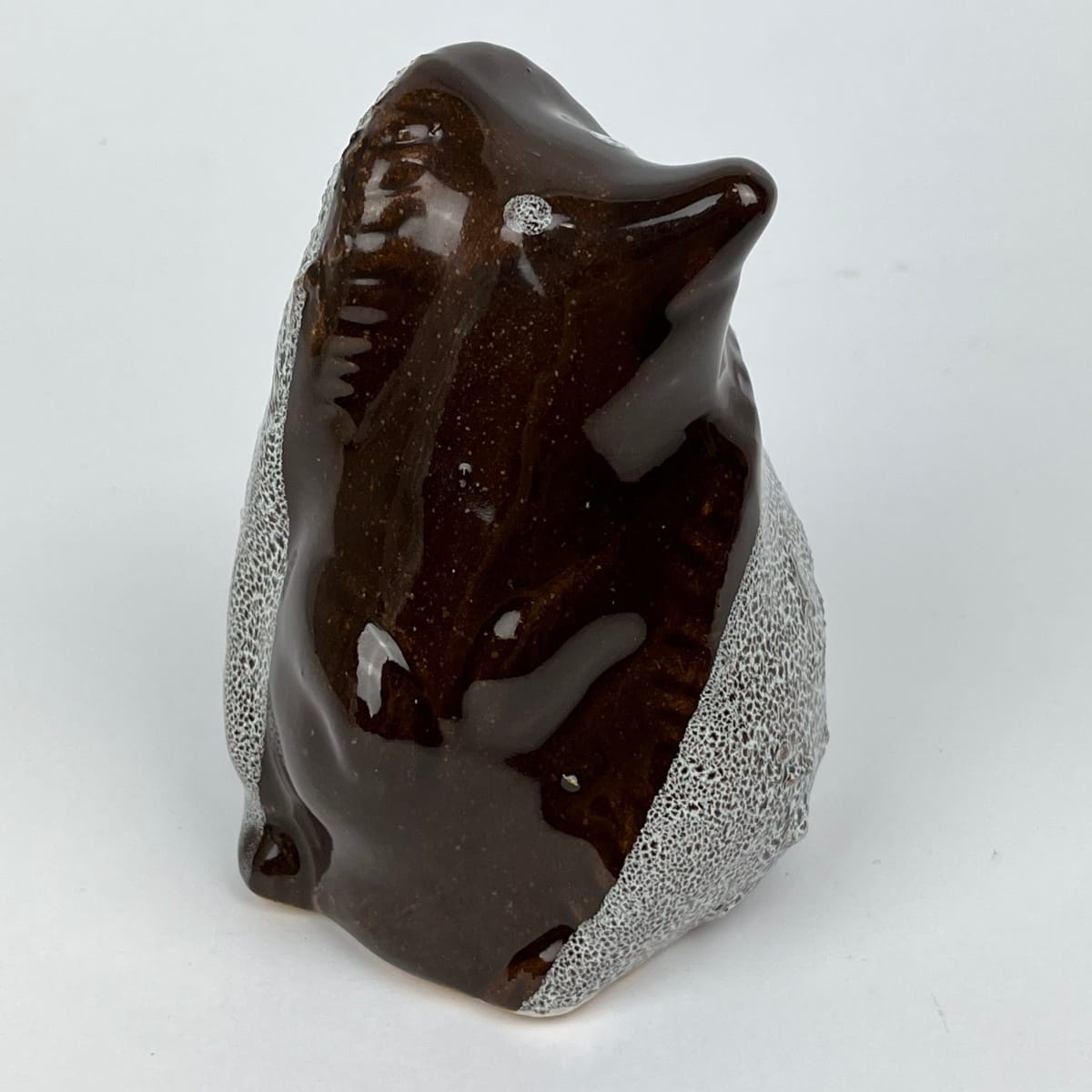 Wykonana w latach 70/80, lśniąca i niezwykle piękna ceramiczna skarbonka w formie figurki jeża. Postać jeża została uchwycona w pozycji siedzącej, z głową odwróconą w lewo i wysoko zadartym nosem. Figurka jest barwiona naciekowo w masie i pokryta charakterystycznym szkliwieniem typu Fat Lava. Spód skarbonki jest surowy, nieszkliwiony. Nie posiada sygnatury.