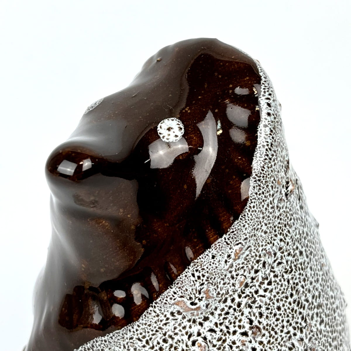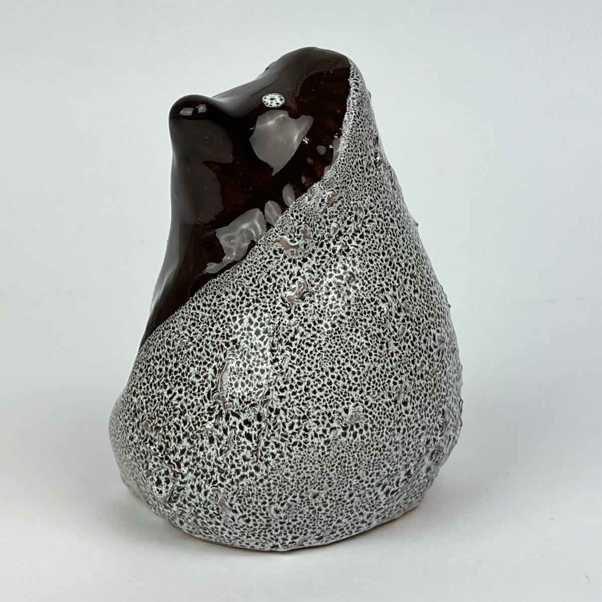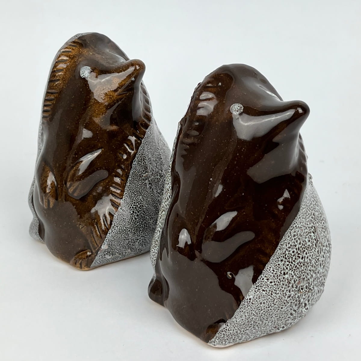 Wykonana w latach 70/80, lśniąca i niezwykle piękna ceramiczna skarbonka w formie figurki jeża. Postać jeża została uchwycona w pozycji siedzącej, z głową odwróconą w lewo i wysoko zadartym nosem. Figurka jest barwiona naciekowo w masie i pokryta charakterystycznym szkliwieniem typu Fat Lava. Spód skarbonki jest surowy, nieszkliwiony. Nie posiada sygnatury.