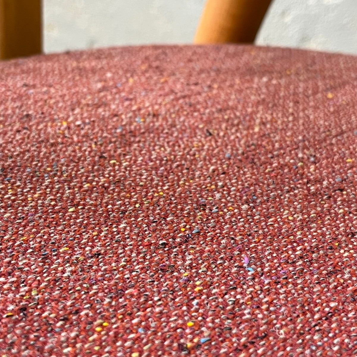 Krzesła nie są nowe, posiadają ślady użytkowania. Są to meble vintage, z przeszłością, której ślady zachowały się w postaci rys, otarć i obić nie wpływających na użytkowanie. Konstrukcja krzeseł mocna i stabilna. Meble przeszły renowację tapicerską. Wymienione zostało poszycie i wypełnienie krzeseł. Stare poszycie zostało zastąpione nową elegancką tkaniną meblową. Wielokolorowa tkanina tapicerska w interesującym wydaniu, o zwartej, drobnej strukturze płóciennej. Ceglastoczerwoną, przetykana gęsto wełnianymi nićmi w innych radosnych kolorach.