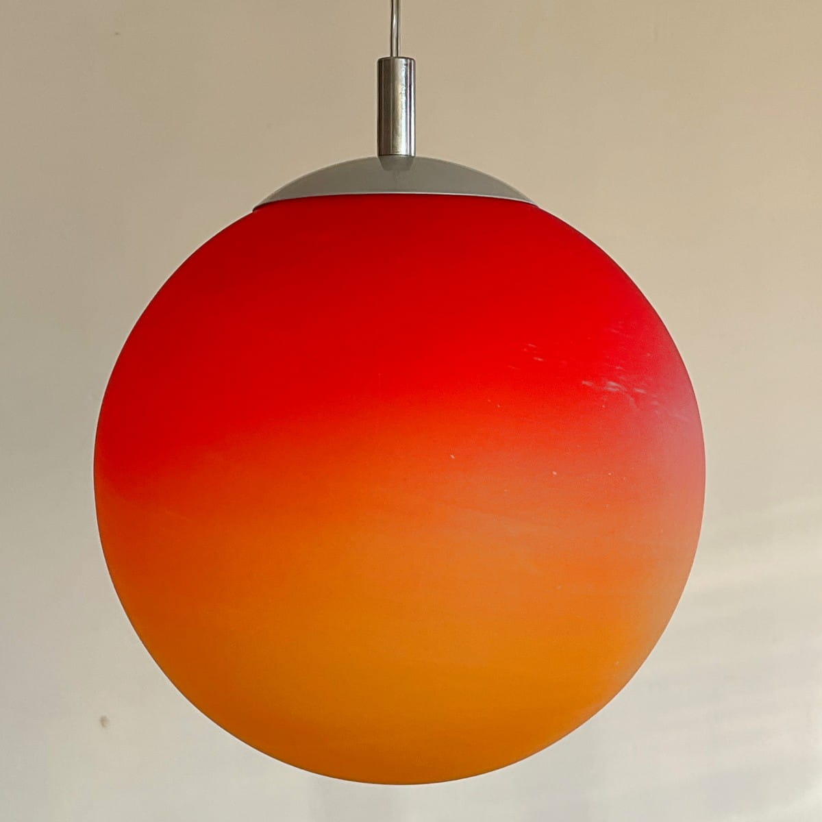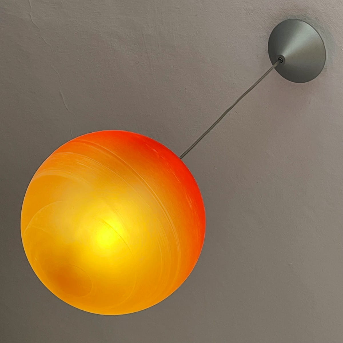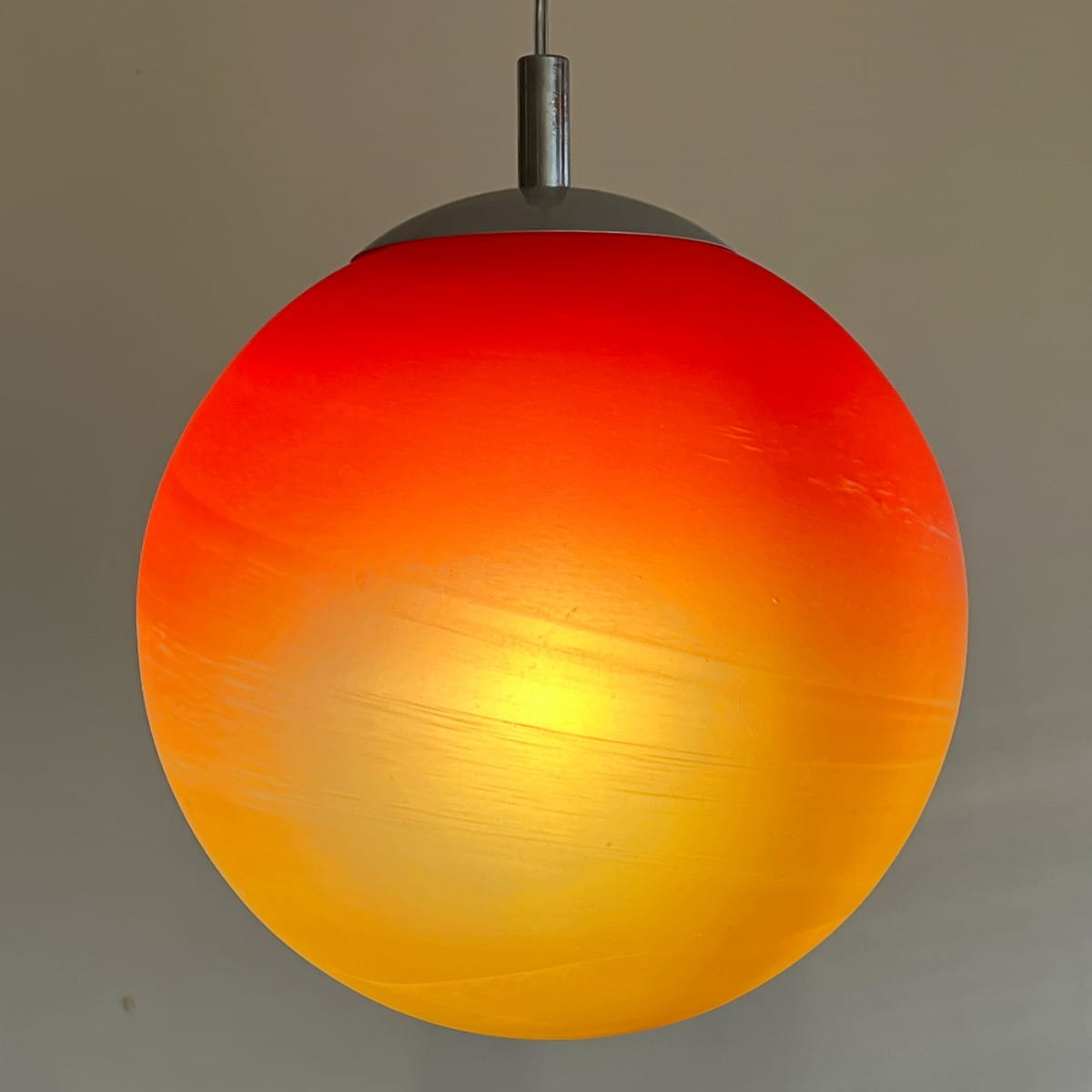 Wisząca lampa Mars Wofi Leuchten to prawdziwa kosmiczna perełka. Jej okrągły klosz, wykonany z grubego szkła, zachwyca intensywnym pomarańczowym kolorem, który stopniowo przechodzi w czerwień na północnym biegunie klosza. Ta subtelna gradacja barw tworzy fascynujący efekt wizualny, jakby pod naszym sufitem wirowała na orbicie prawdziwa planeta. Lampa pochodzi z naszej galaktyki prawdopodobnie z lat 80-90.