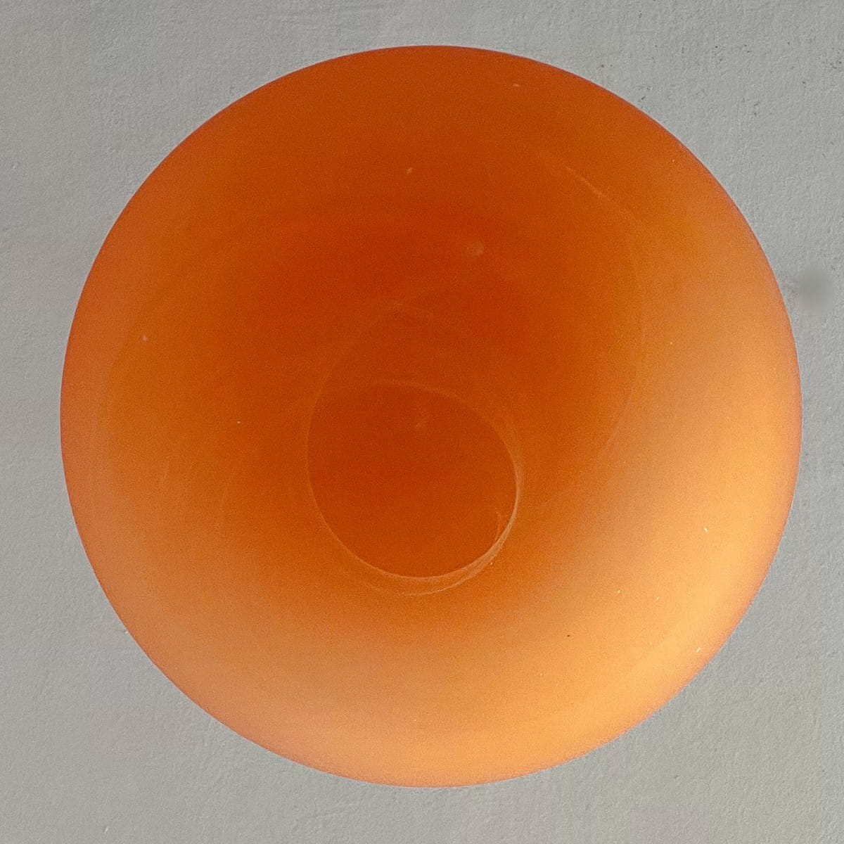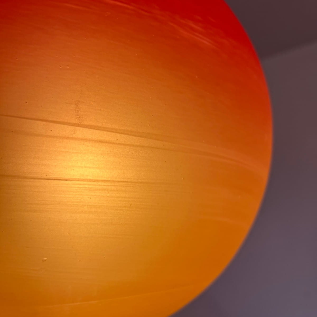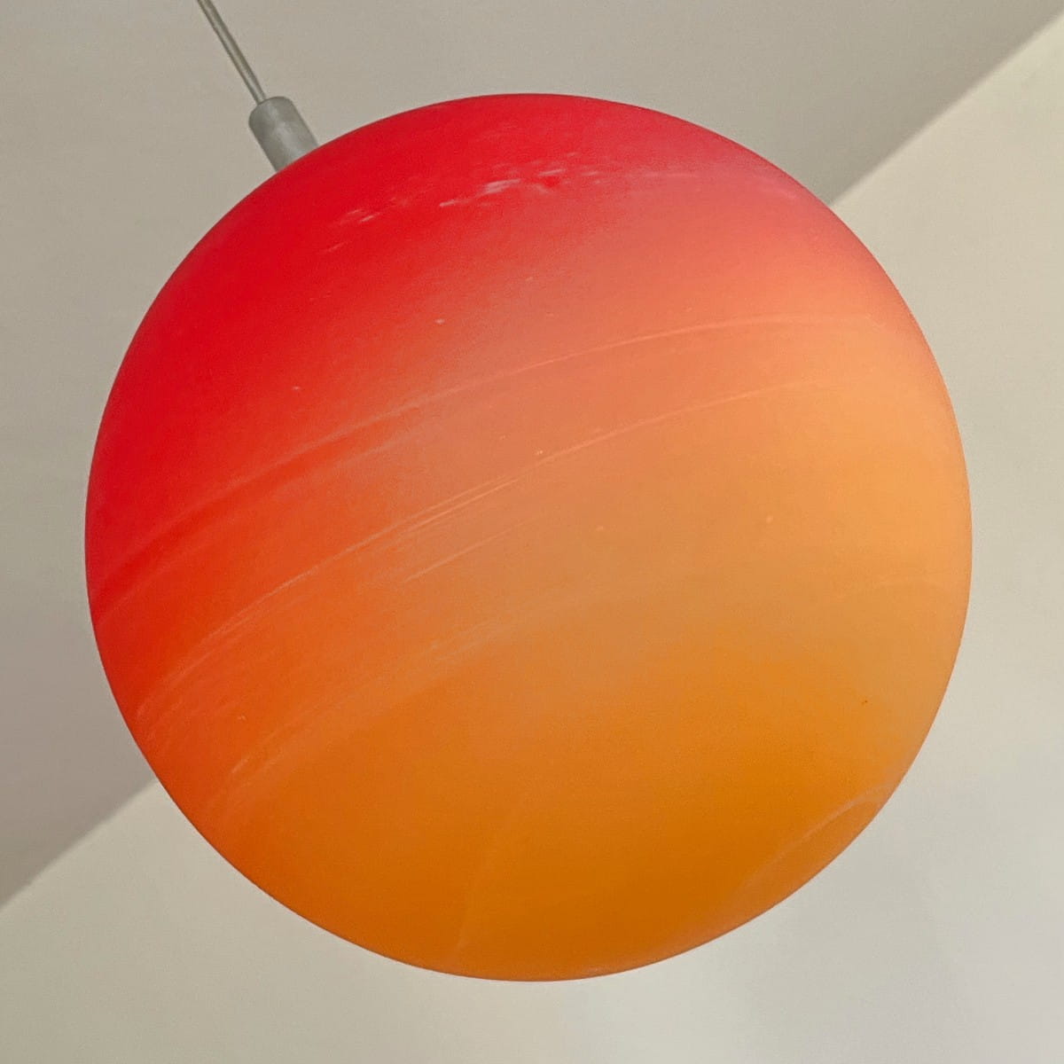 Wisząca lampa Mars Wofi Leuchten to prawdziwa kosmiczna perełka. Jej okrągły klosz, wykonany z grubego szkła, zachwyca intensywnym pomarańczowym kolorem, który stopniowo przechodzi w czerwień na północnym biegunie klosza. Ta subtelna gradacja barw tworzy fascynujący efekt wizualny, jakby pod naszym sufitem wirowała na orbicie prawdziwa planeta. Lampa pochodzi z naszej galaktyki prawdopodobnie z lat 80-90.