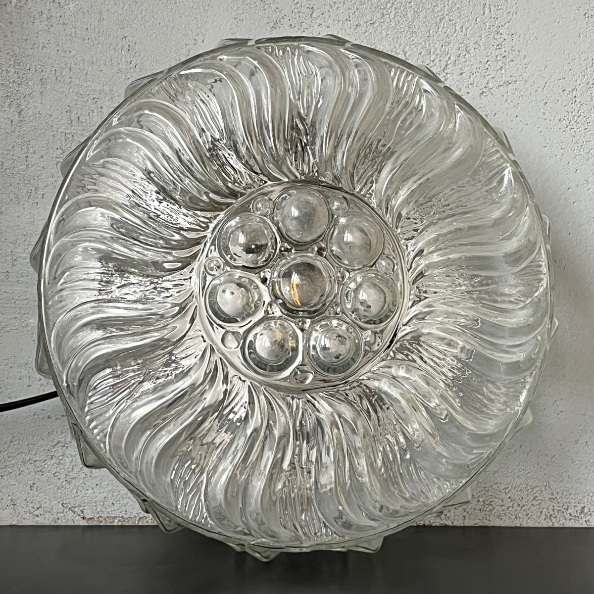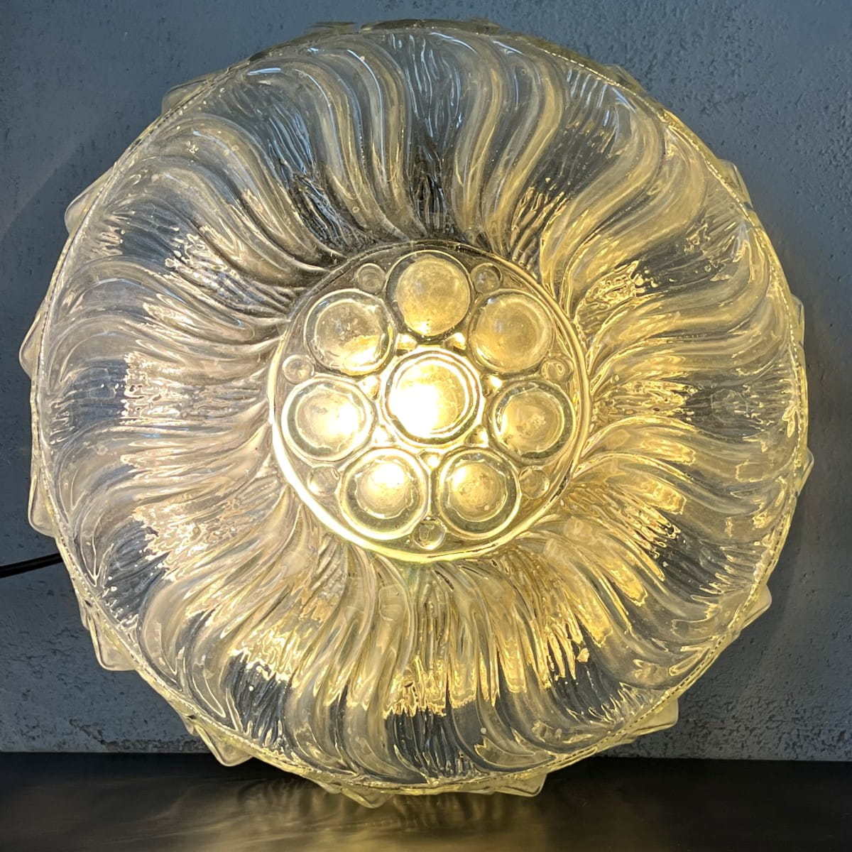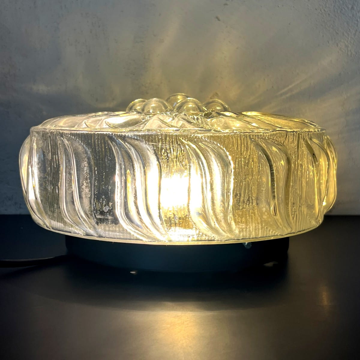 Wyjątkowa lampa sufitowa, wykonana z grubego ciężkiego szkła, połączenie minimalistycznego designu i funkcjonalności. Okrągły plafon pochodzi prawdopodobnie z lat 70. Prosta, geometryczna forma lampy w kształcie walca skupia uwagę, a powierzchnia ozdobiona trójwymiarowym organicznym wzorem dodaje elegancji.