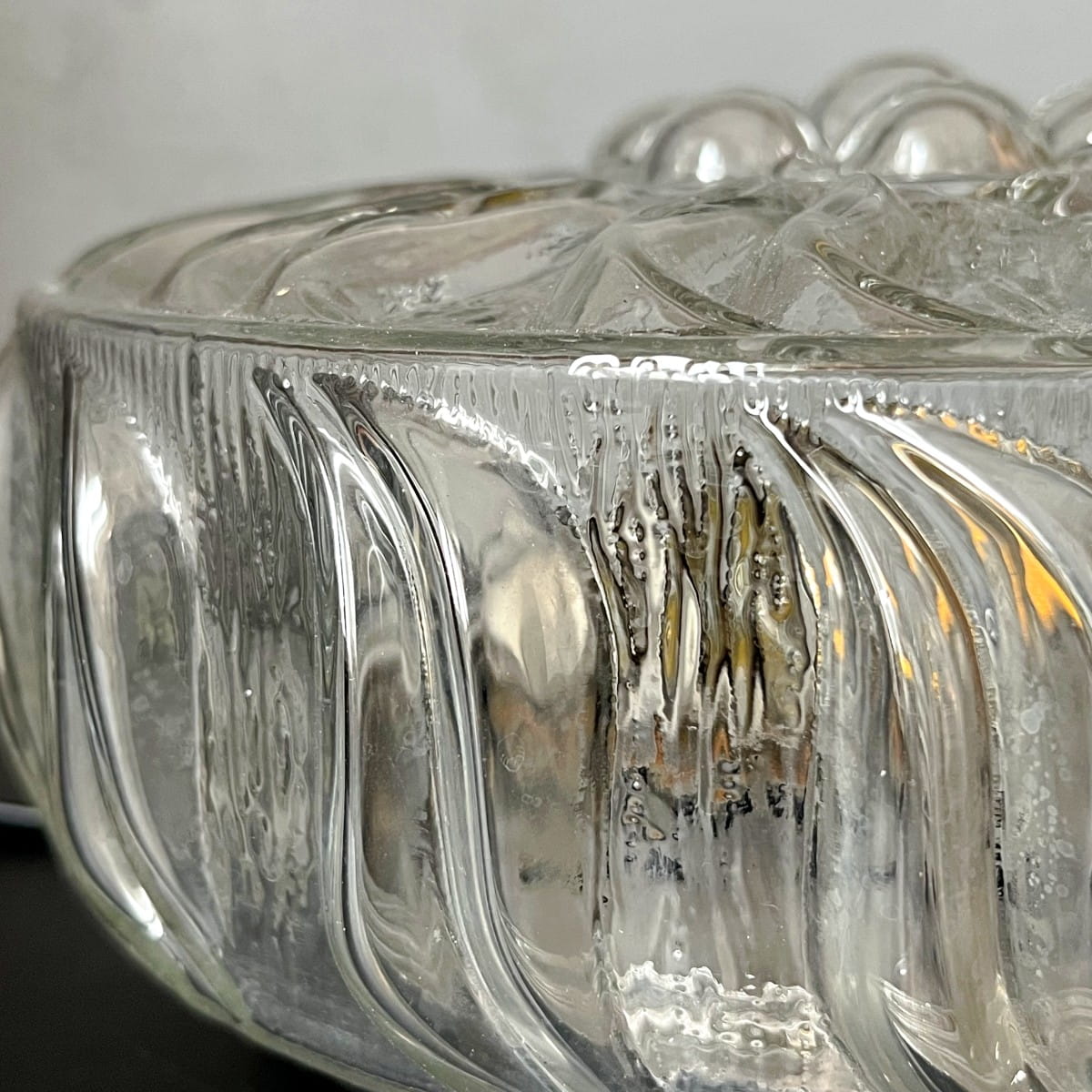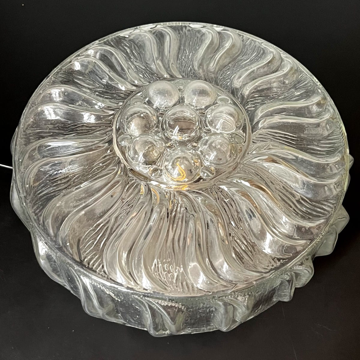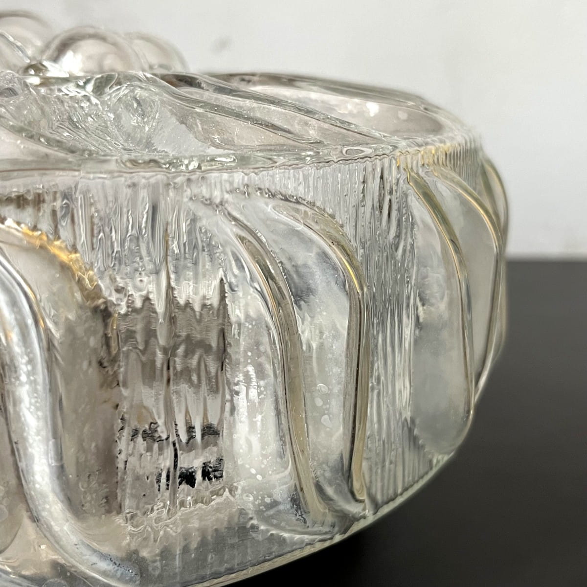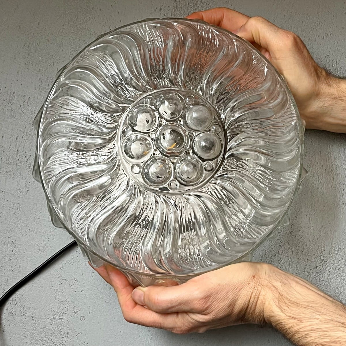 Wyjątkowa lampa sufitowa, wykonana z grubego ciężkiego szkła, połączenie minimalistycznego designu i funkcjonalności. Okrągły plafon pochodzi prawdopodobnie z lat 70. Prosta, geometryczna forma lampy w kształcie walca skupia uwagę, a powierzchnia ozdobiona trójwymiarowym organicznym wzorem dodaje elegancji.
