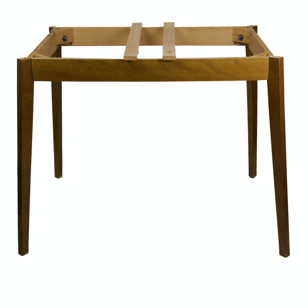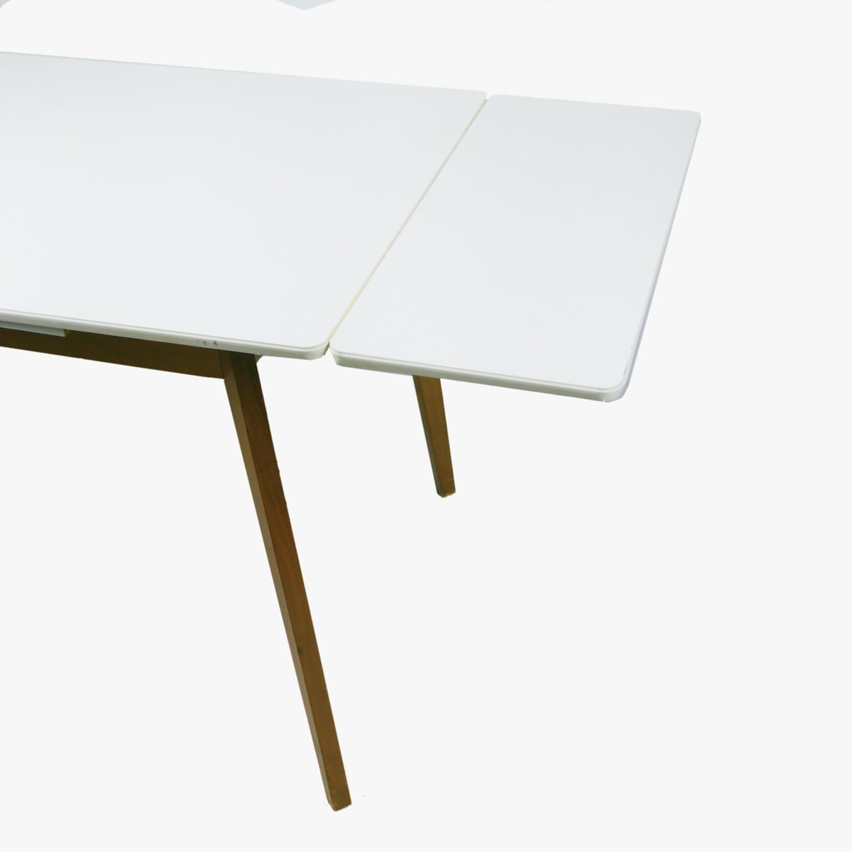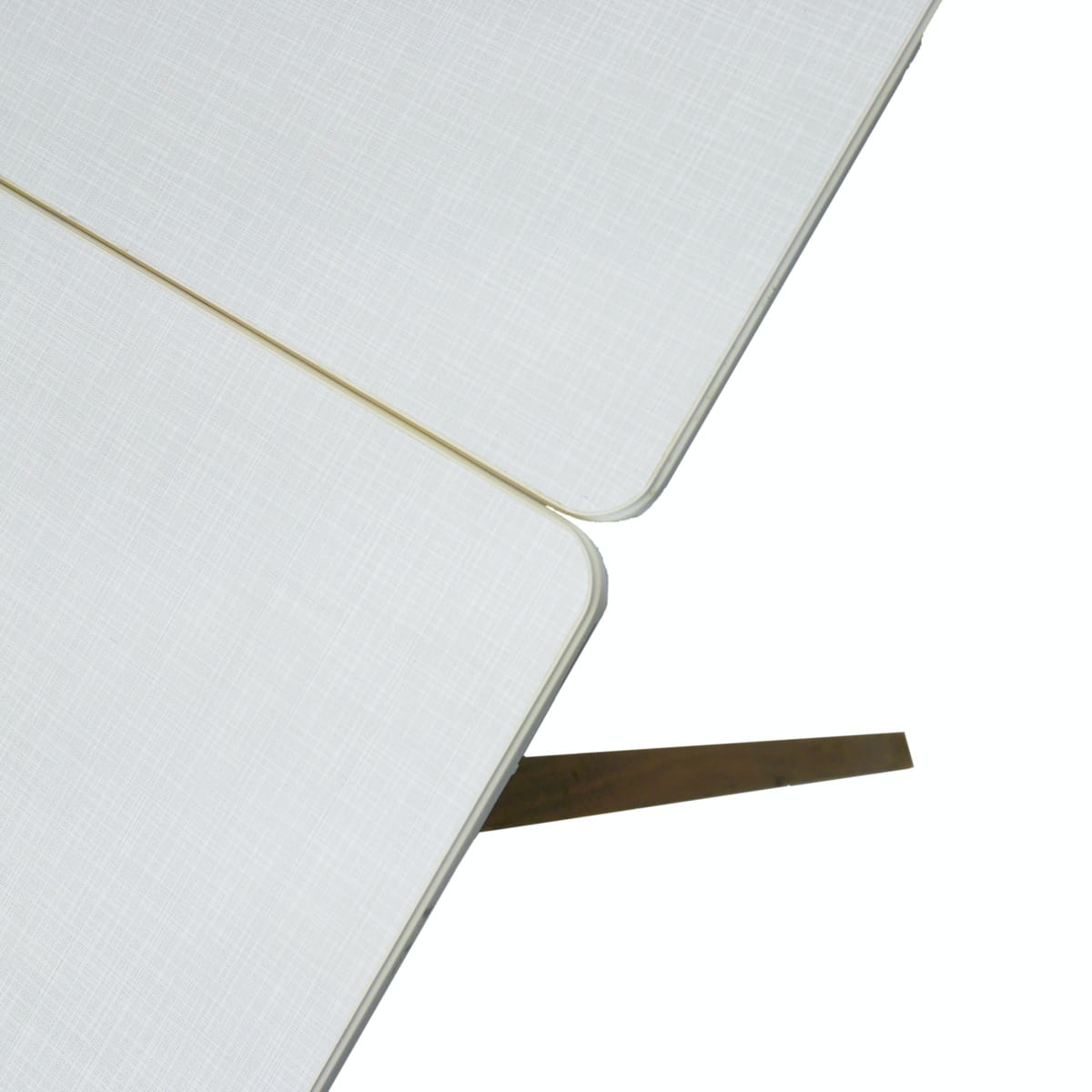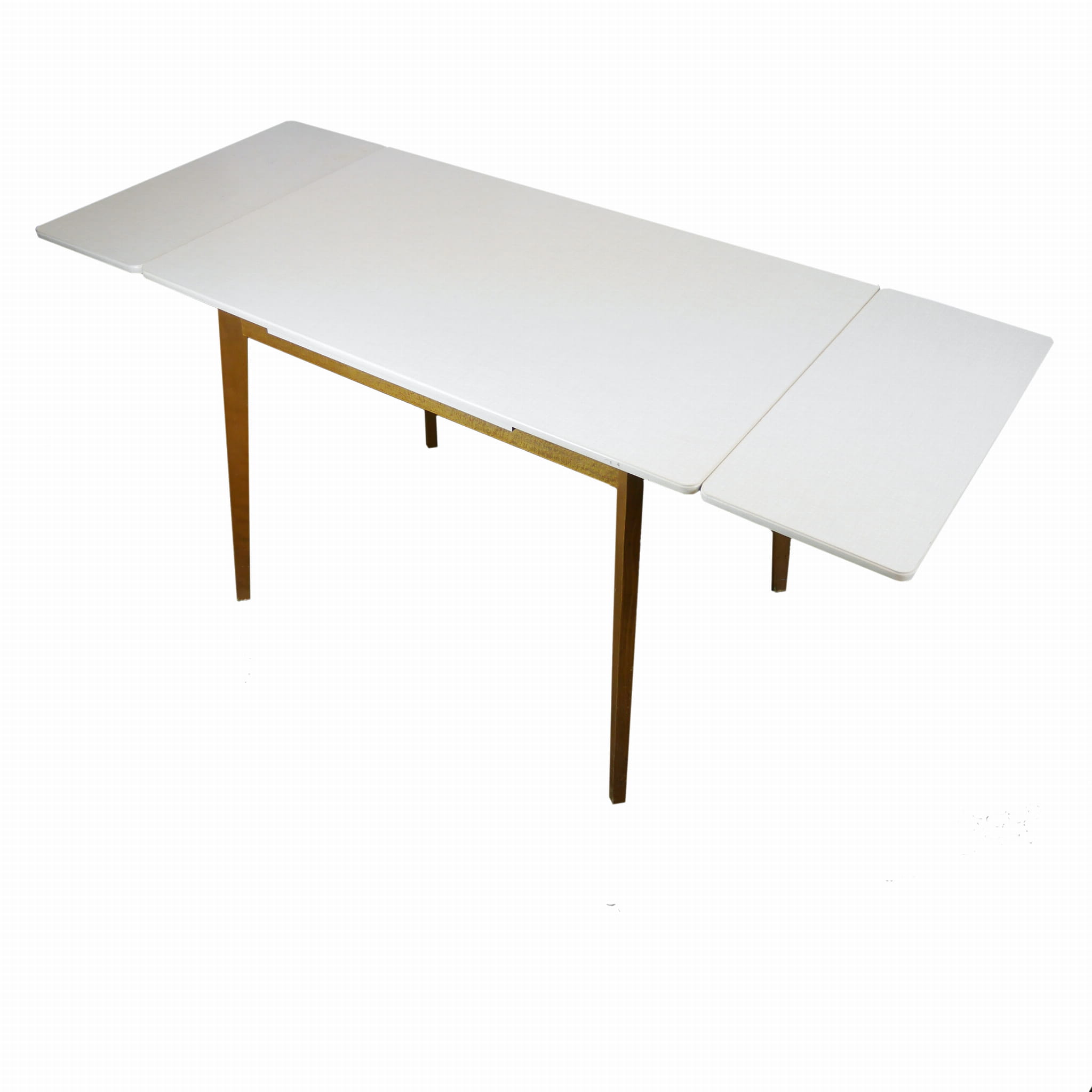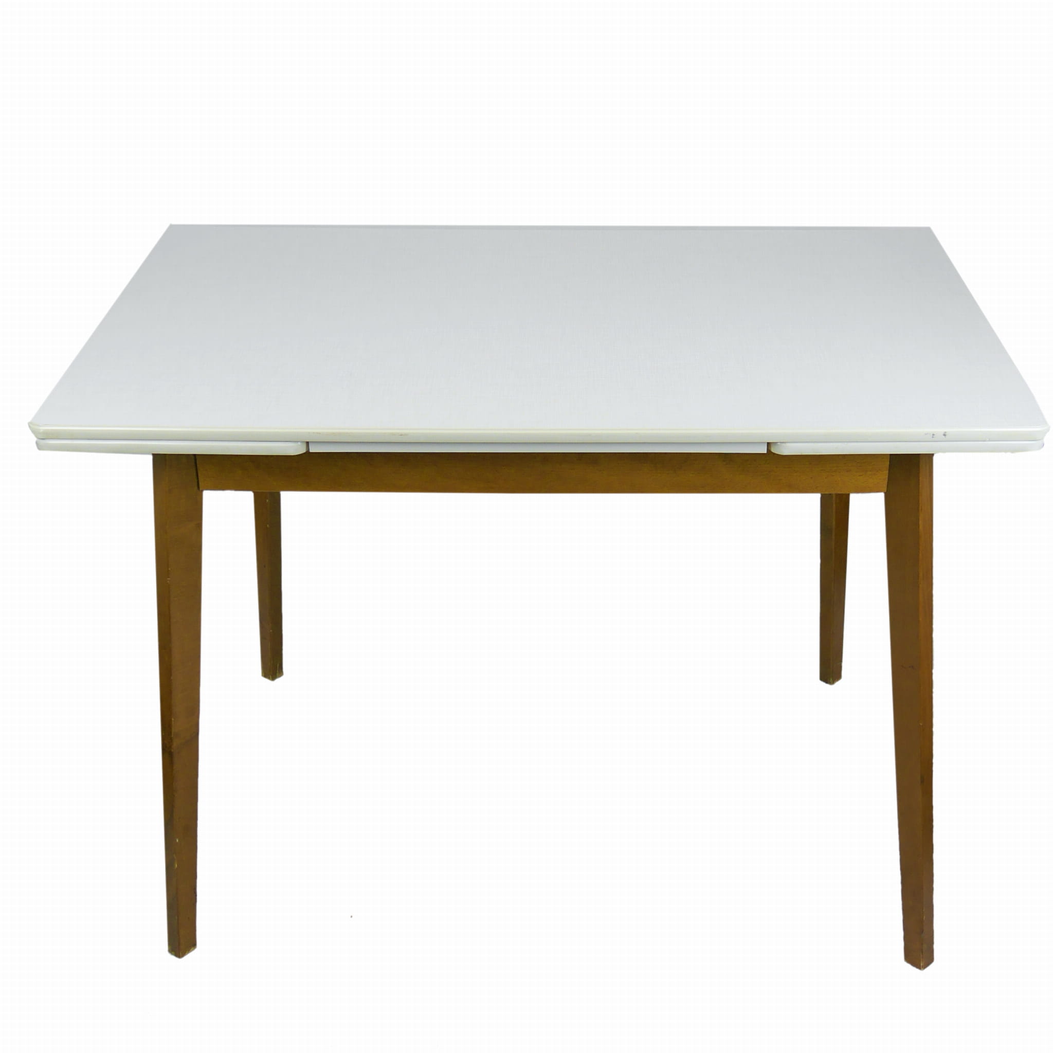 Laminat w charakterystyczną dla lat siedemdziesiątych drobną krateczkę. Brzegi blatu wykończone listwą z jasnoszarego pcv. Stół jest rozkładany, powiększa swoją powierzchnię przez wyciągnięcie dwóch mniejszych płyt.