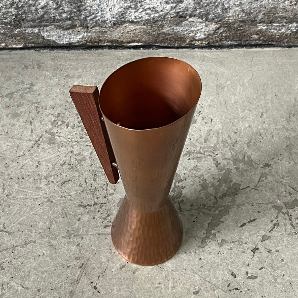 Miedziany dzbanek o wysokości 24 cm, wazon w stylu art deco z uchwytem z drewna tekowego. Wyprodukowany prawdopodobnie przez duńską wytwórnię Joda Wert Arbeit w latach 60/70.