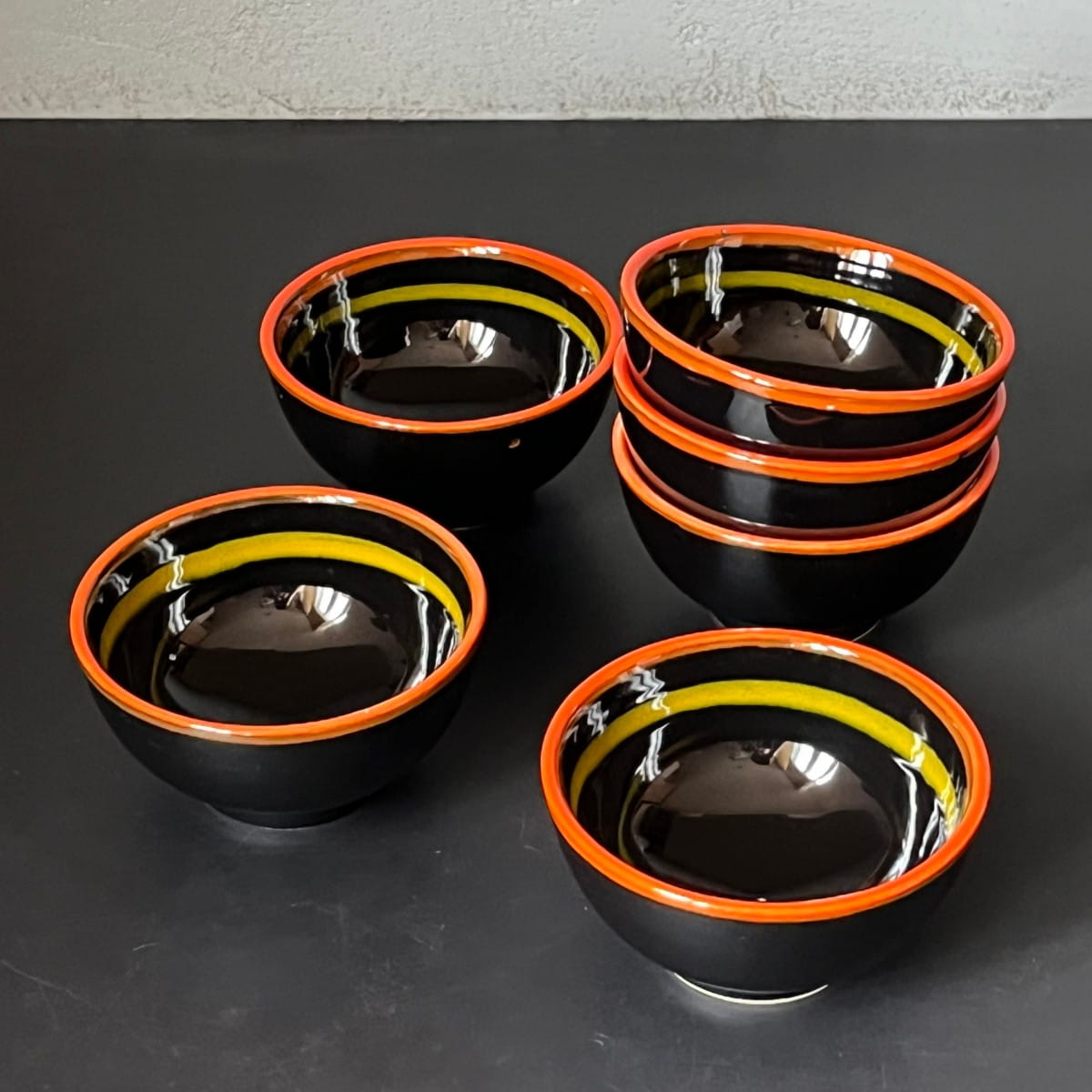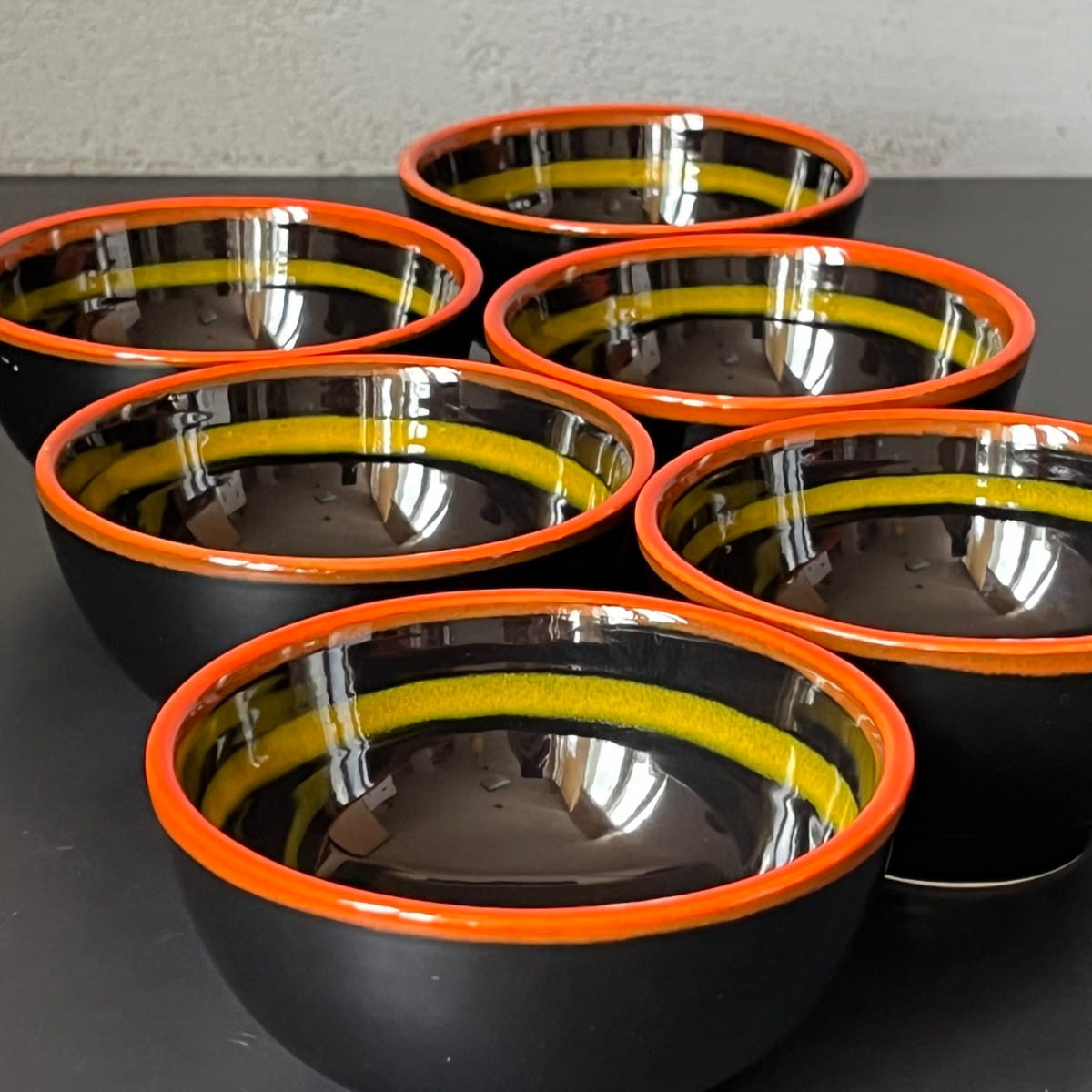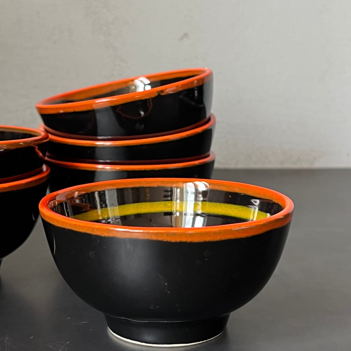 Niewielka czarna miseczka vintage zaprojektowana z dbałością o detal. Ceramiczna miska do serwowania pokryta gładkim czarnym lśniącym szkliwieniem. Krawędzie naczynia ozdobione są pomarańczowym paskiem. Wewnątrz miski pasek w kolorze żółtym.
