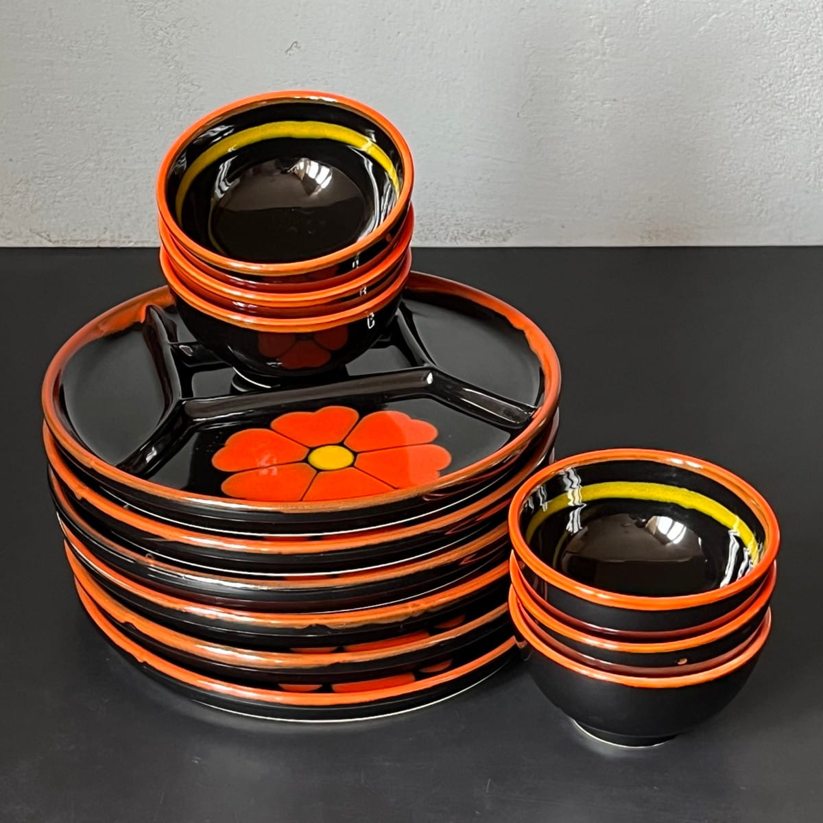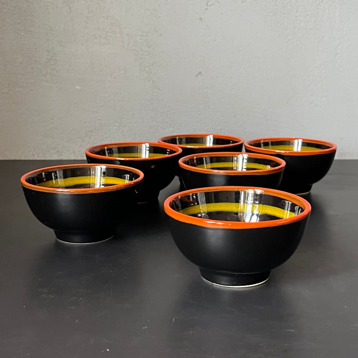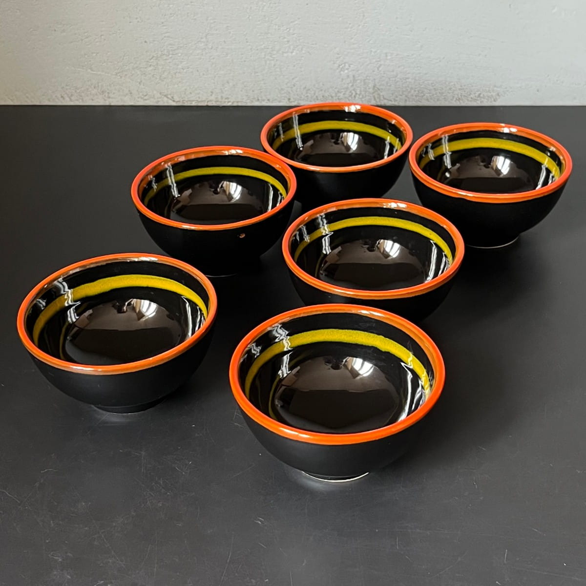 Niewielka czarna miseczka vintage zaprojektowana z dbałością o detal. Ceramiczna miska do serwowania pokryta gładkim czarnym lśniącym szkliwieniem. Krawędzie naczynia ozdobione są pomarańczowym paskiem. Wewnątrz miski pasek w kolorze żółtym.