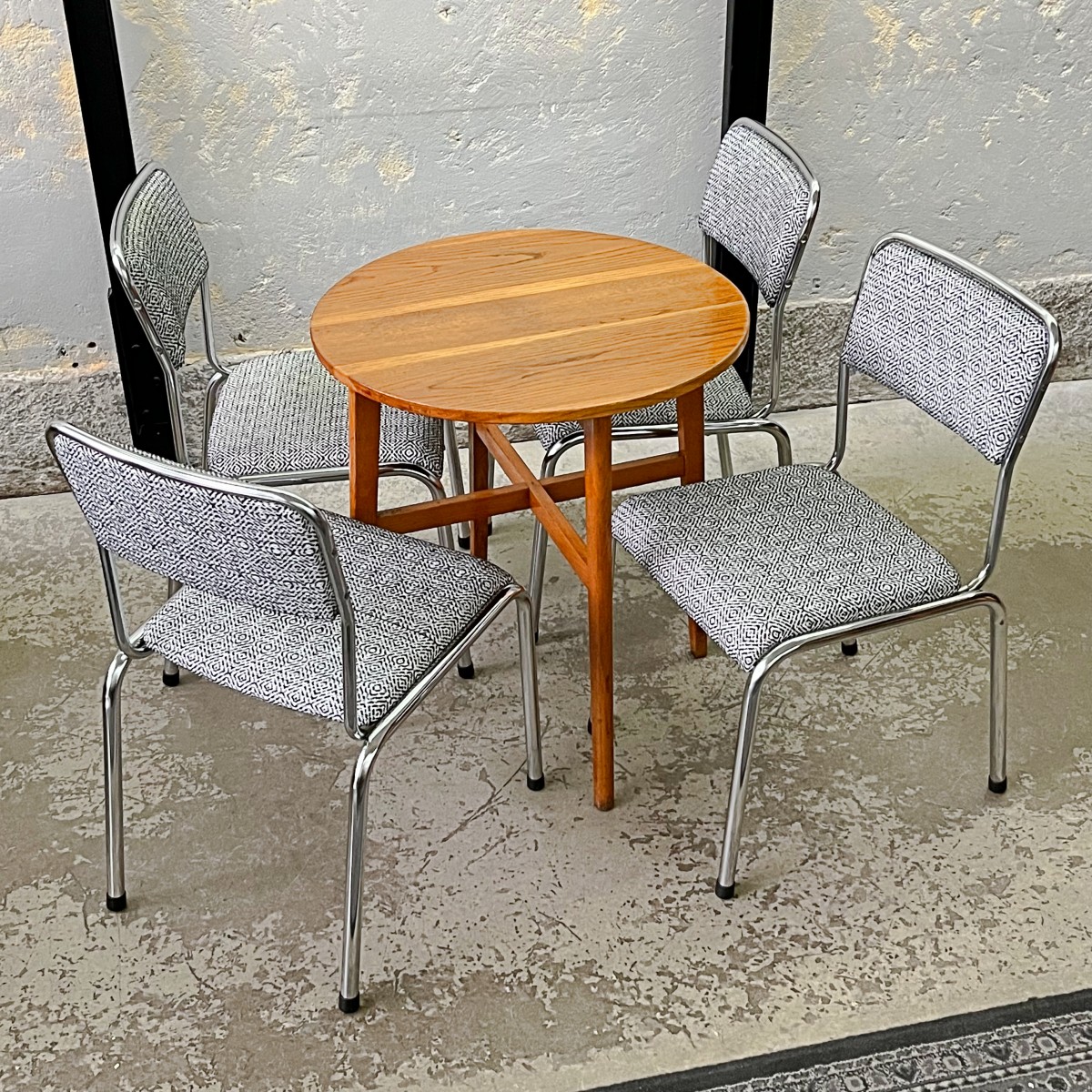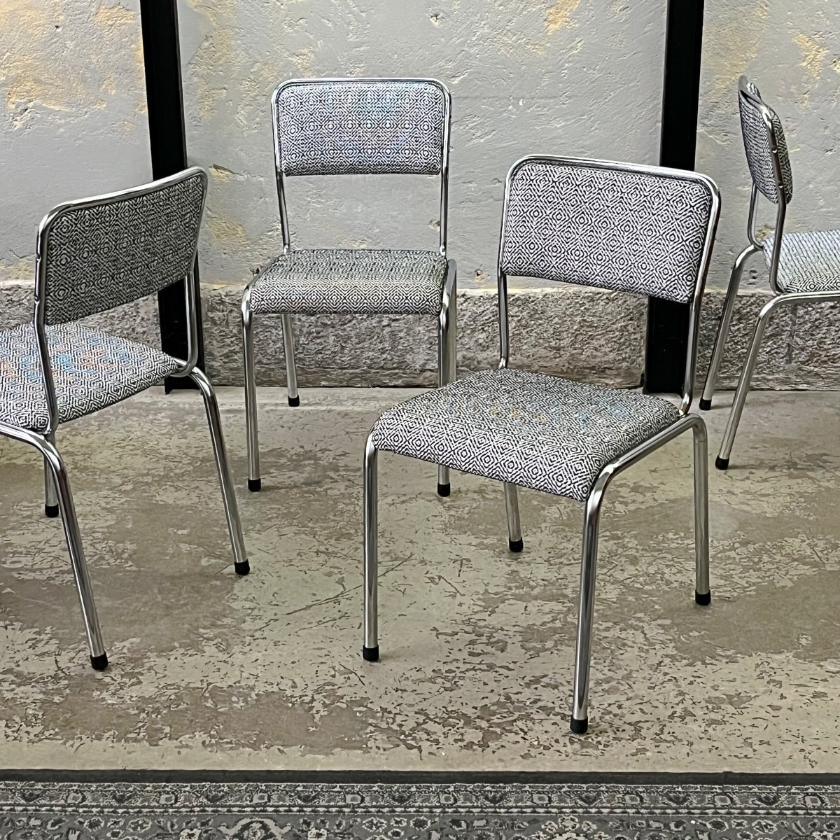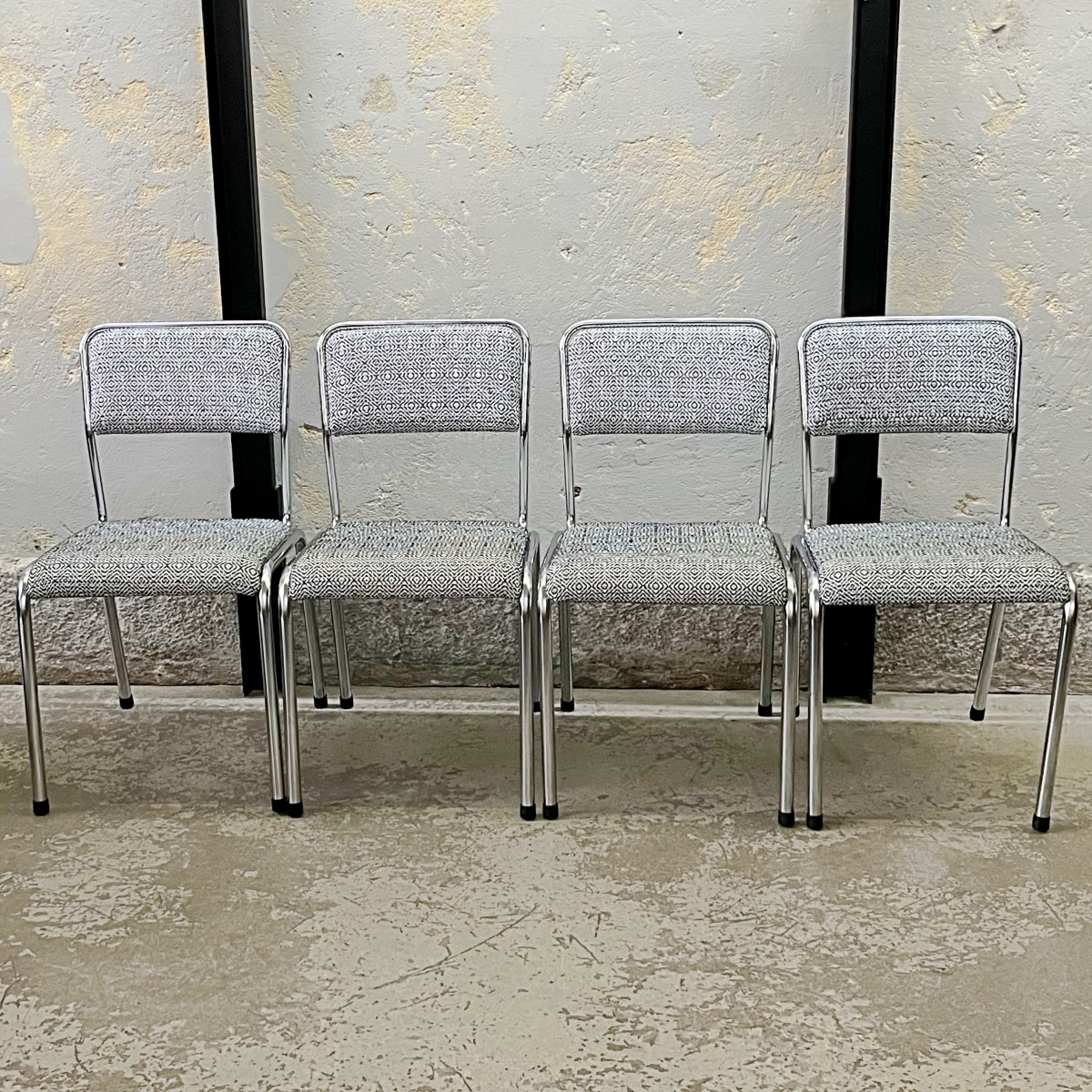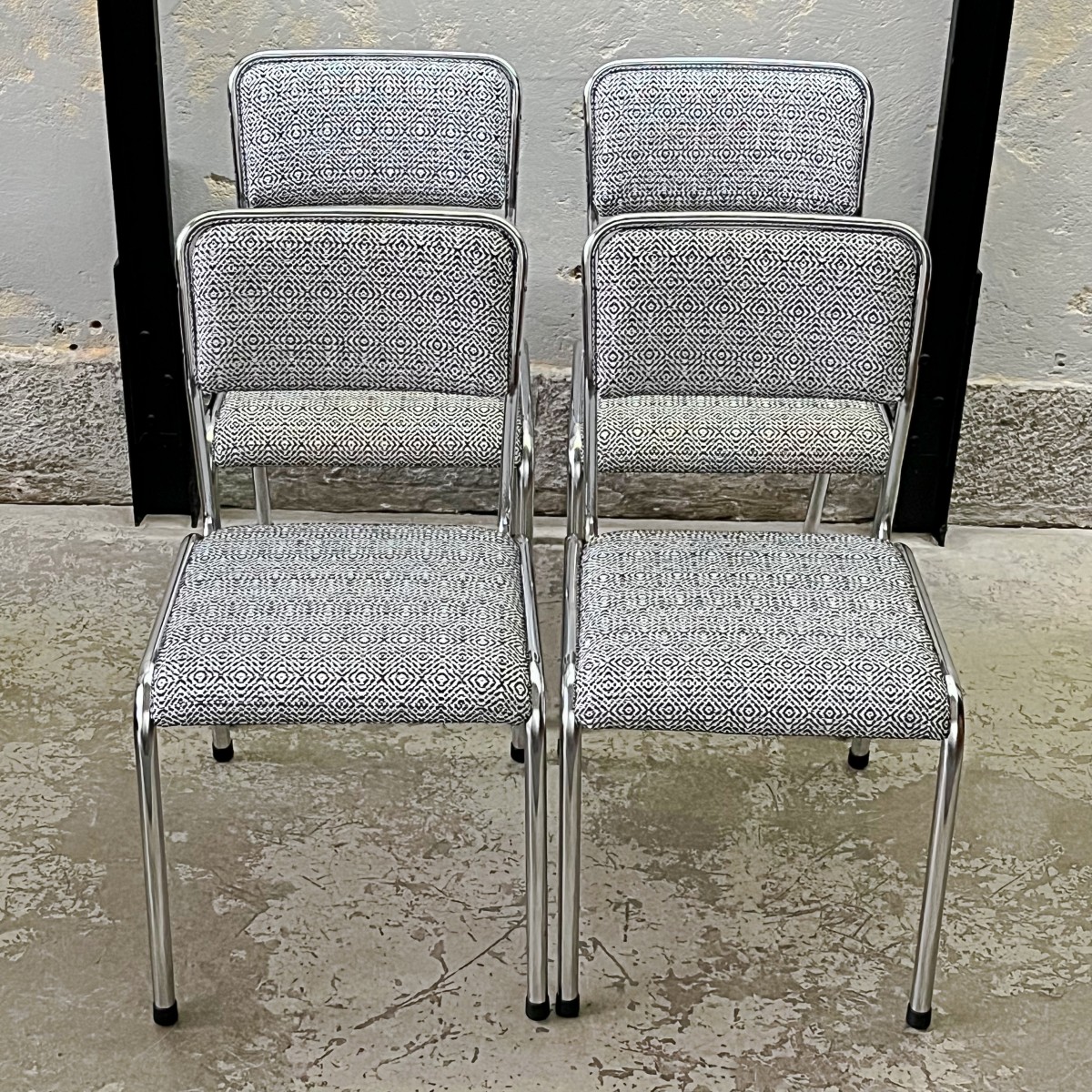 Komplet czterech krzeseł z lat 80./90. w stylu Bauhaus. Klasyk vintage, zgrabne krzesła o lekkiej formie, które są idealnym przykładem ponadczasowego wzornictwa, które kiedyś gościło w niemal każdej kuchni czy jadalni. Postawy krzeseł wykonane z chromowanych giętych rurek, składają się z dwóch elementów. Nogi stanowią zarazem podstawę siedziska, do nich przymocowana jest zamknięta ramka dla tapicerowanego oparcia. Prezentowane krzesła to ponadczasowy produkt. Minimalistyczne i piękne meble. Przykład praktycznego prostego wzornictwa mebli użytkowych.