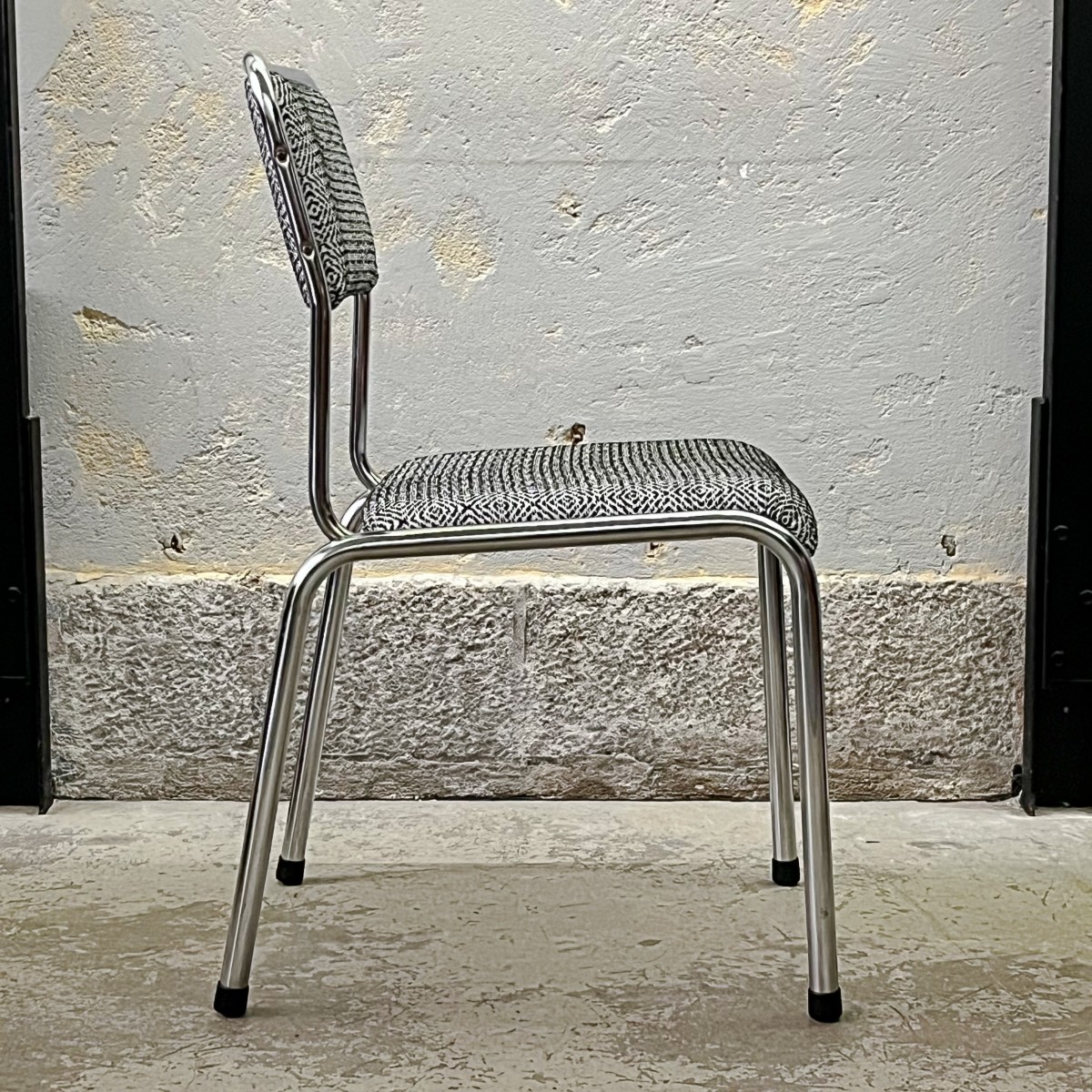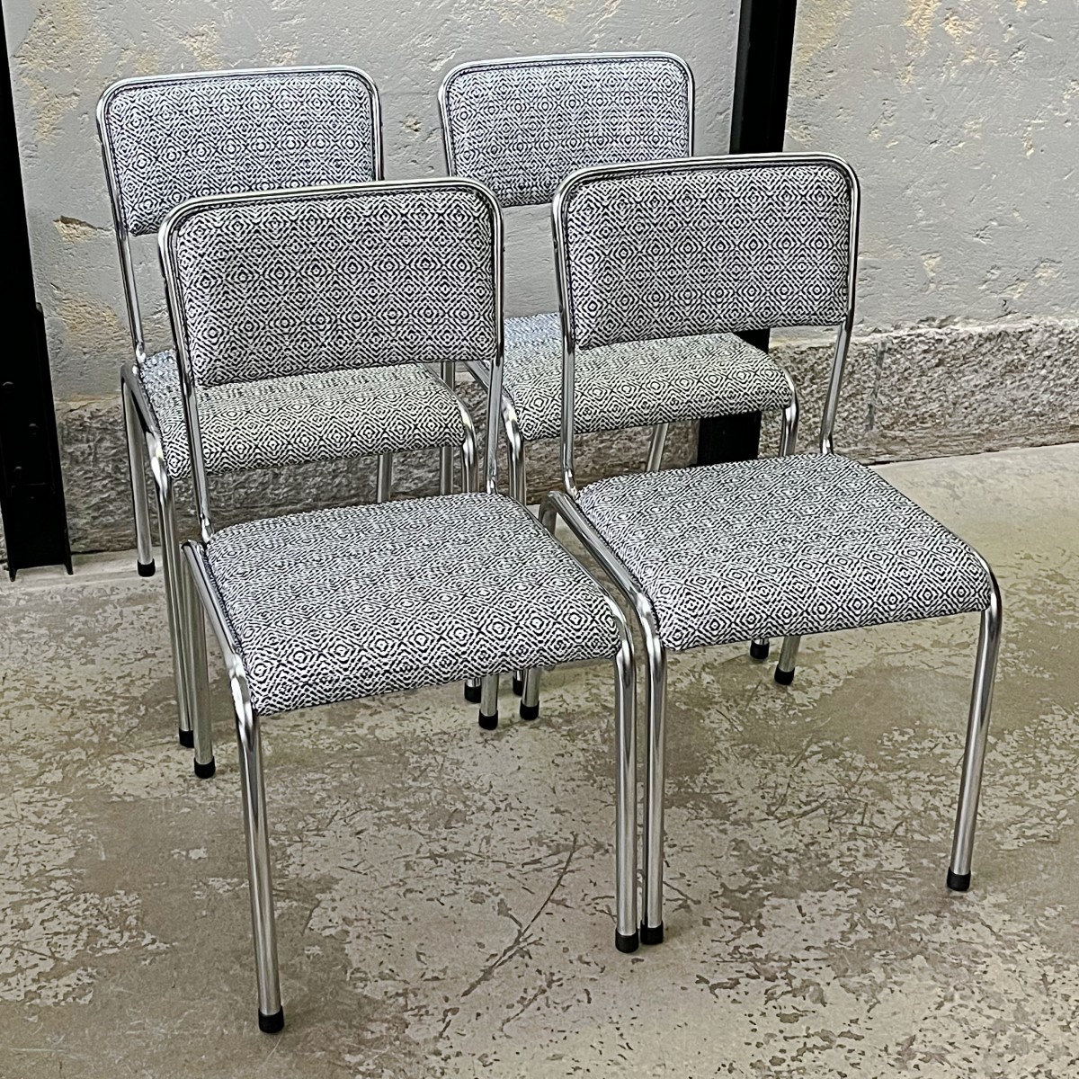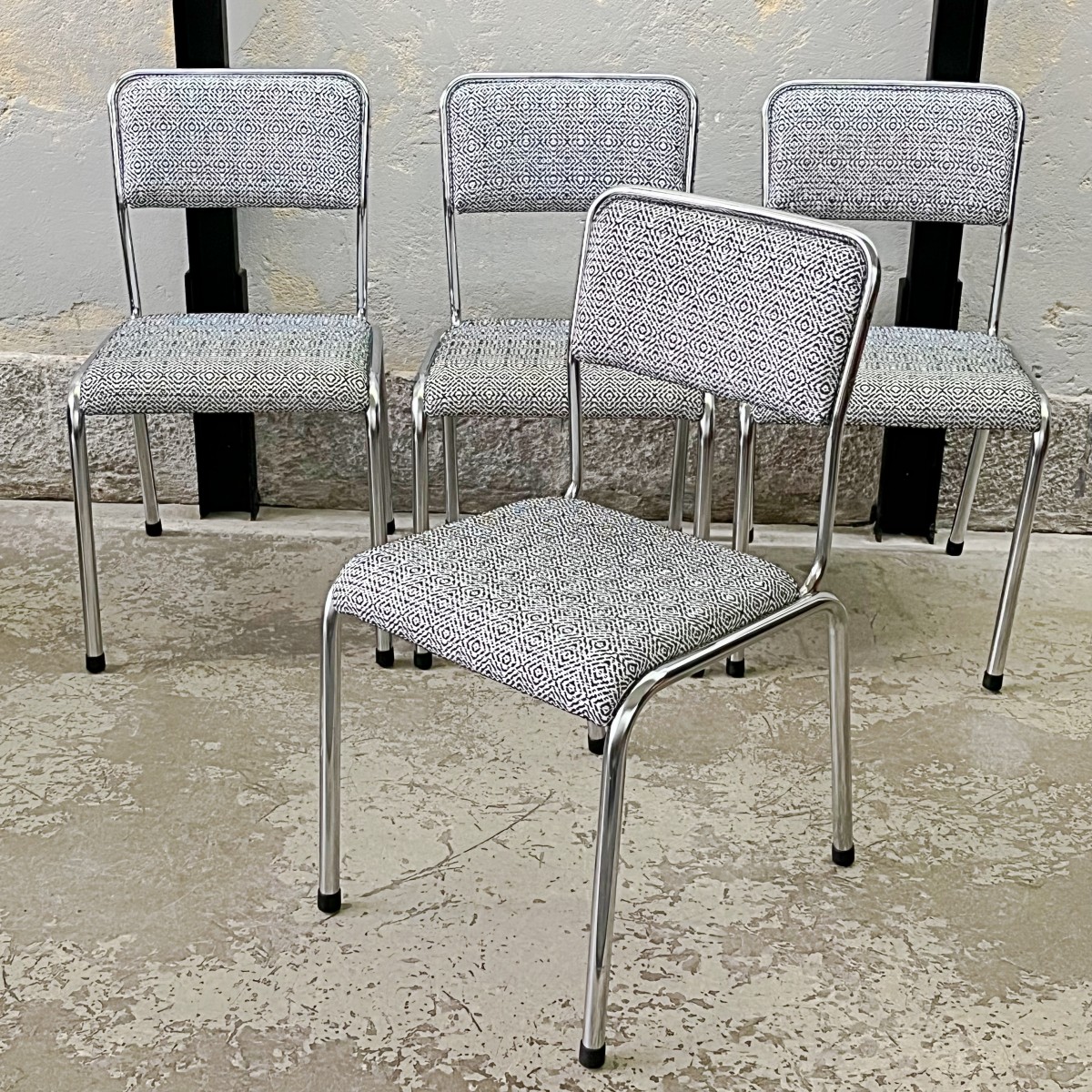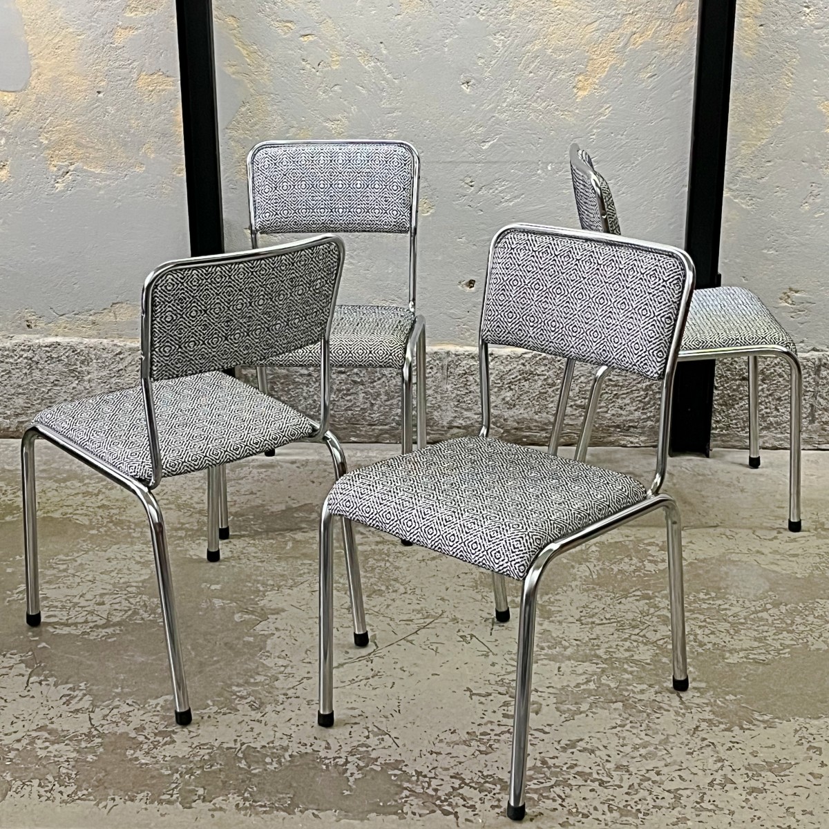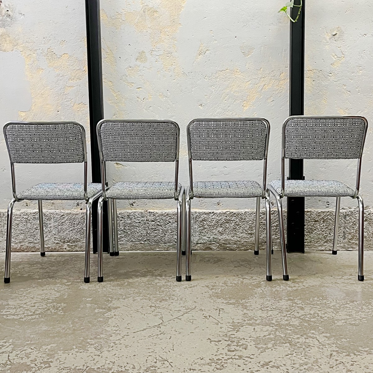 Komplet czterech krzeseł z lat 80./90. w stylu Bauhaus. Klasyk vintage, zgrabne krzesła o lekkiej formie, które są idealnym przykładem ponadczasowego wzornictwa, które kiedyś gościło w niemal każdej kuchni czy jadalni. Postawy krzeseł wykonane z chromowanych giętych rurek, składają się z dwóch elementów. Nogi stanowią zarazem podstawę siedziska, do nich przymocowana jest zamknięta ramka dla tapicerowanego oparcia. Prezentowane krzesła to ponadczasowy produkt. Minimalistyczne i piękne meble. Przykład praktycznego prostego wzornictwa mebli użytkowych.