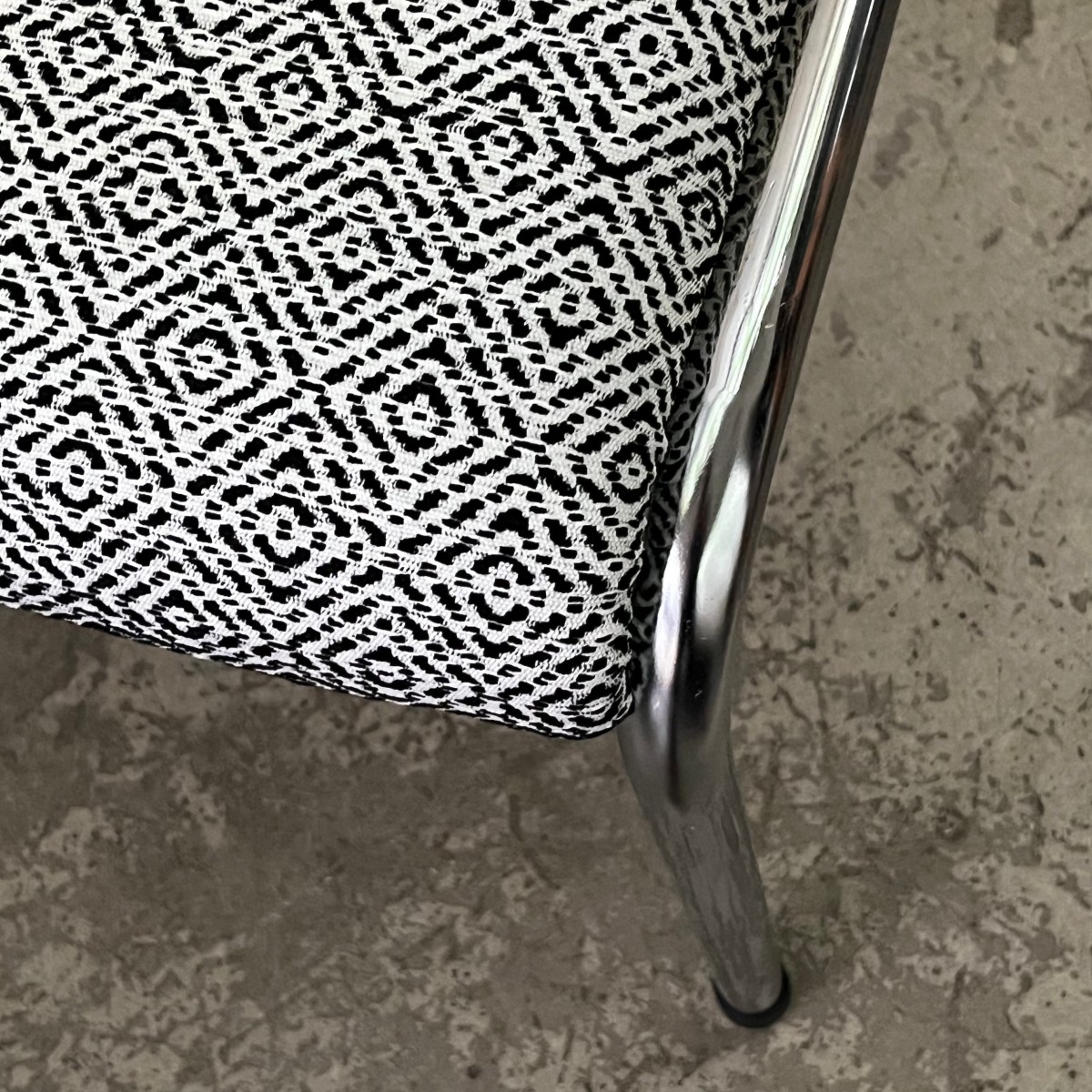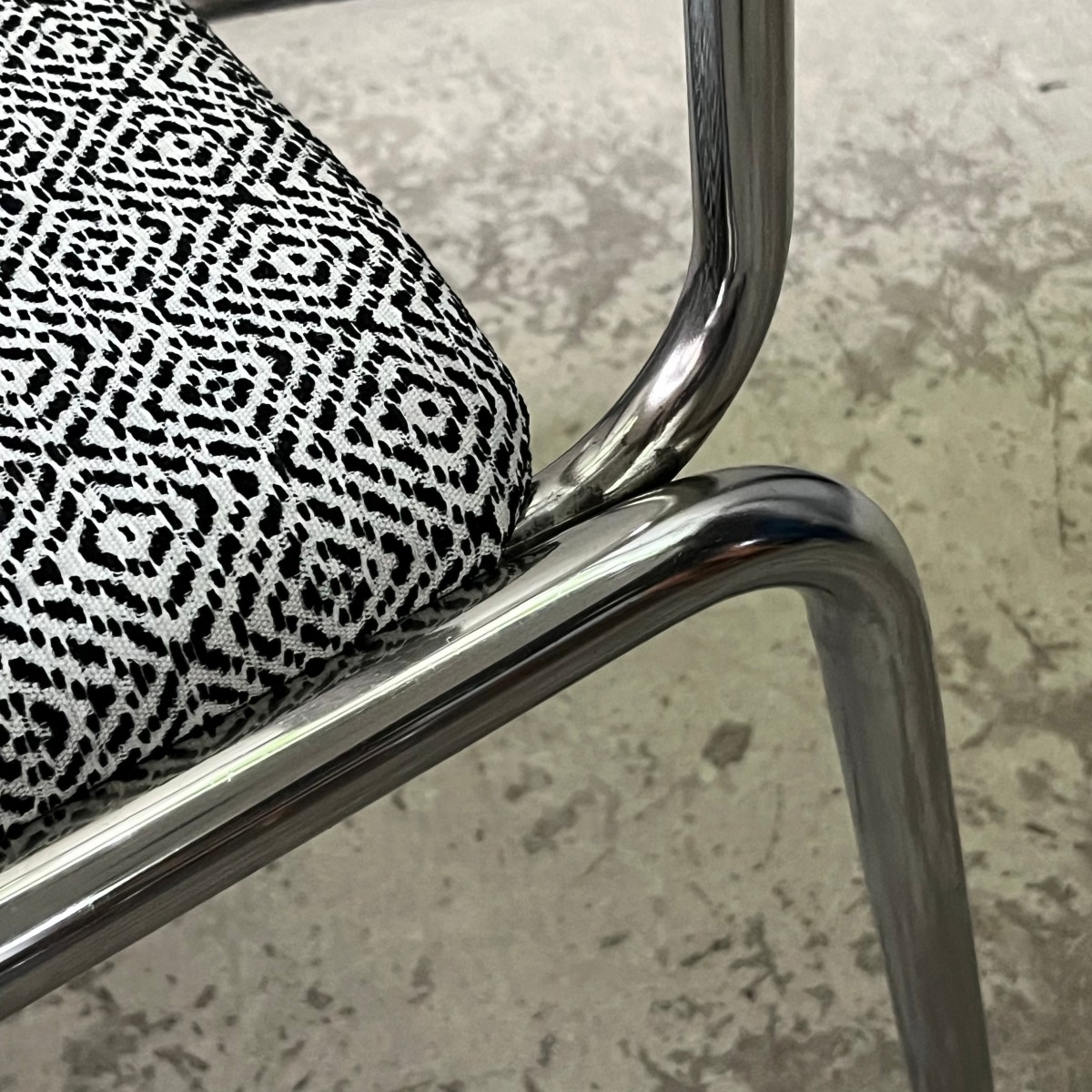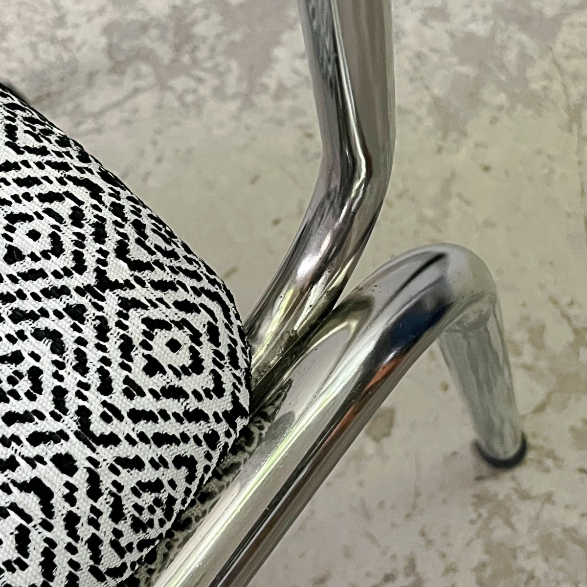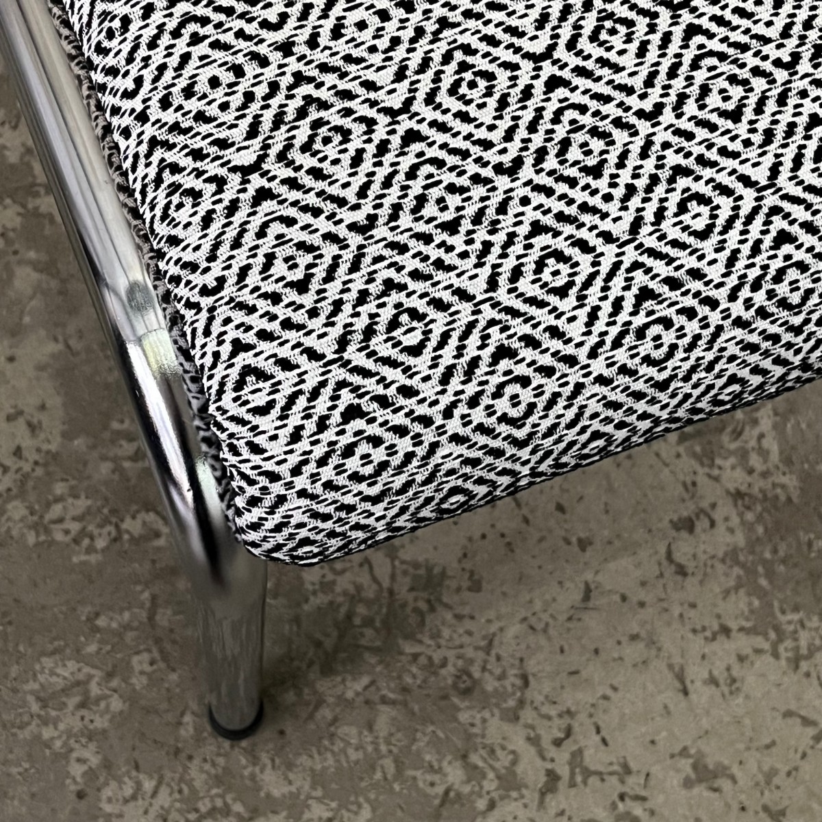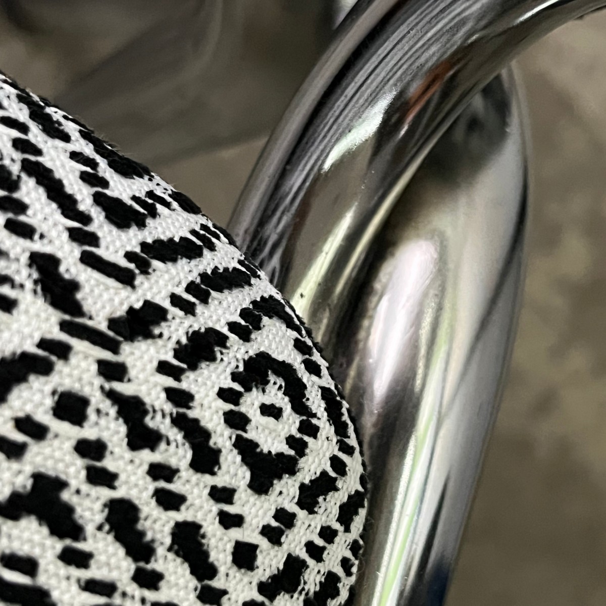 Błyszcząca, chromowana powierzchnia stelaża pięknie odbija światło i nadaje krzesłu elegancji. Lekko profilowane siedzisko i oparcie są tapicerowane, co zapewnia komfort siedzenia. Najmocniejszym punktem jest jednak tkanina obiciowa w wyrazisty, geometryczny, czarno-biały wzór.