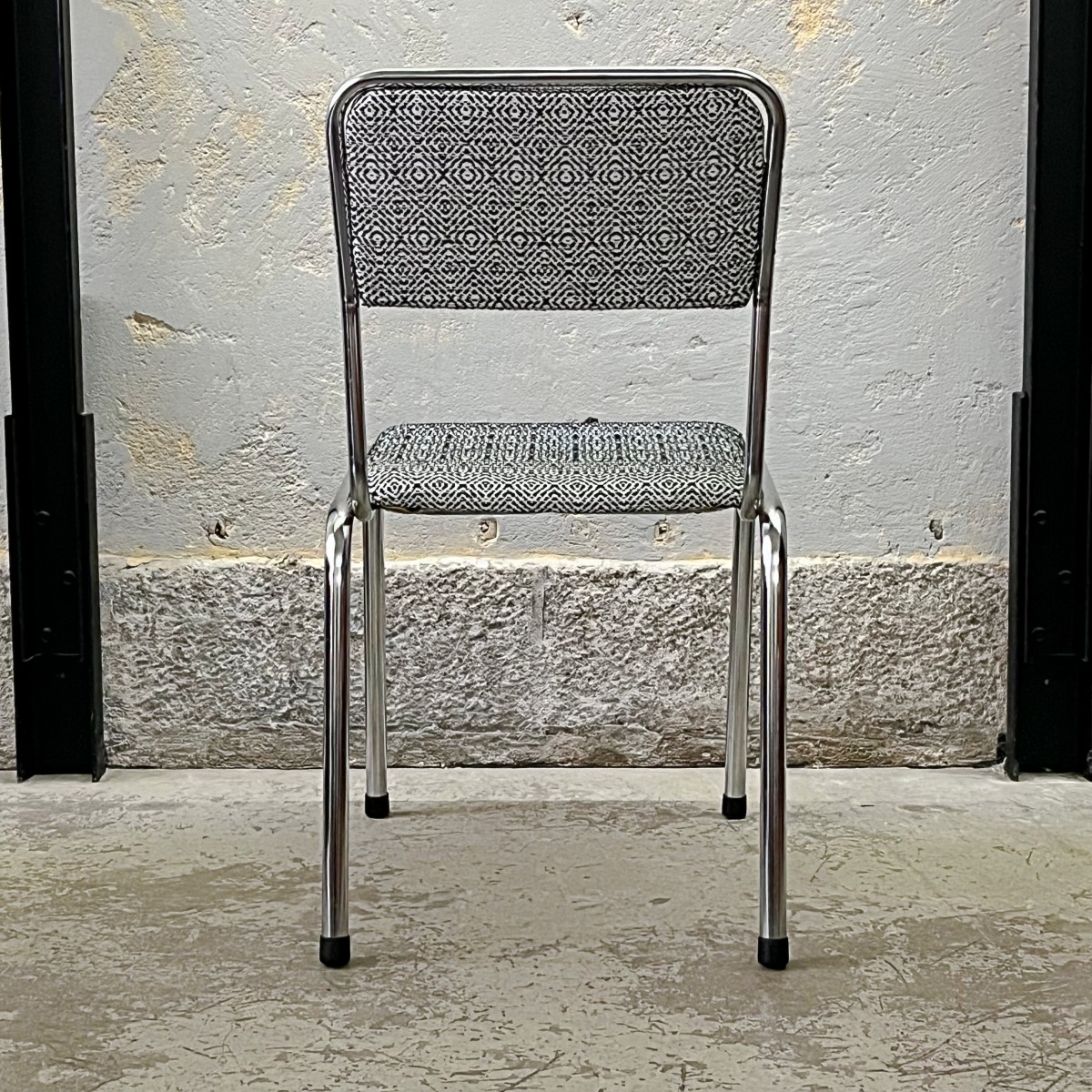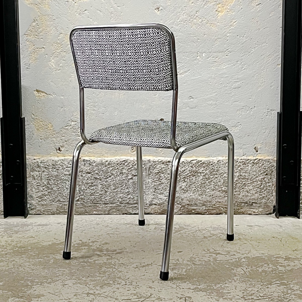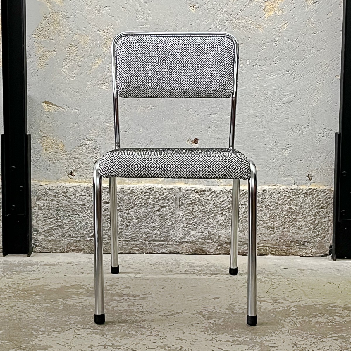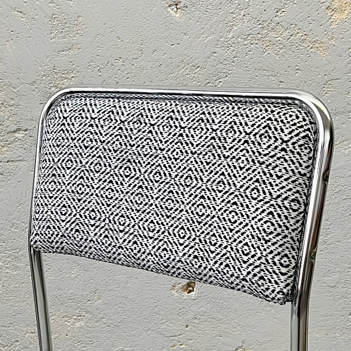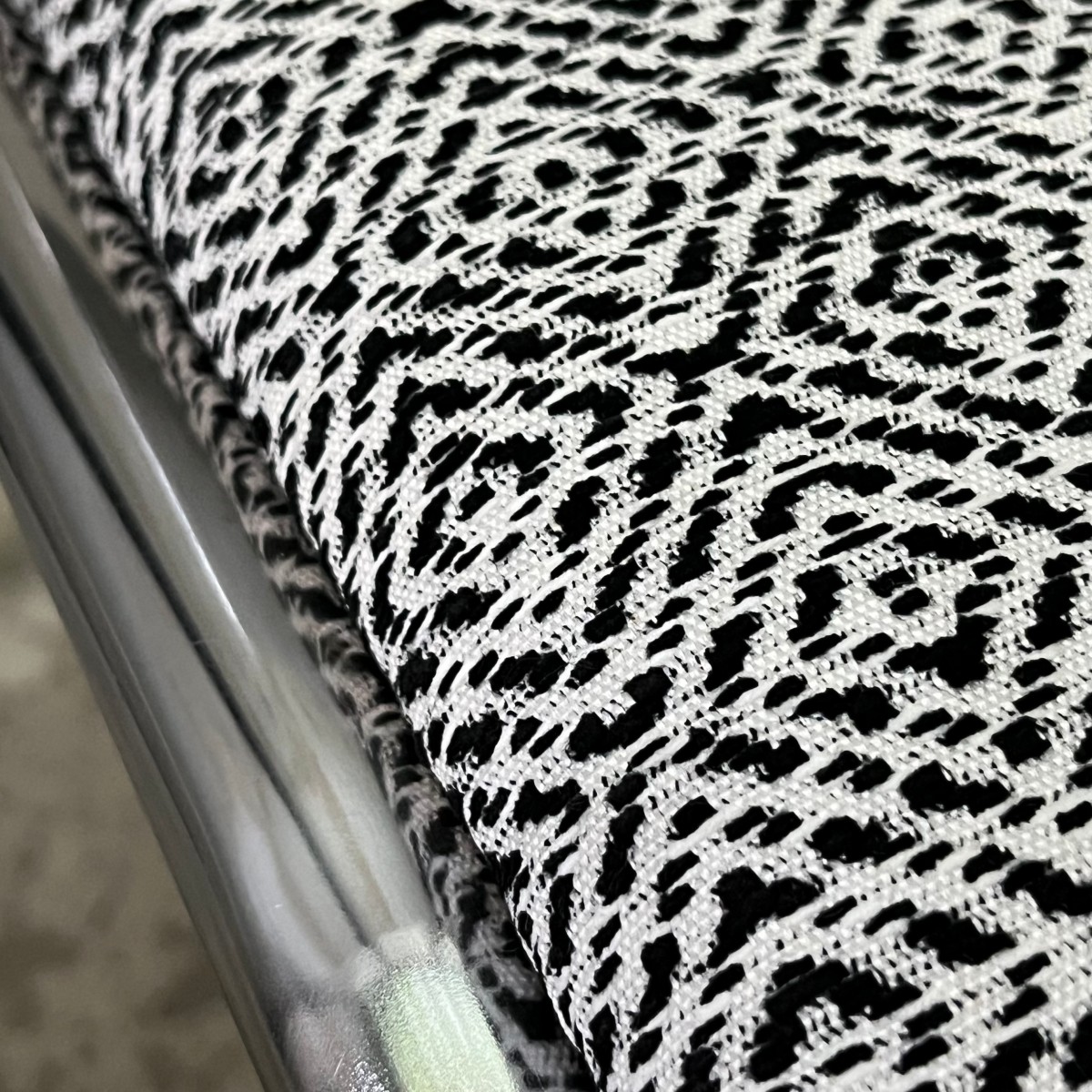 Błyszcząca, chromowana powierzchnia stelaża pięknie odbija światło i nadaje krzesłu elegancji. Lekko profilowane siedzisko i oparcie są tapicerowane, co zapewnia komfort siedzenia. Najmocniejszym punktem jest jednak tkanina obiciowa w wyrazisty, geometryczny, czarno-biały wzór.