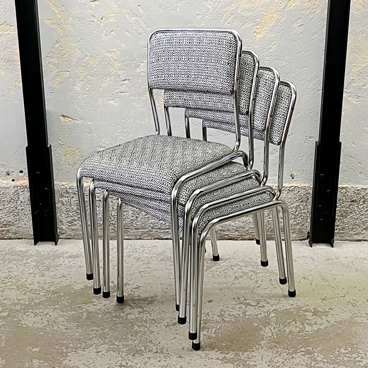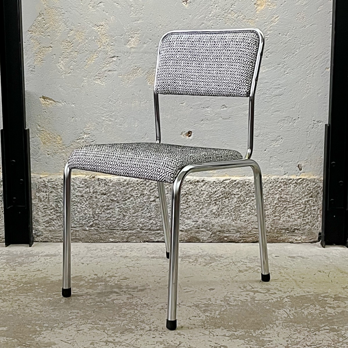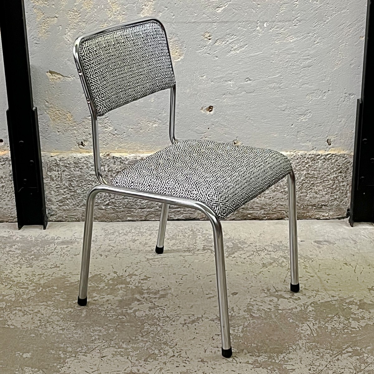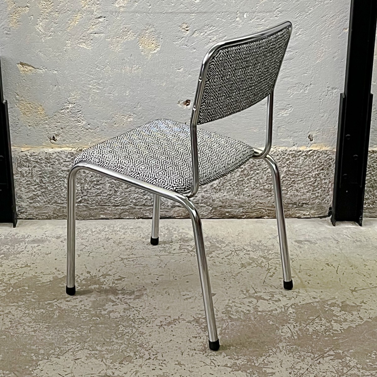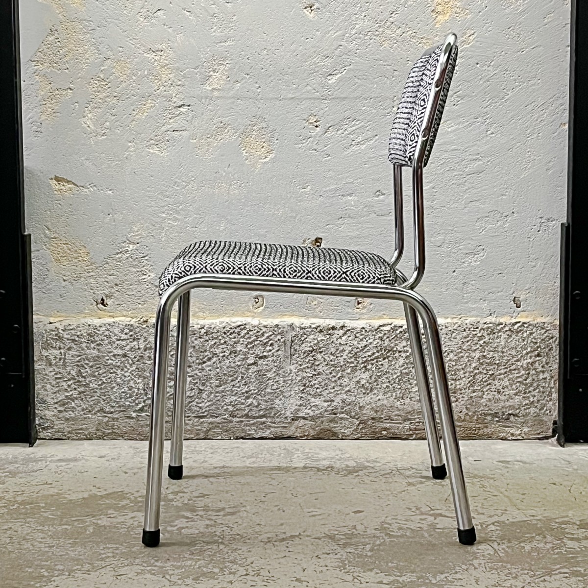 Błyszcząca, chromowana powierzchnia stelaża pięknie odbija światło i nadaje krzesłu elegancji. Lekko profilowane siedzisko i oparcie są tapicerowane, co zapewnia komfort siedzenia. Najmocniejszym punktem jest jednak tkanina obiciowa w wyrazisty, geometryczny, czarno-biały wzór.