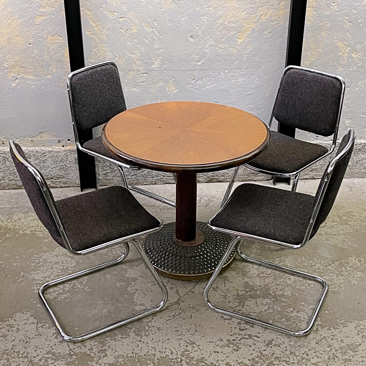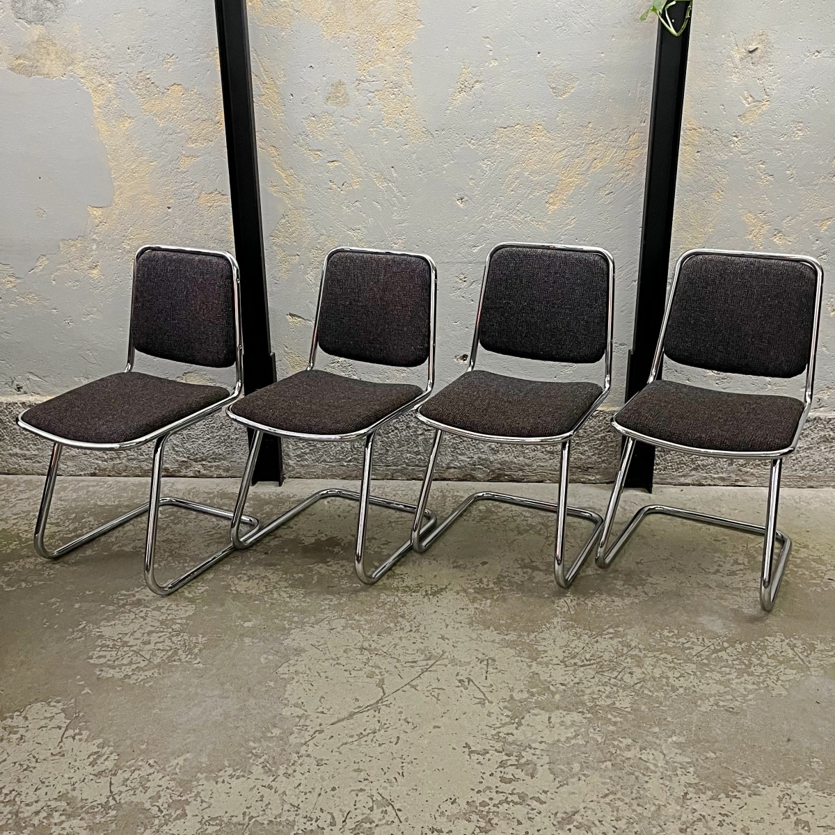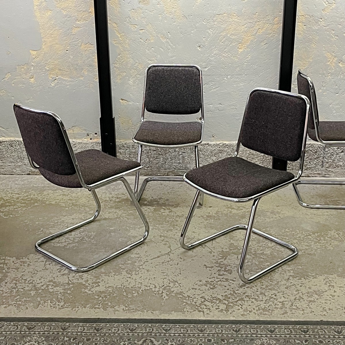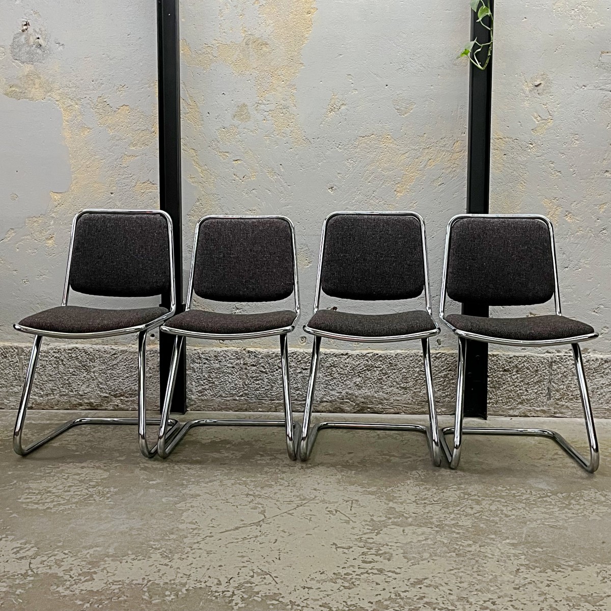 Krzesła nie są nowe, to używane meble z przeszłością zachowane w oryginalnym stanie vintage. Krzesła technicznie i wizerunkowo zachowane w bardzo dobrym stanie. Elementy chromowane noszą ślady użytkowania w postaci drobnych rys i przebarwień, co jest naturalne dla mebli w tym wieku. Na jednym z krzeseł na nodze jest niewielki ubytek chromowanej powłoki. Konstrukcja krzeseł mocna i stabilna. Krzesła są sprawne i gotowe do użytkowania. Rewelacyjny zestaw!