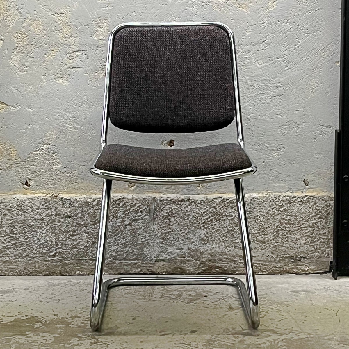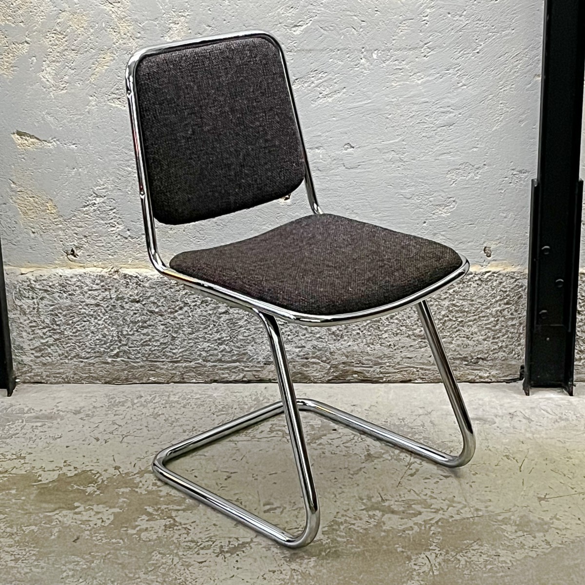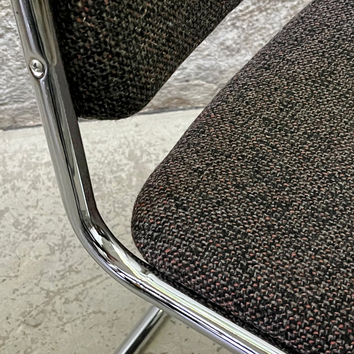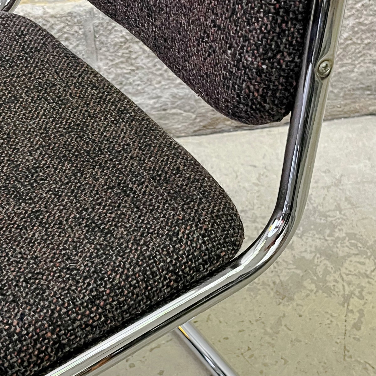 Podstawa krzeseł została wykonana z mocnych giętych metalowych rurek, co sprawia, że krzesła są solidne i stabilne. Błyszczący metal dodaje im również industrialnego charakteru. Melanżowa tkanina tapicerki doskonale komponuje się z chromowaną ramą, tworząc harmonijną całość. Prosta i nowoczesna linia krzeseł pasuje do różnych stylów aranżacji, od wnętrz minimalistycznych po awangardowe.