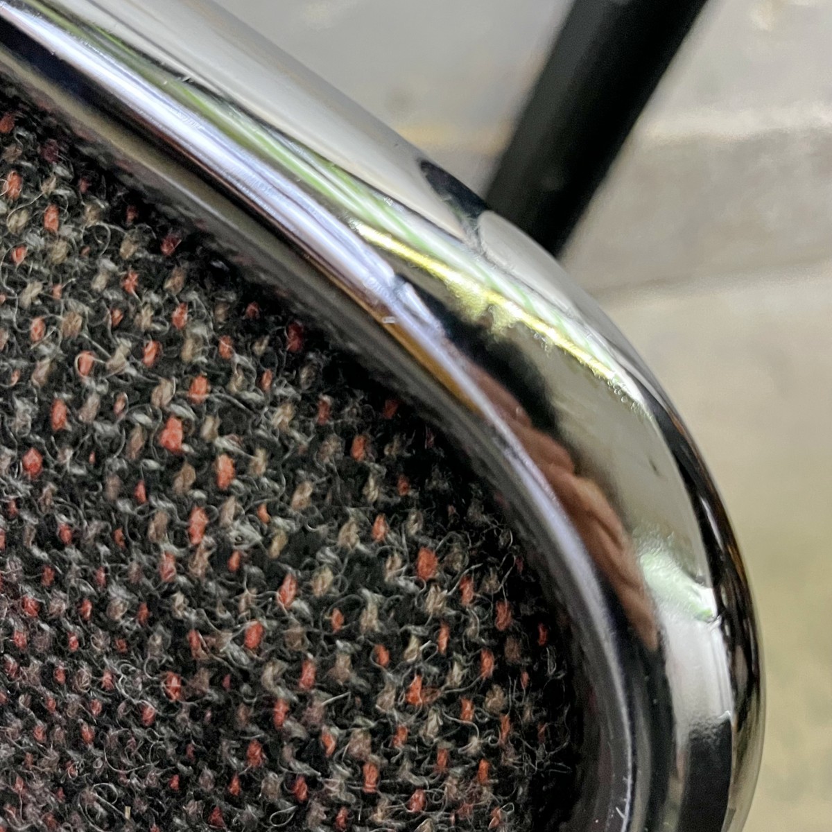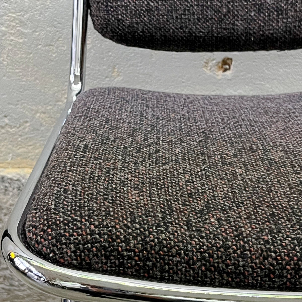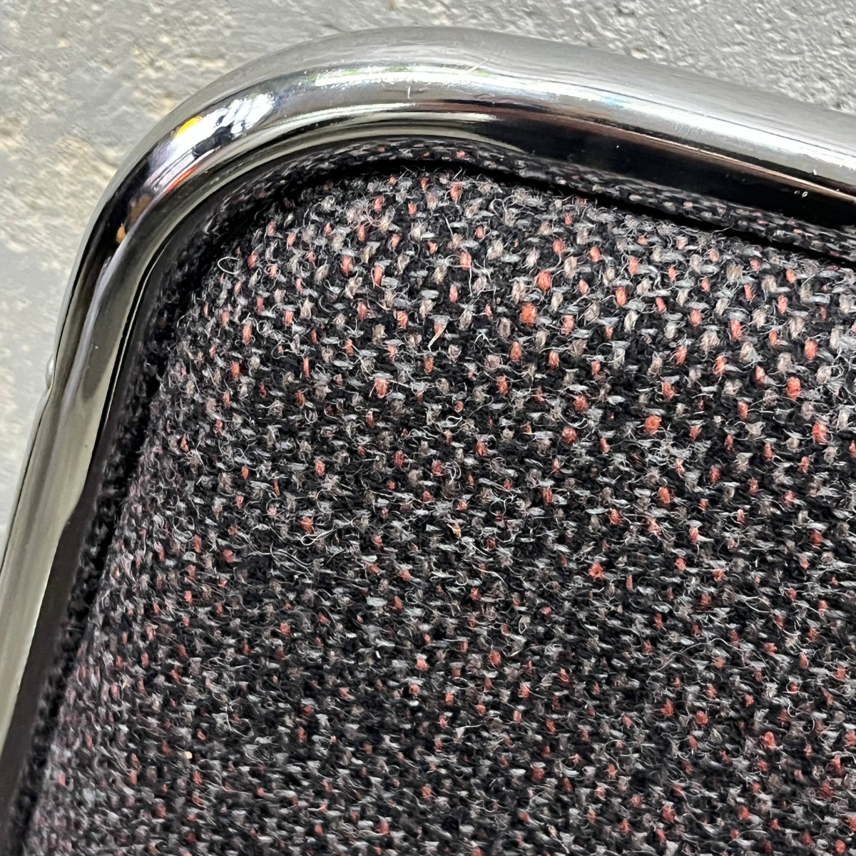 Krzesła po renowacji tapicerskiej. Stare obicie zastąpiono nowoczesną tkaniną tapicerską z domieszką wełny. Dominującymi kolorami są: czarny, czerwony i szaro-fioletowy. Wielokolorowa pleciona tkanina dobrze współgra z błyszczącym metalem. W nowej odsłonie prezentują się naprawdę doskonale.