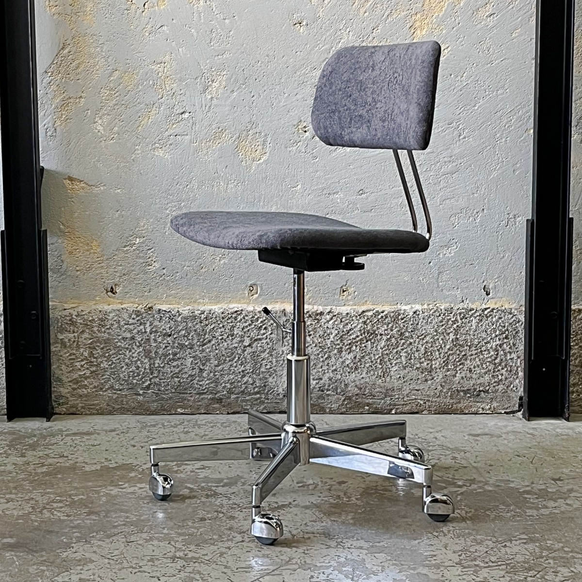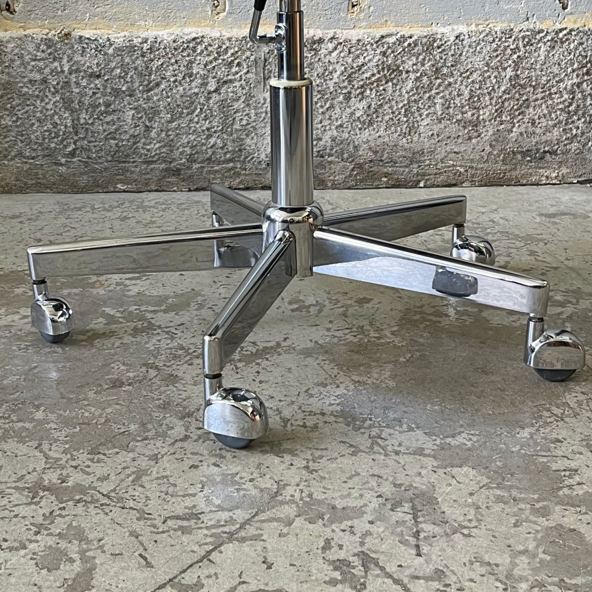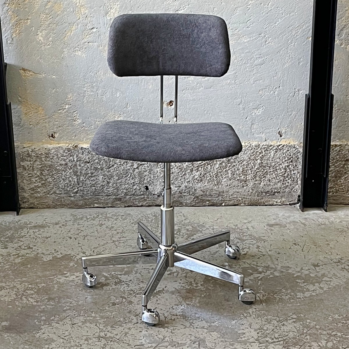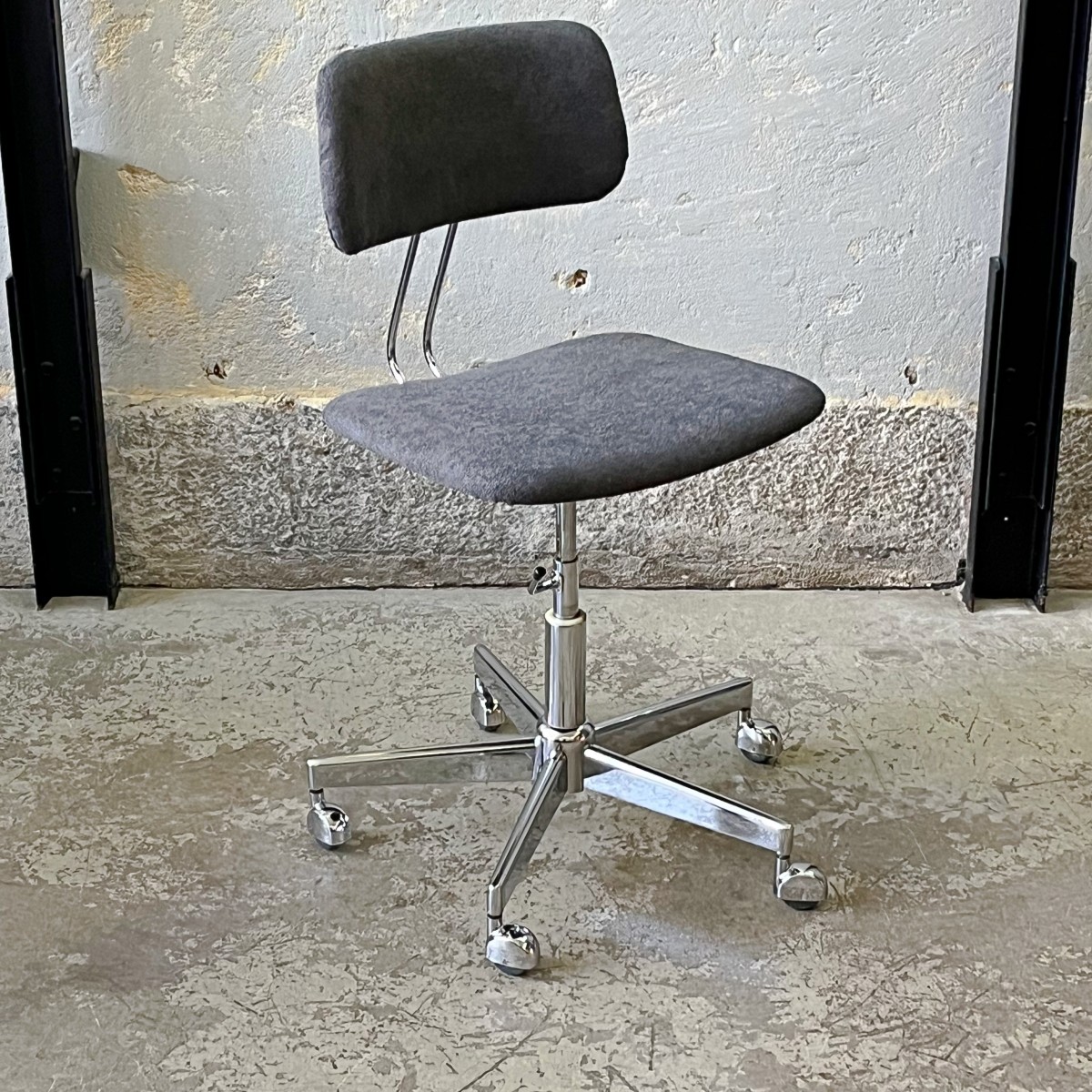 Tapicerowane krzesło biurowe w stylu Bauhaus wyprodukowane w latach 70. lub 60. Obrotowe krzesło na kołach o wyjątkowej formie. Składa się z pięcioramiennej metalowej podstawy na kółkach, stalowego mocowania siedziska i chromowanego stelażu podtrzymującego oparcie. Krzesło wyposażone jest mechanizm regulujący wysokość siedziska.