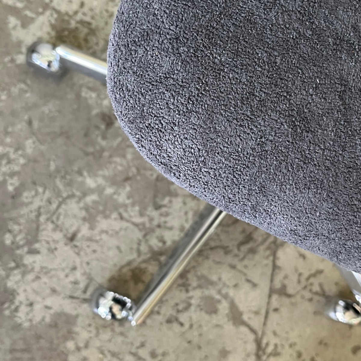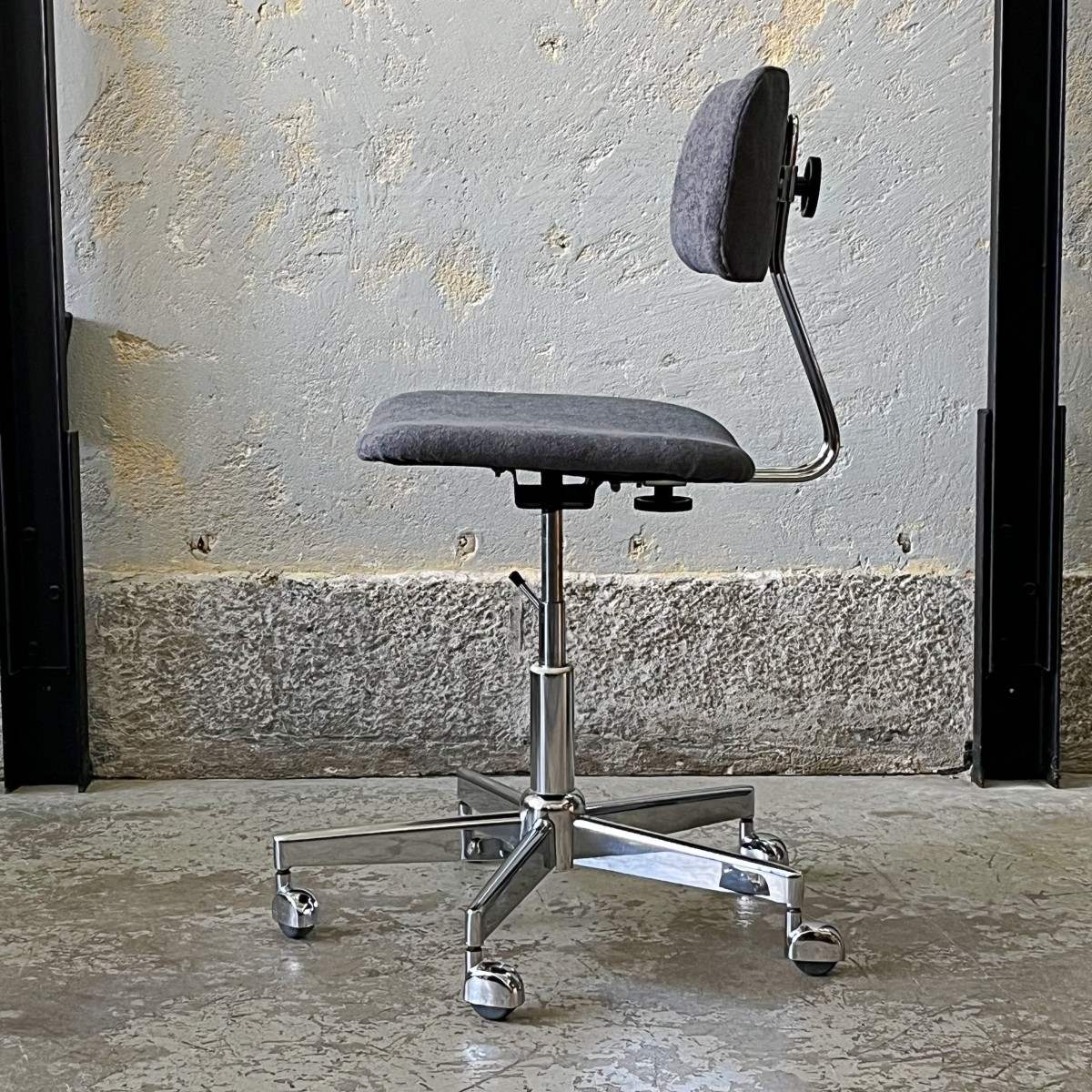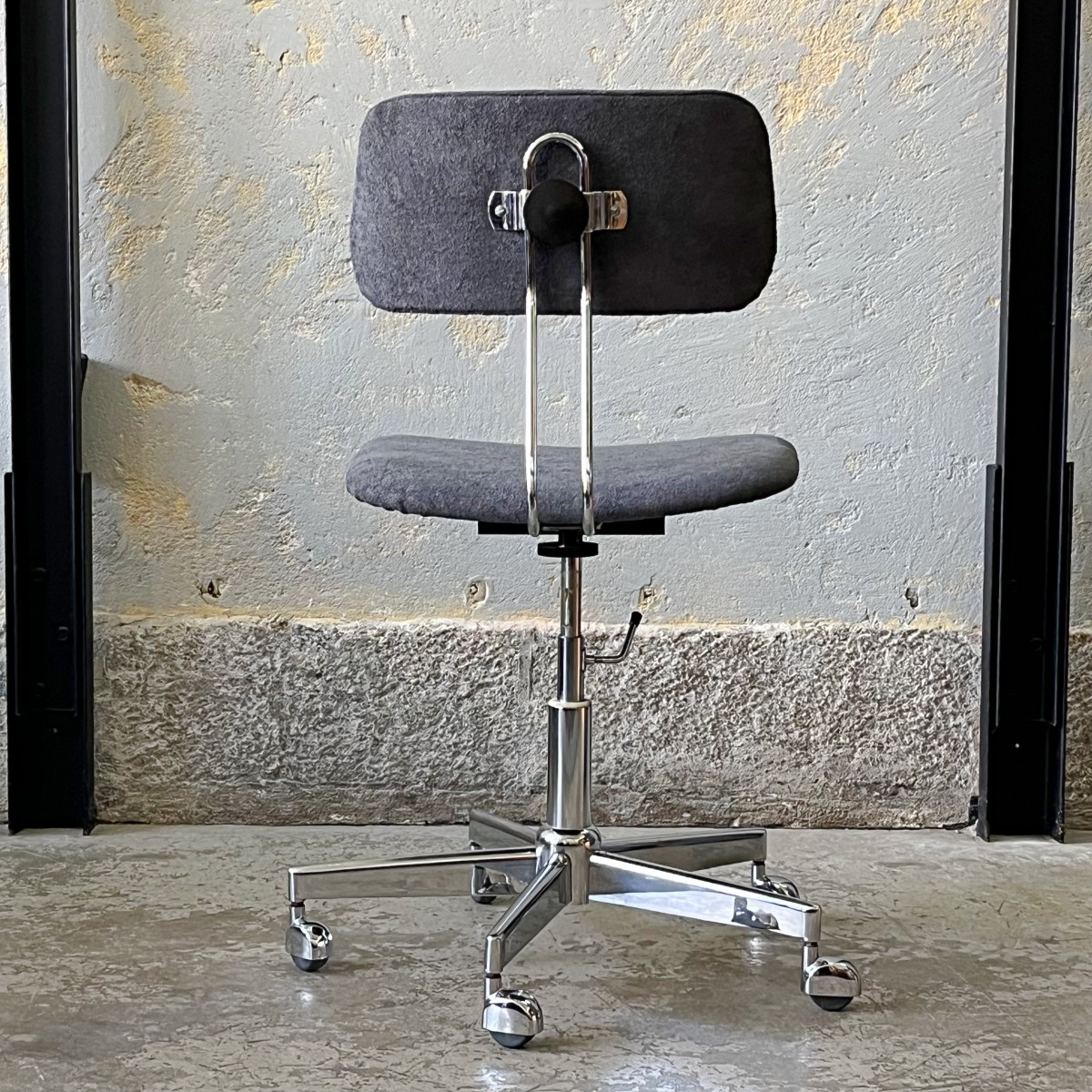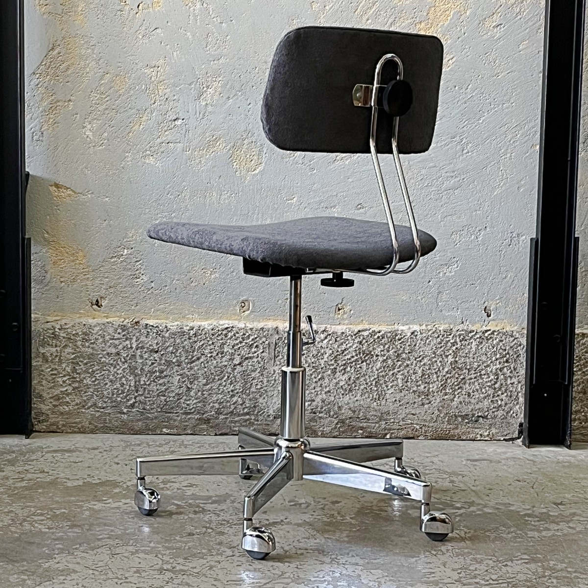 Tapicerowane krzesło biurowe w stylu Bauhaus wyprodukowane w latach 70. lub 60. Obrotowe krzesło na kołach o wyjątkowej formie. Składa się z pięcioramiennej metalowej podstawy na kółkach, stalowego mocowania siedziska i chromowanego stelażu podtrzymującego oparcie. Krzesło wyposażone jest mechanizm regulujący wysokość siedziska.