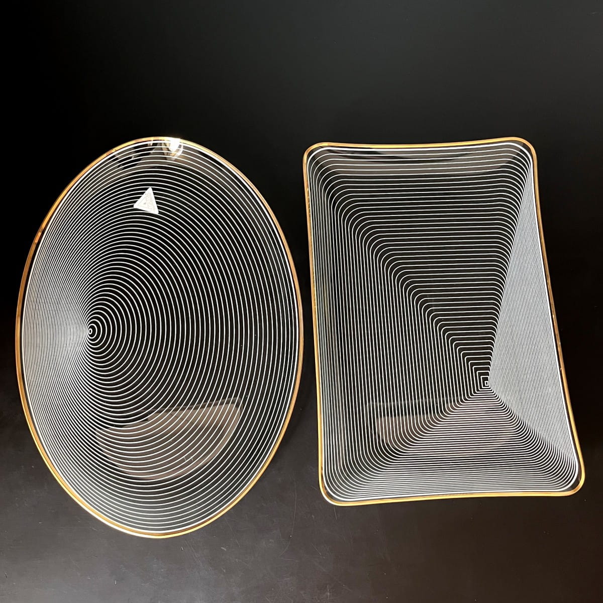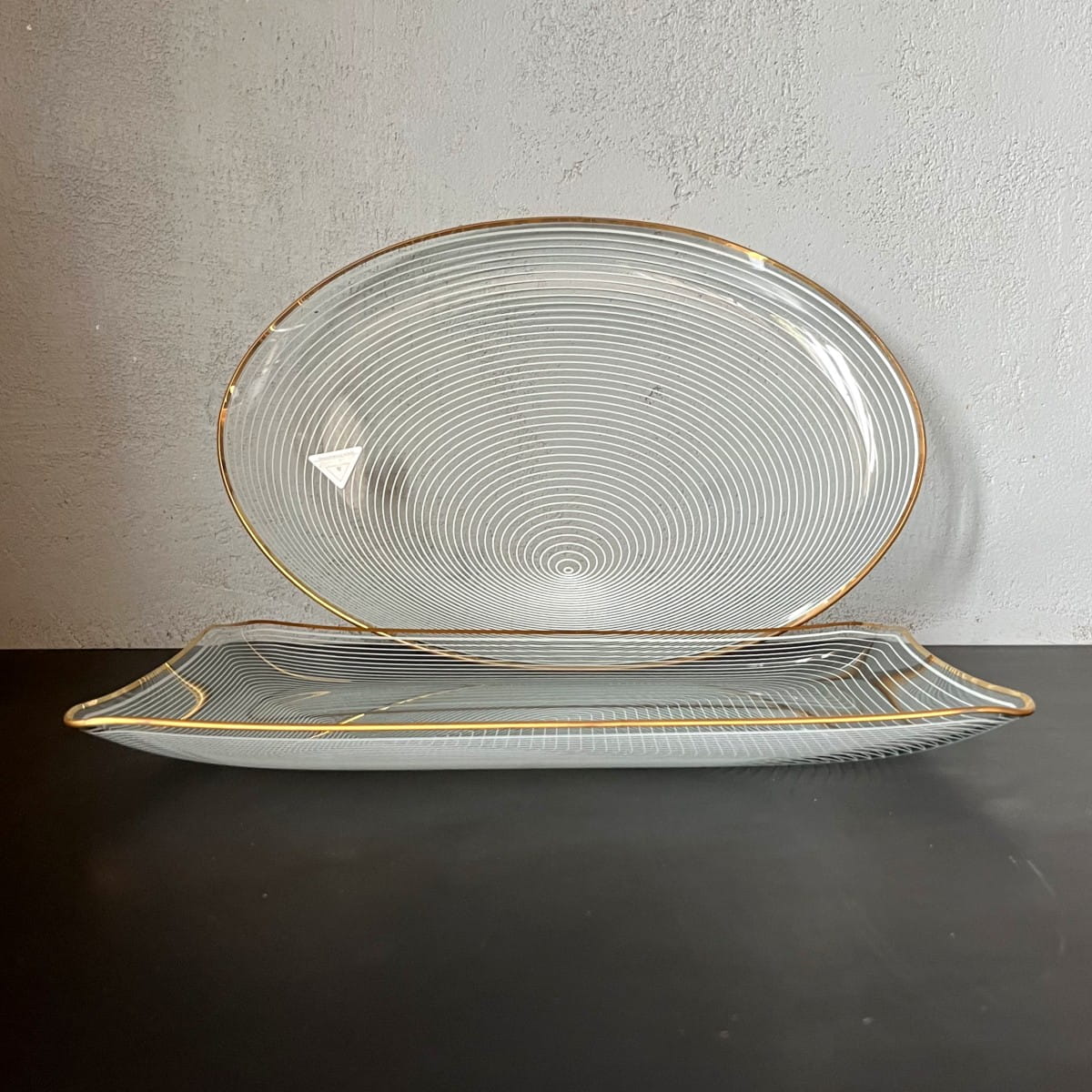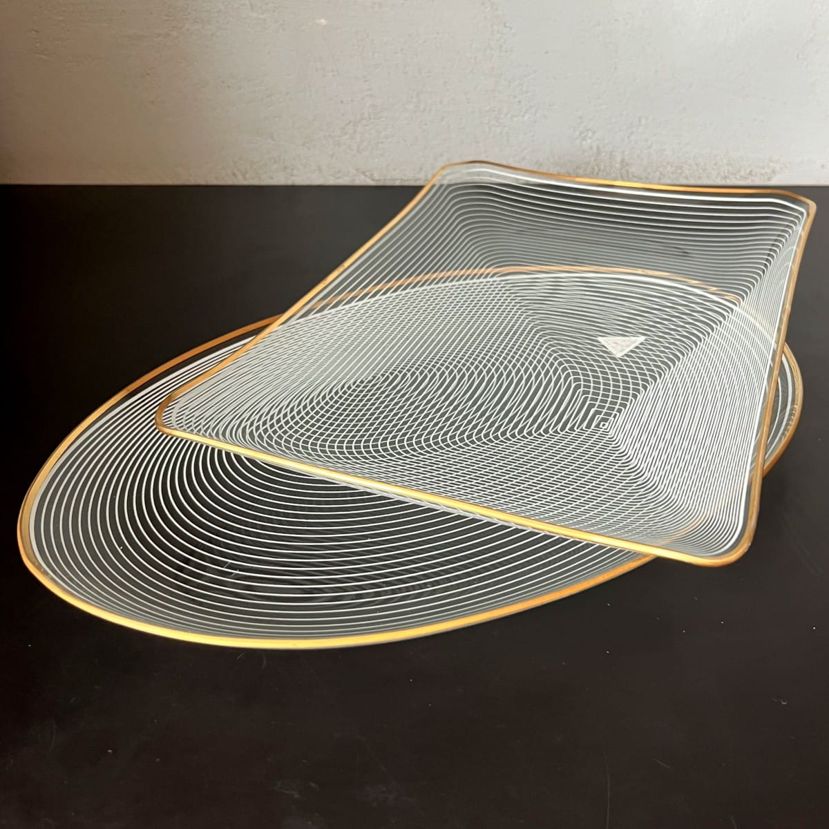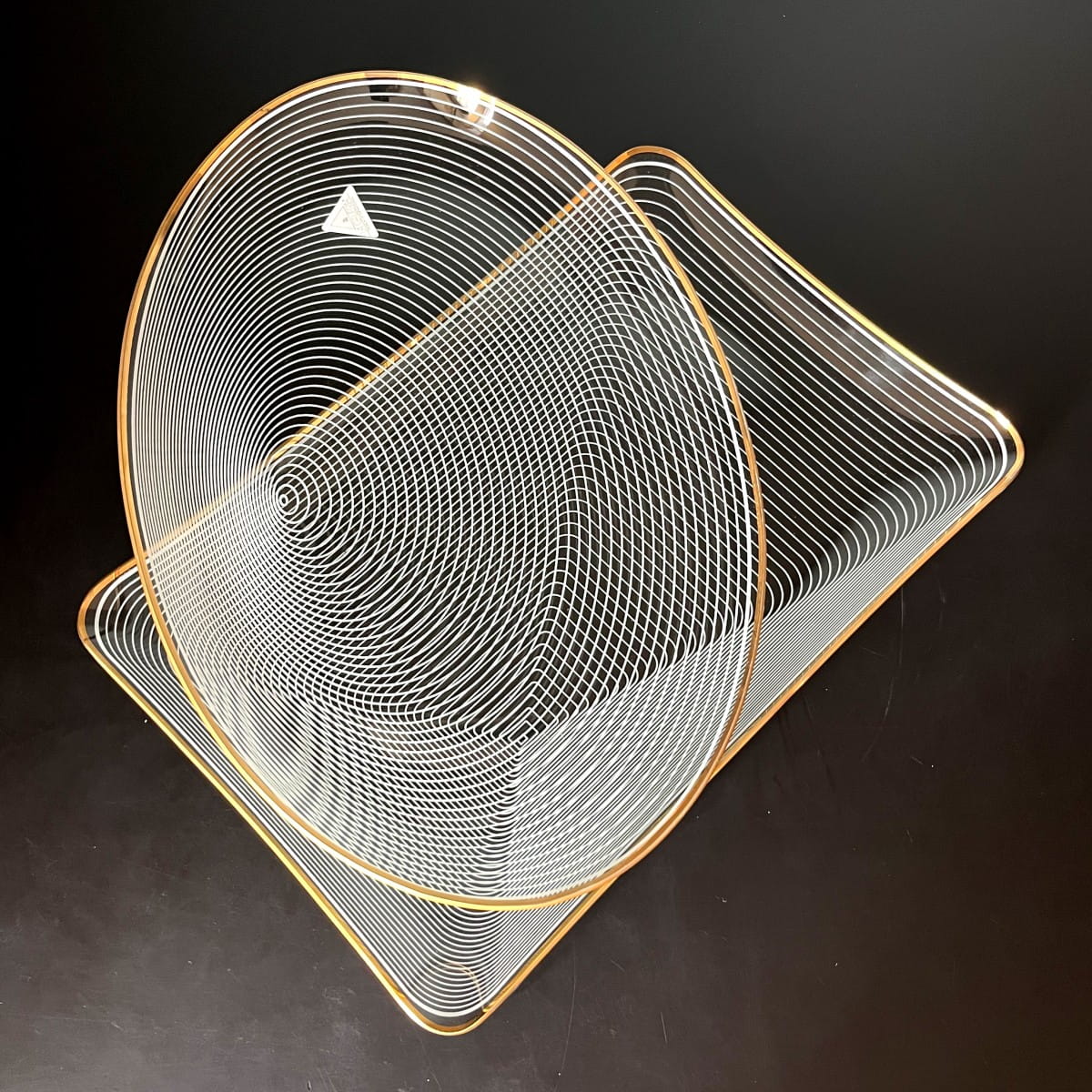Para pięknych szklanych talerzy do serwowania pochodzących z lat 70. niemieckiej firmy WMF. Talerze wykonane są z cienkiego i lekkiego szkła, posiadają zdobienie z białych lini tworzących układ współśrodkowych figur, natomiast krawędzie talerzy są złote. Białe linie są rozmieszczone w taki sposób, że na powierzchni talerzy powstaje trójwymiarowy rysunek. Minimalistyczny, ale bardzo efektowny wzór. Piękna prosta forma.