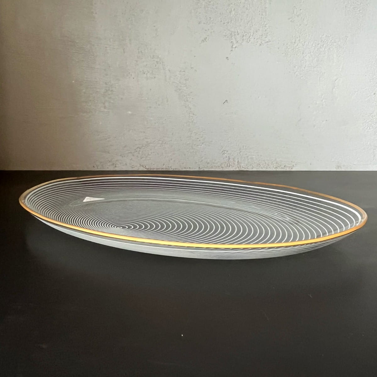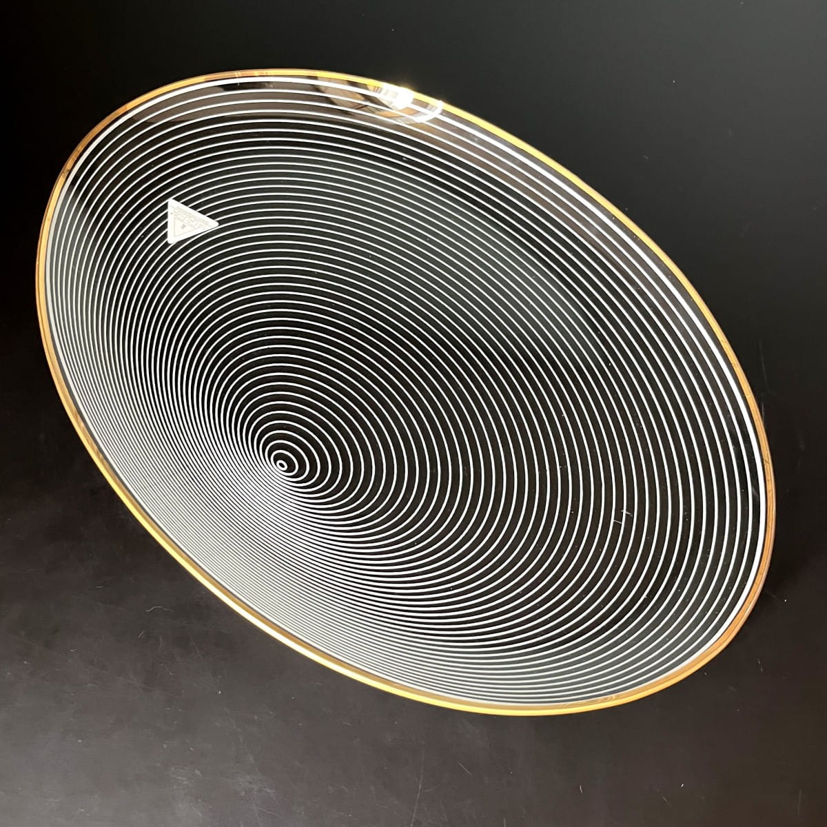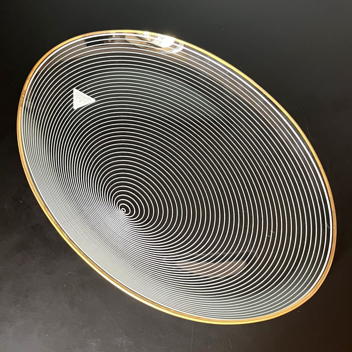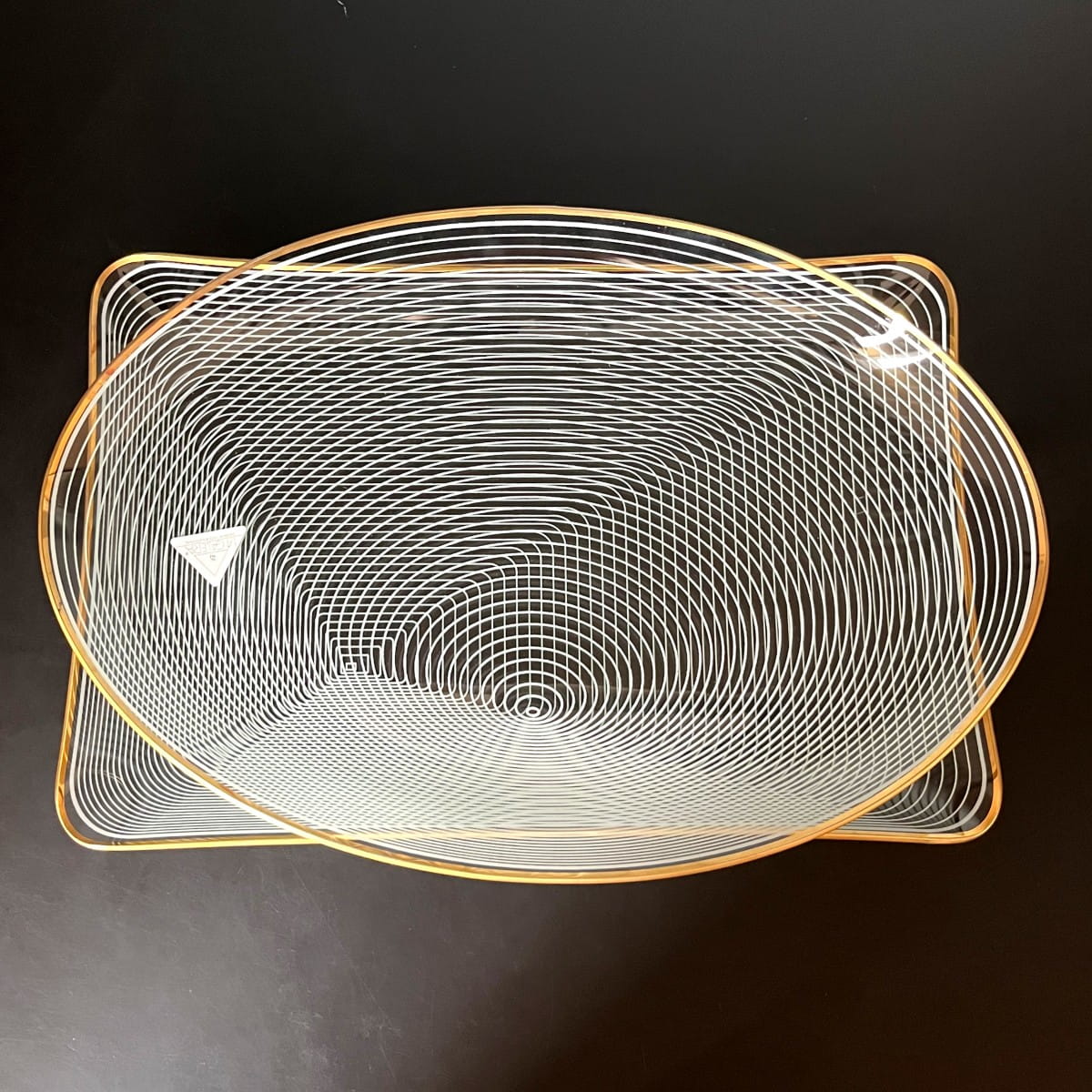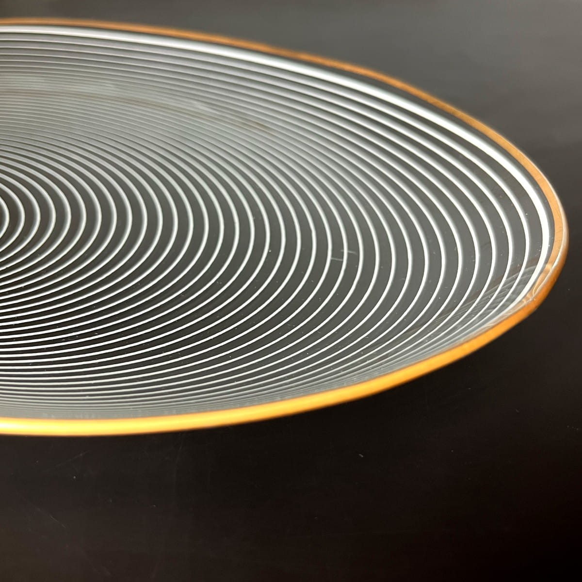 Para pięknych szklanych talerzy do serwowania pochodzących z lat 70. niemieckiej firmy WMF. Talerze wykonane są z cienkiego i lekkiego szkła, posiadają zdobienie z białych lini tworzących układ współśrodkowych figur, natomiast krawędzie talerzy są złote. Białe linie są rozmieszczone w taki sposób, że na powierzchni talerzy powstaje trójwymiarowy rysunek. Minimalistyczny, ale bardzo efektowny wzór. Piękna prosta forma.