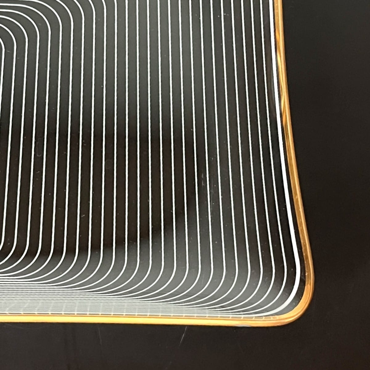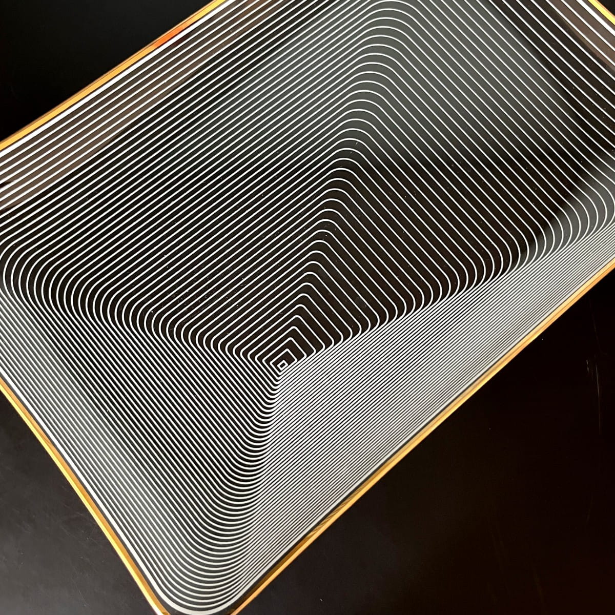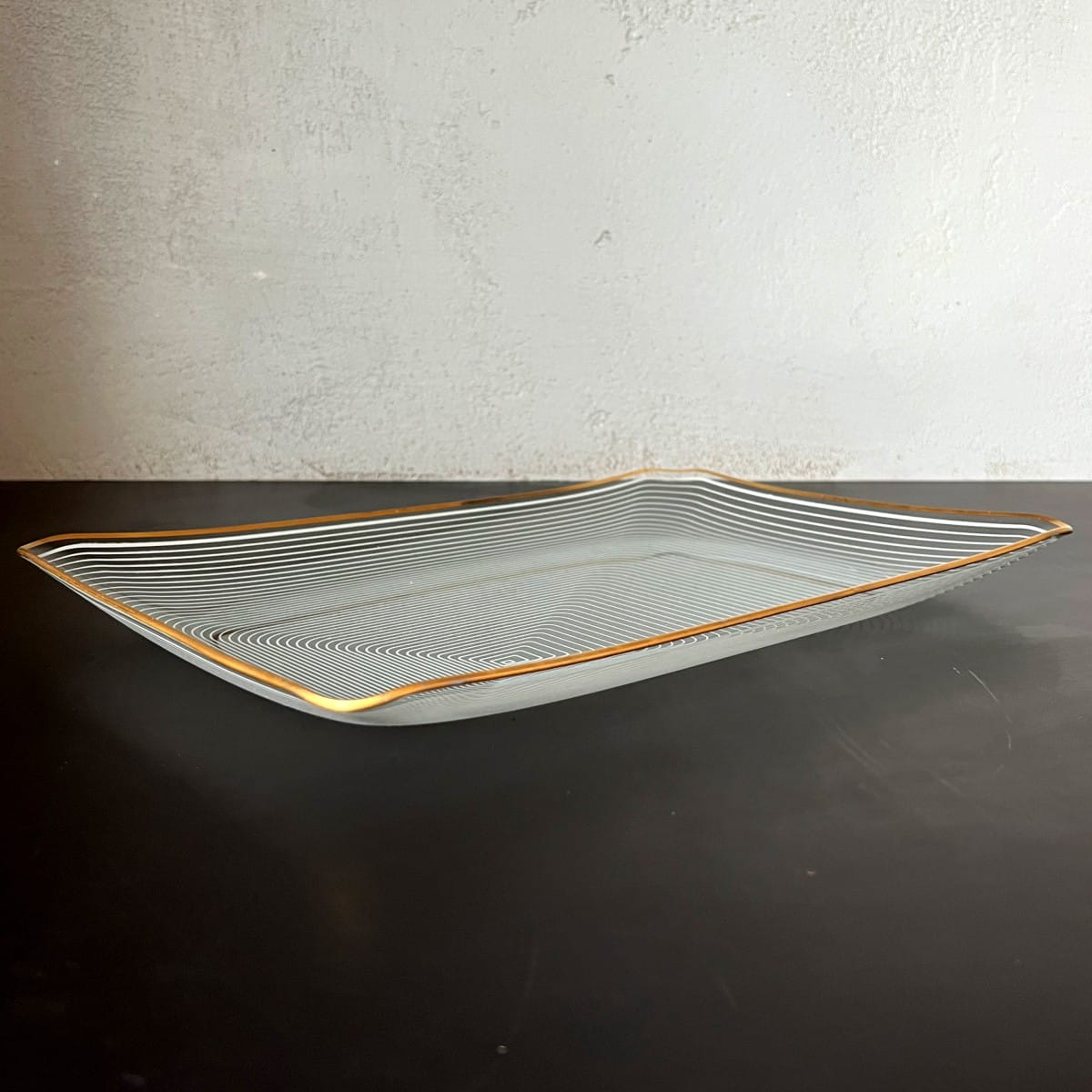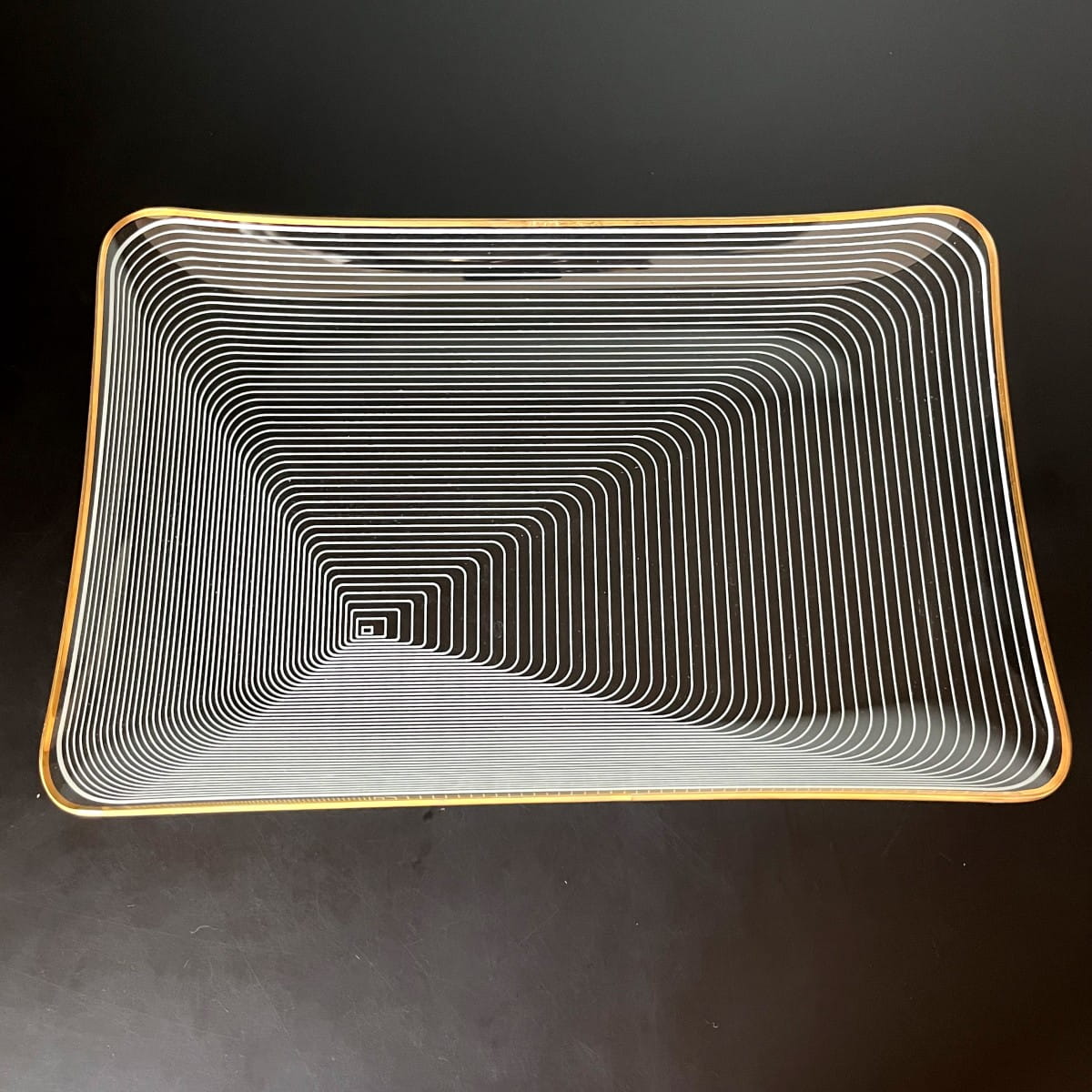 Para pięknych szklanych talerzy do serwowania pochodzących z lat 70. niemieckiej firmy WMF. Talerze wykonane są z cienkiego i lekkiego szkła, posiadają zdobienie z białych lini tworzących układ współśrodkowych figur, natomiast krawędzie talerzy są złote. Białe linie są rozmieszczone w taki sposób, że na powierzchni talerzy powstaje trójwymiarowy rysunek. Minimalistyczny, ale bardzo efektowny wzór. Piękna prosta forma.