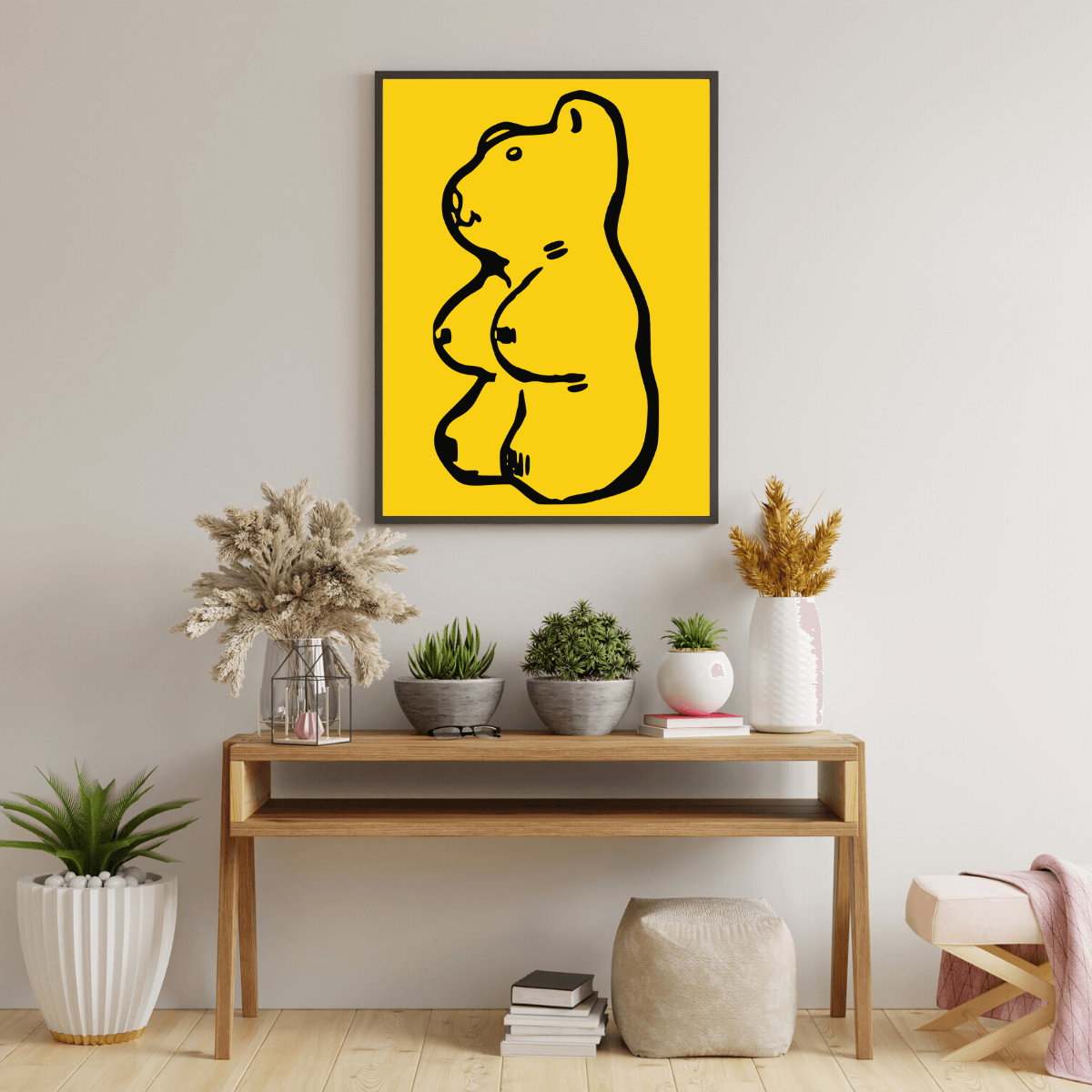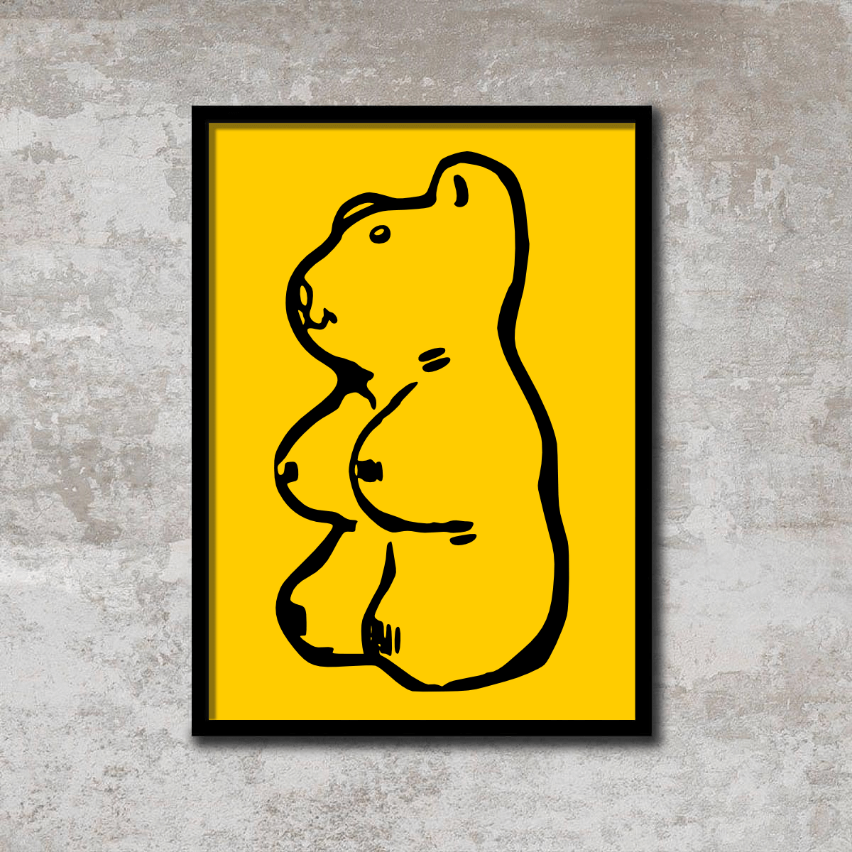Plakat przedstawia kontur misia zrealizowany w stylu pieczątki koloru czarnego na żółtym tle. Wizerunek misia jest artystyczną interpretacją bardzo popularnej w latach osiemdziesiątych lampki miś. Rysunek ten stworzony przez architekta Piotra zawsze był nieformalnym symbolem naszej firmy.