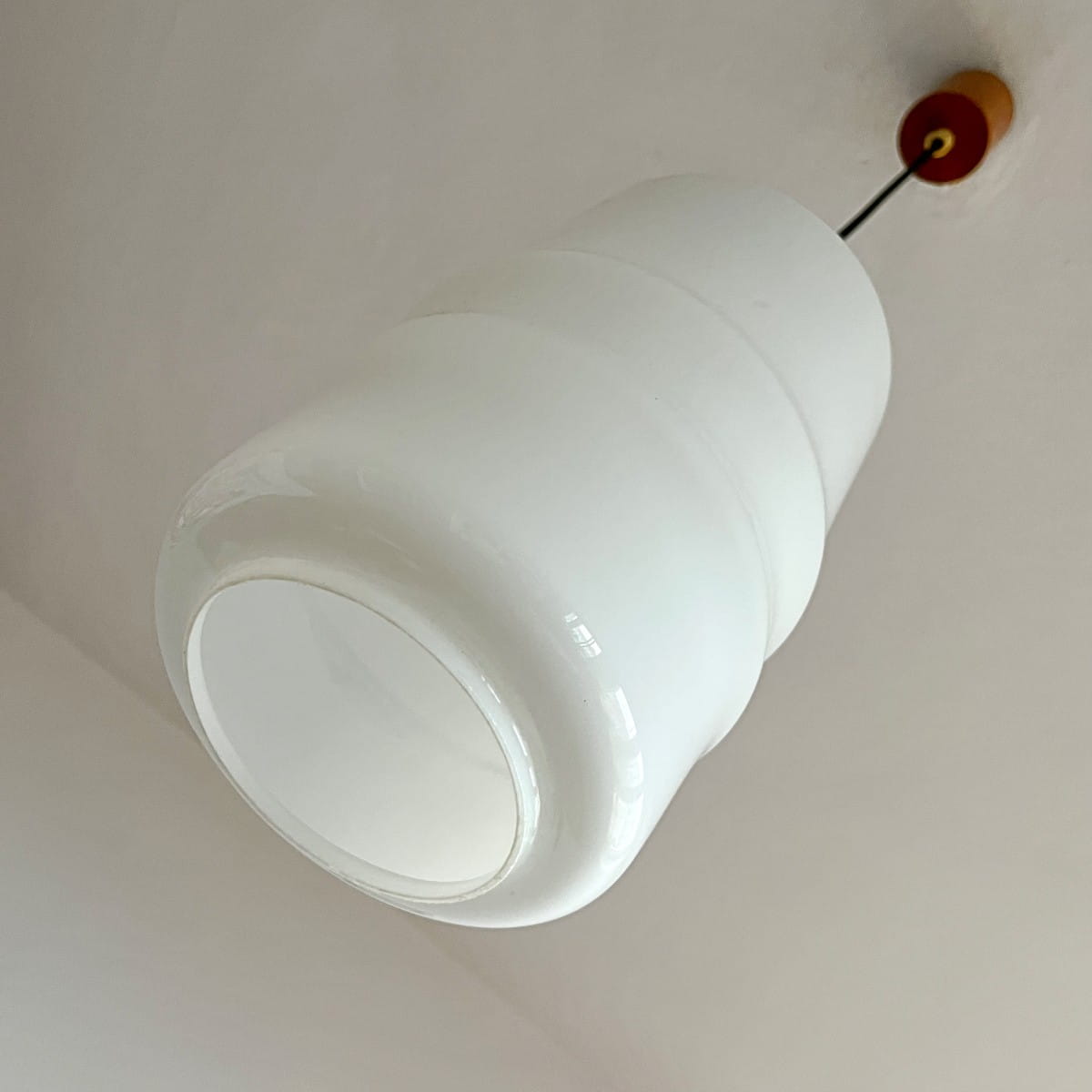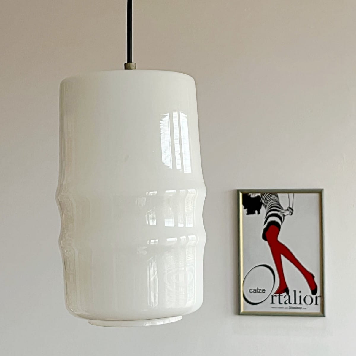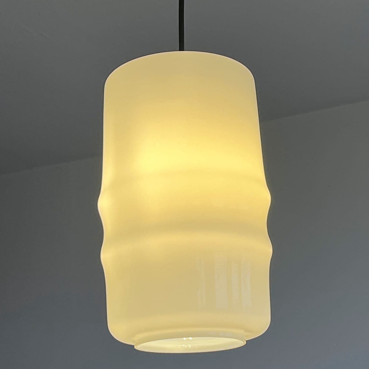 Czechosłowacka lampa sufitowa ze smukłym szklanym kloszem. Wyprodukowana prawdopodobnie w latach 60/70. minionego stulecia. Lampa o ładnych proporcjach i ciekawej bryle. Szklany mlecznobiały klosz w kształcie walca z wklęsłym dzieleniem poziomym doskonale rozprasza światło. Podsufitka drewniana.
