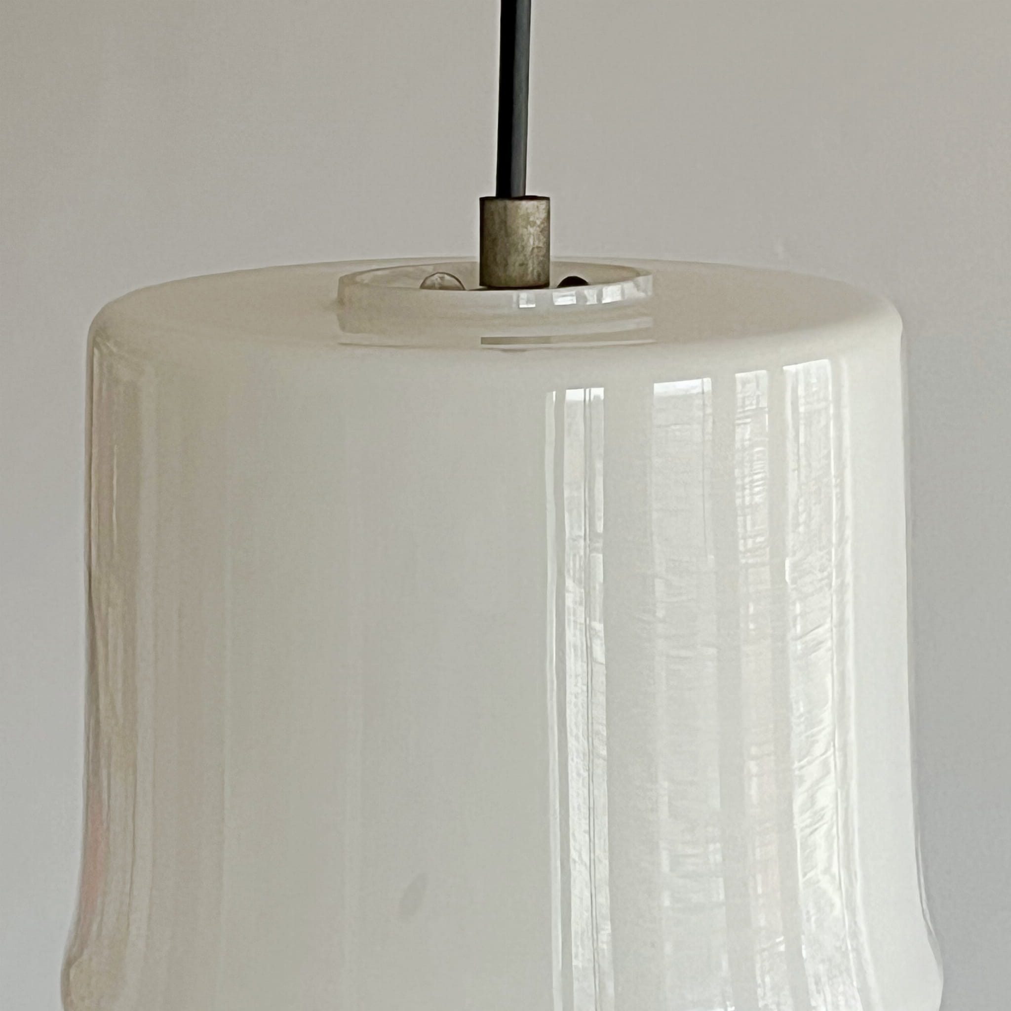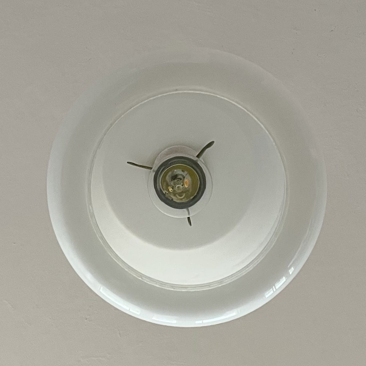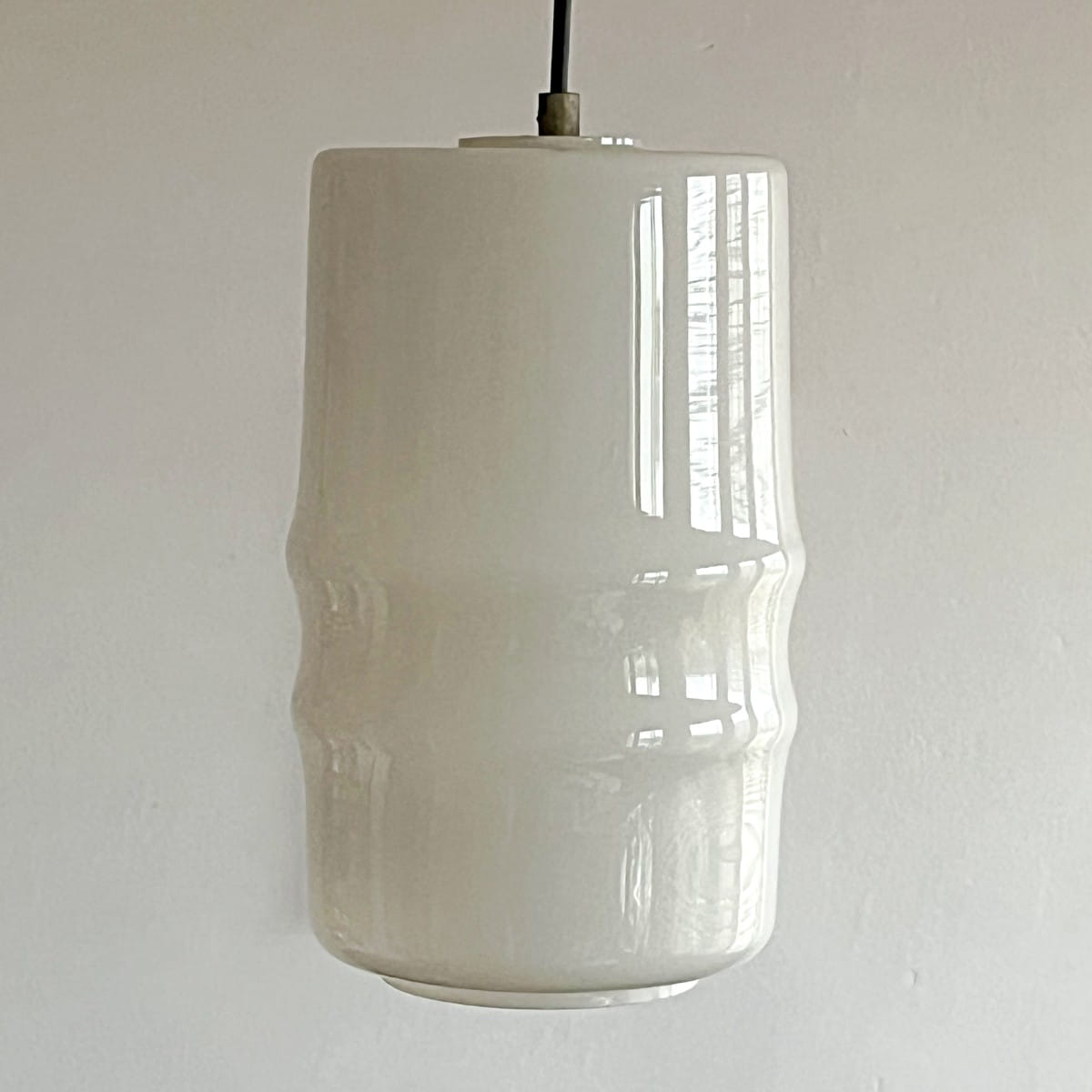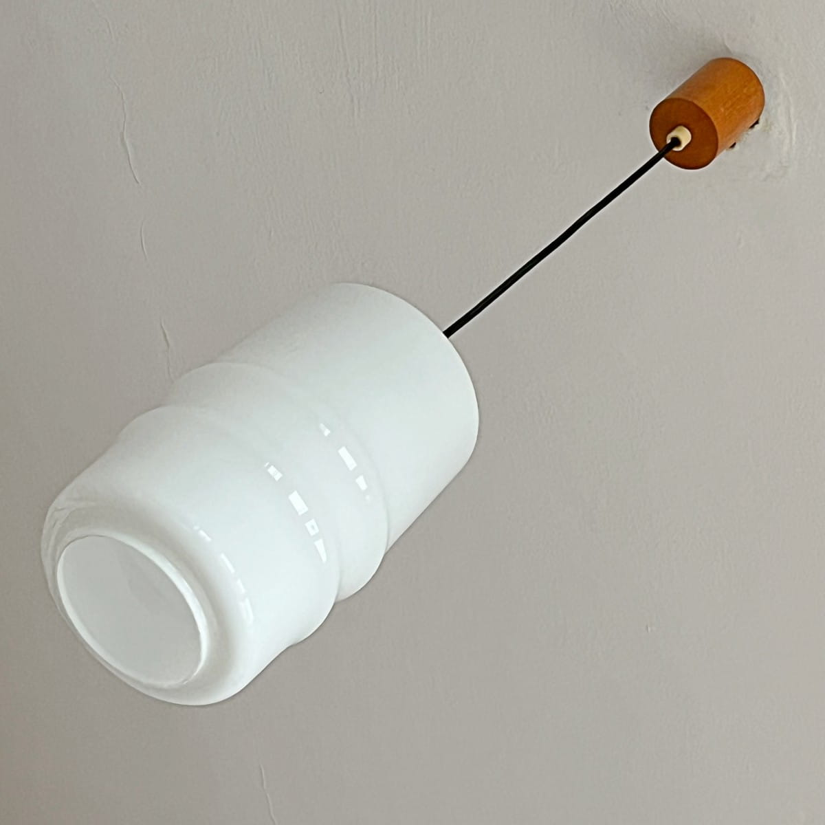 Czechosłowacka lampa sufitowa ze smukłym szklanym kloszem. Wyprodukowana prawdopodobnie w latach 60/70. minionego stulecia. Lampa o ładnych proporcjach i ciekawej bryle. Szklany mlecznobiały klosz w kształcie walca z wklęsłym dzieleniem poziomym doskonale rozprasza światło. Podsufitka drewniana.