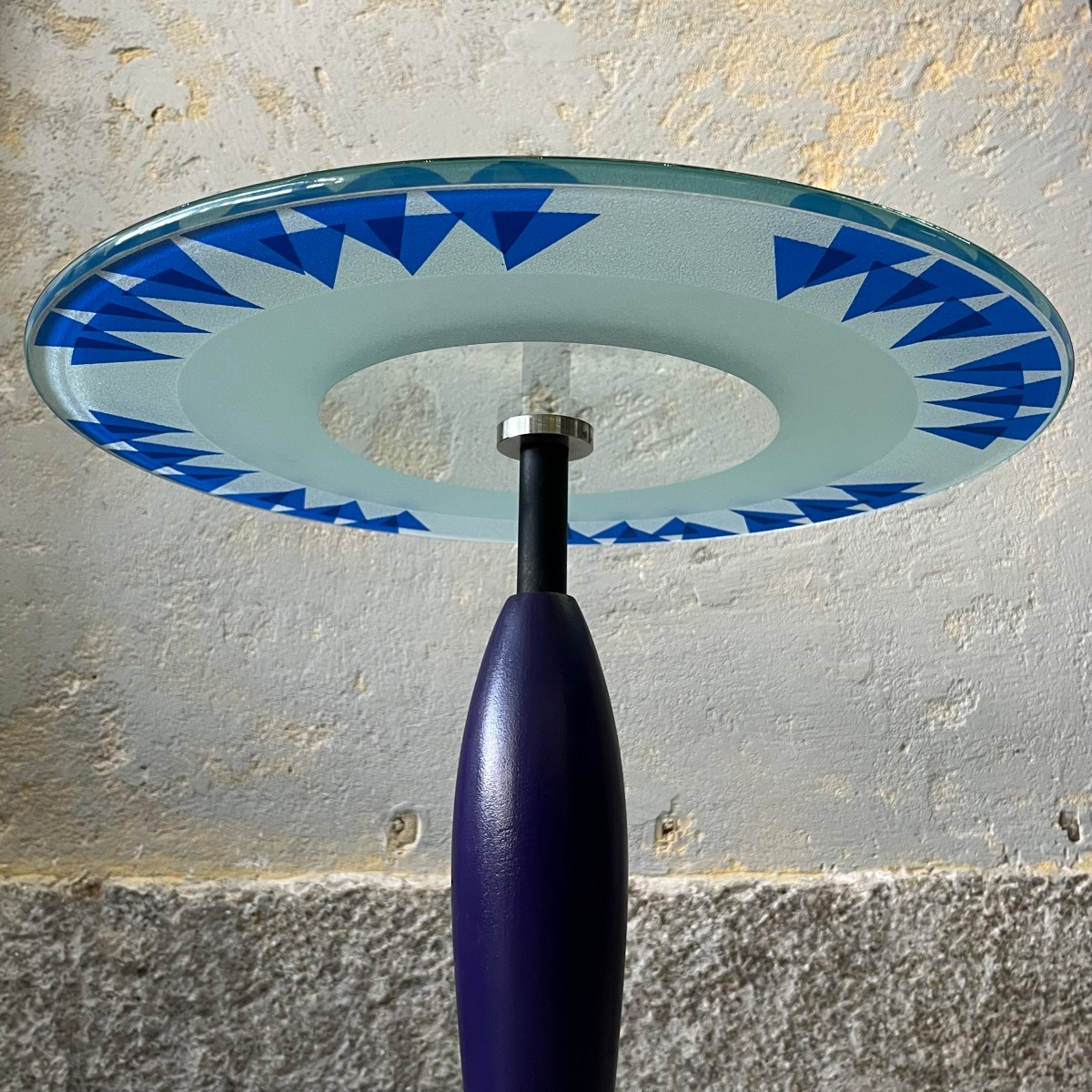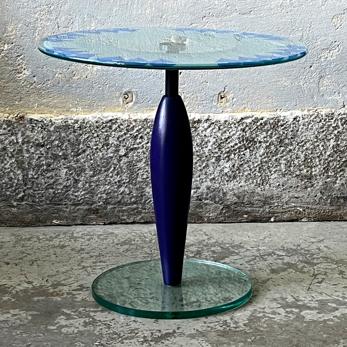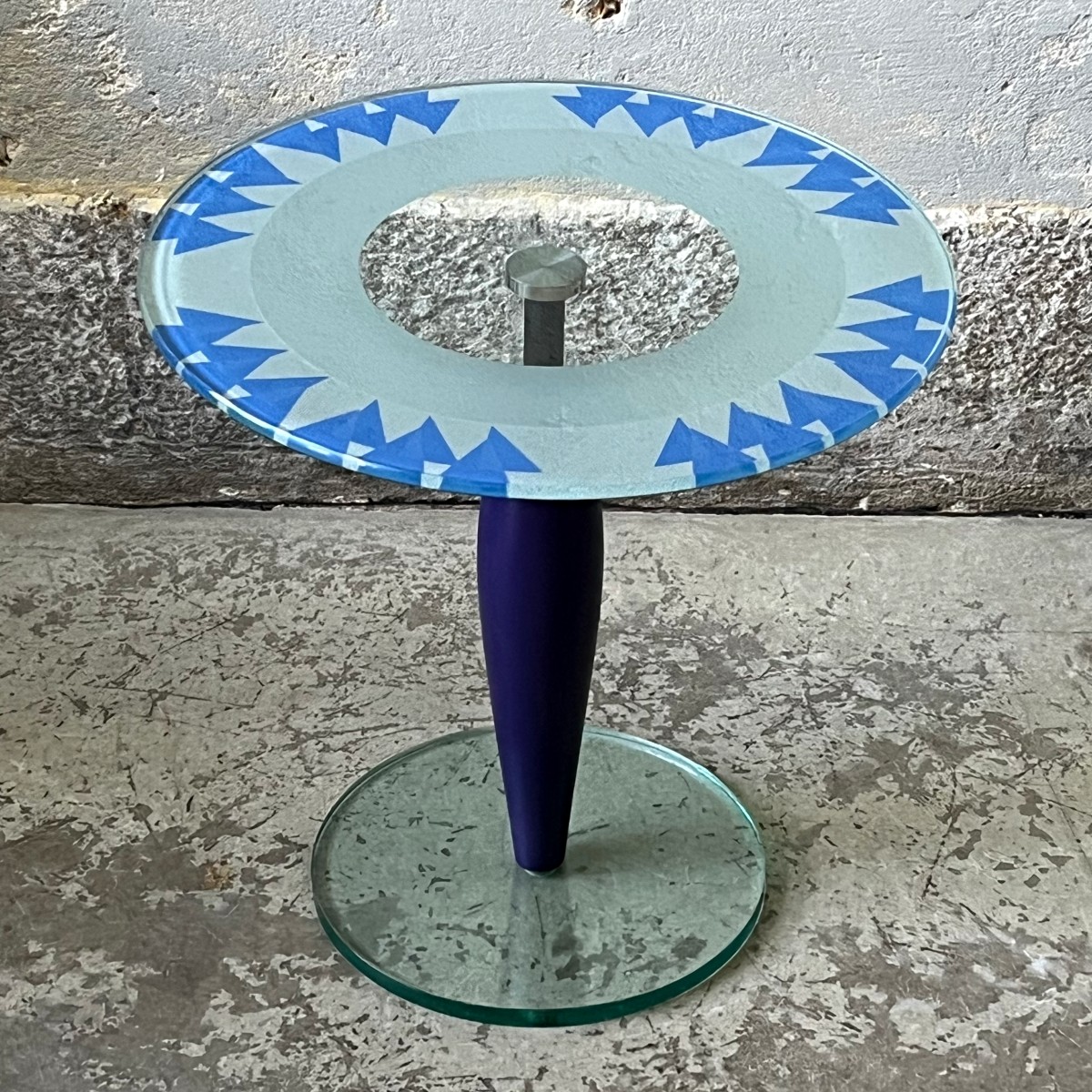 Idea tego stolika opiera się na interesującym zestawieniu różnych brył. Główny blat wykonano z grubego, zmatowionego częściowo szkła z gładkim środkiem, przez który widać podstawę stolika. Dolną powierzchnię blatu zdobią dwa pierścienie o innej strukturze zmatowienia szkła. Dodatkowo krawędź blatu ozdobiono geometrycznym wzorem z błękitnych ostrych, wyraźnych trójkątów. Podstawę stołu stanowi masywna, fioletowo-kobaltowa noga z drewna w kształcie odwróconej, smukłej kropli. Całość spoczywa na grubej, stabilnej bazie z przezroczystego szkła. Poszczególne segmenty połączono za pomocą surowych elementów ze stali.