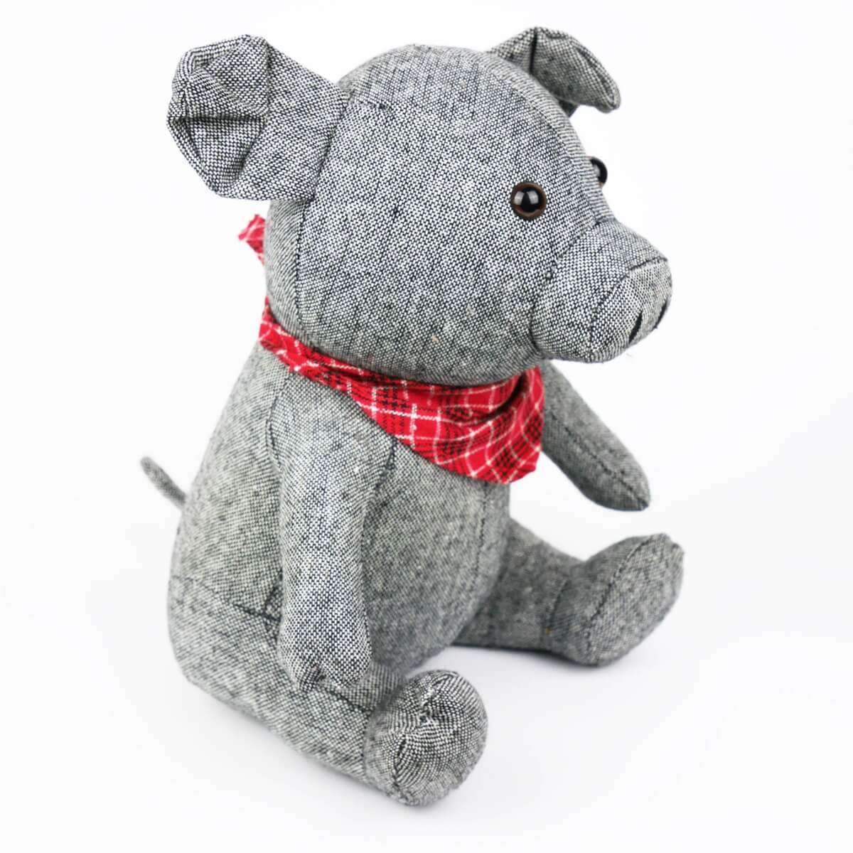 Na szyi świnka ma zawiązaną chustkę w modną czerwoną kratkę.