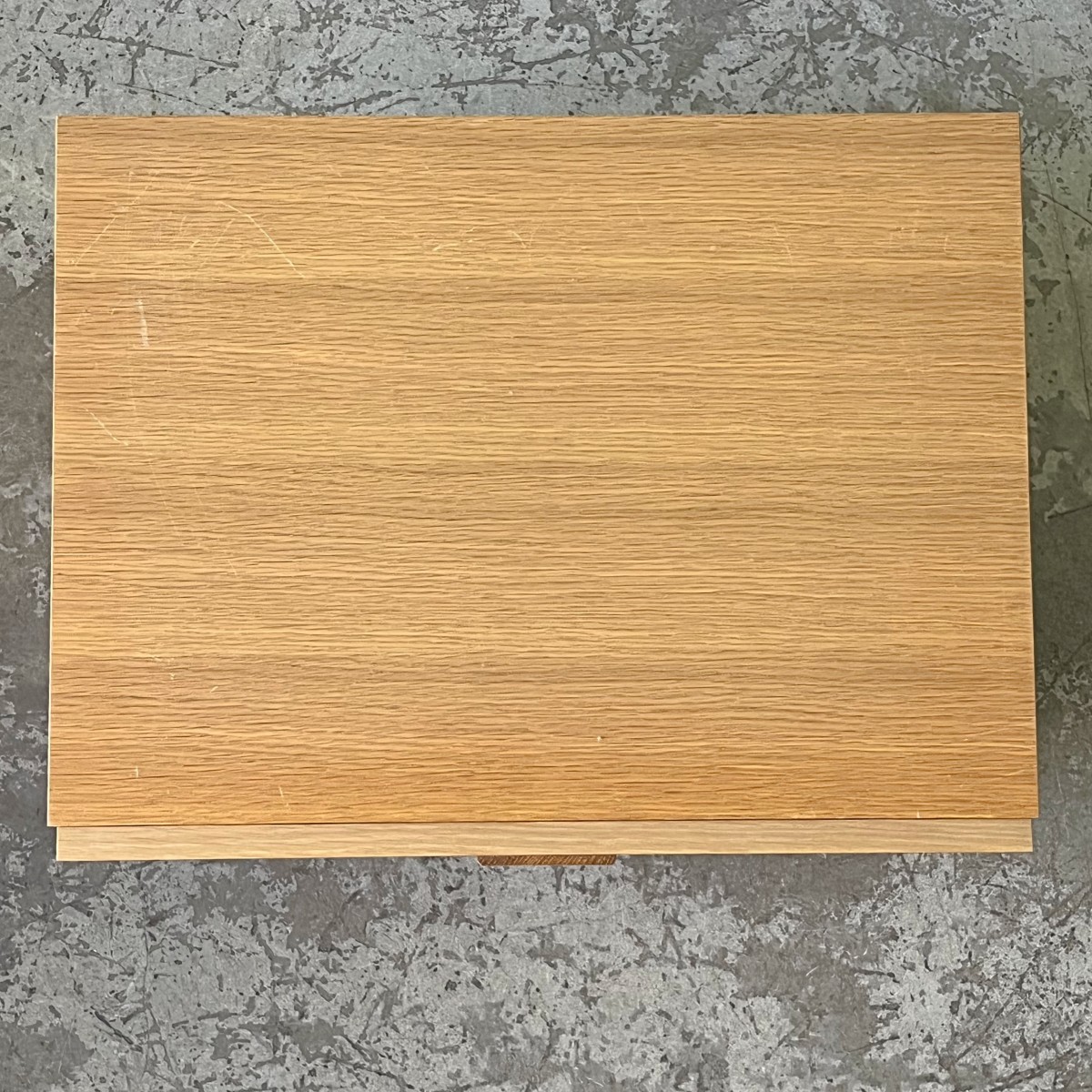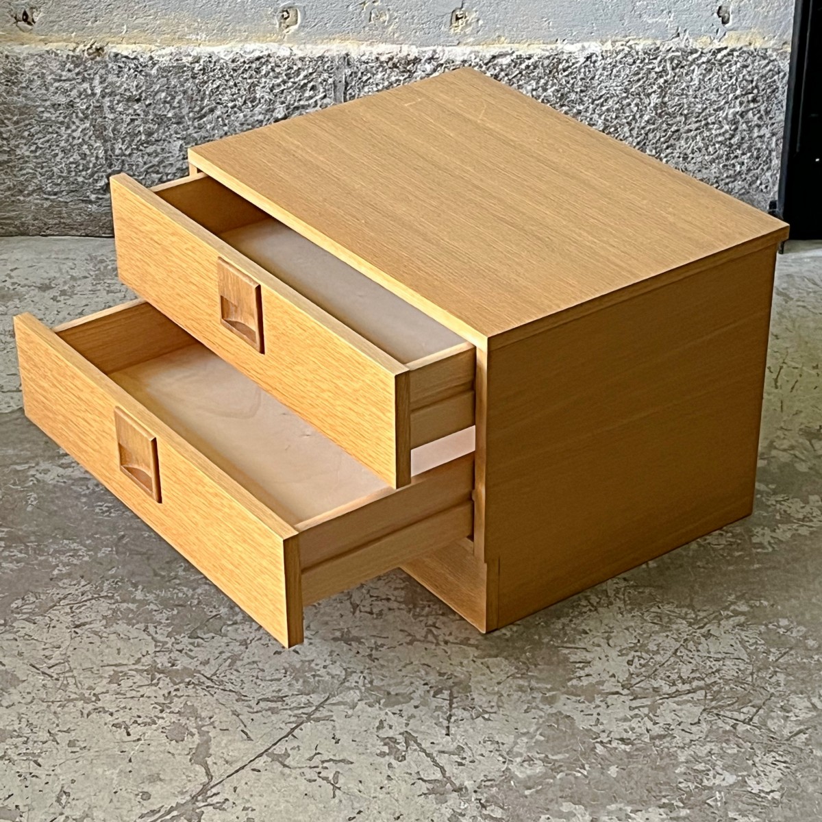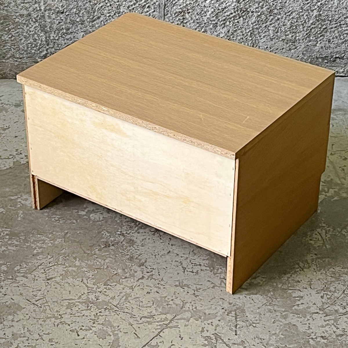Szafka nocna, nakastlik wyprodukowany w latach 80. minionego stulecia. Szafka o niezwykle prostej formie i niewielkich gabarytach, w ciepłej kolorystyce jasnego drewna. Wykonana z fornirowanej płyty meblowej w kolorze dębu. Stolik posiada dwie pojemne szuflady.