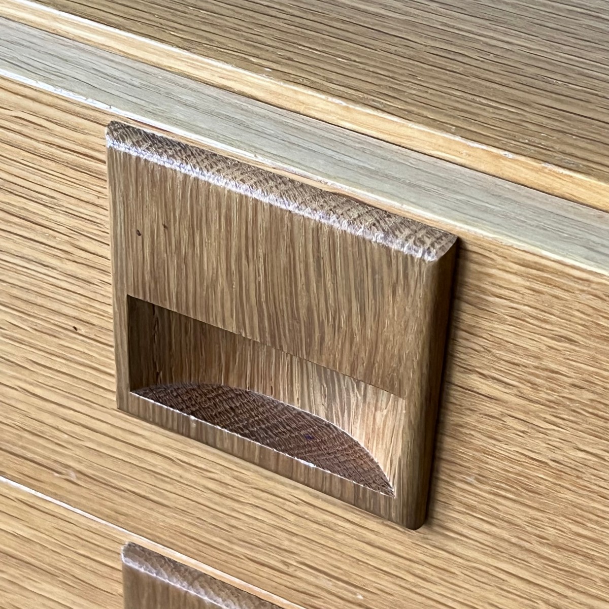 Szuflady wyposażone są w kwadratowe, rzeźbione uchwytu z drewna, które są jedyną ozdobą tego funkcjonalnego mebla, prostym ale znaczącym dodatkiem.