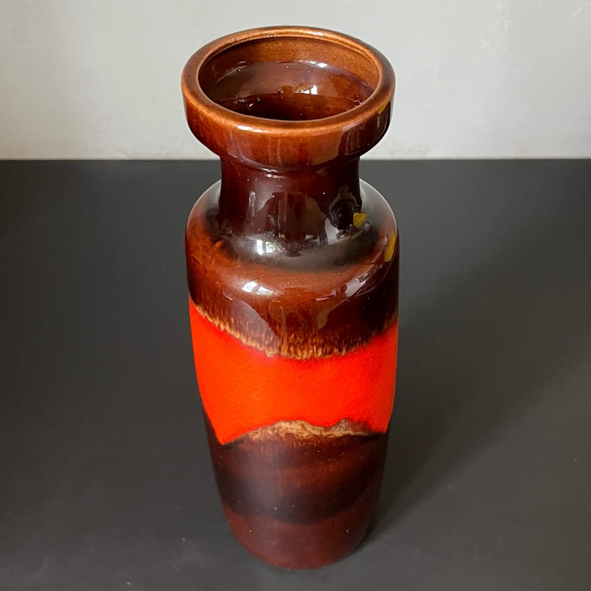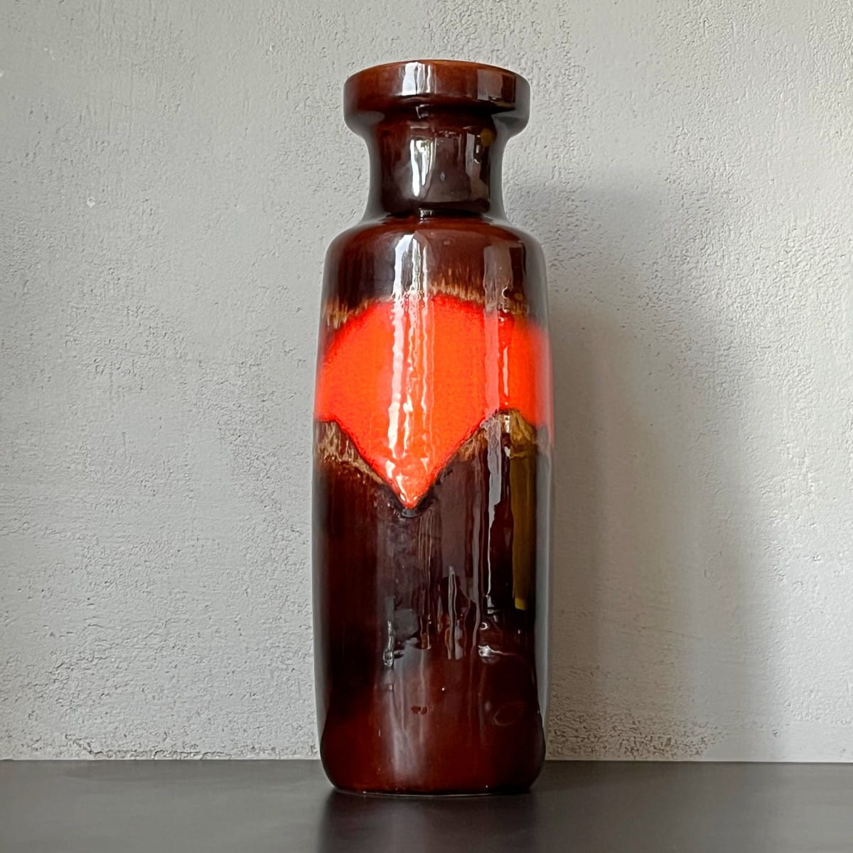 Wazon ma ciekawą minimalistyczną formę. Utrzymany jest w tonacji brązowo-pomarańczowej. Pokryty jest gładkim, lśniącym, miejscami wypukłym szkliwieniem typu Fat Lava. Wnętrze jednolite w kolorze ciemnobrązowym.